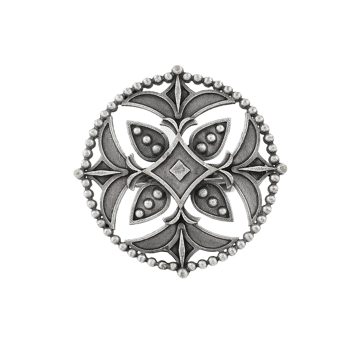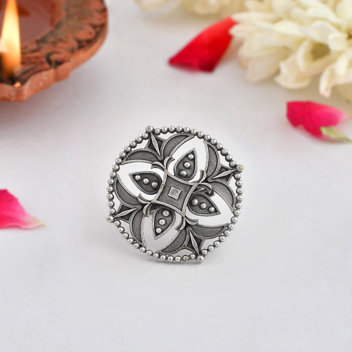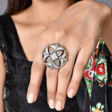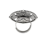 Cutwork design statement ring, inspired by the elements and essence of the Indian festival of Navratri. Made from brass and silver oxidized plated. The ring can be paired with a wide range of looks and outfits.