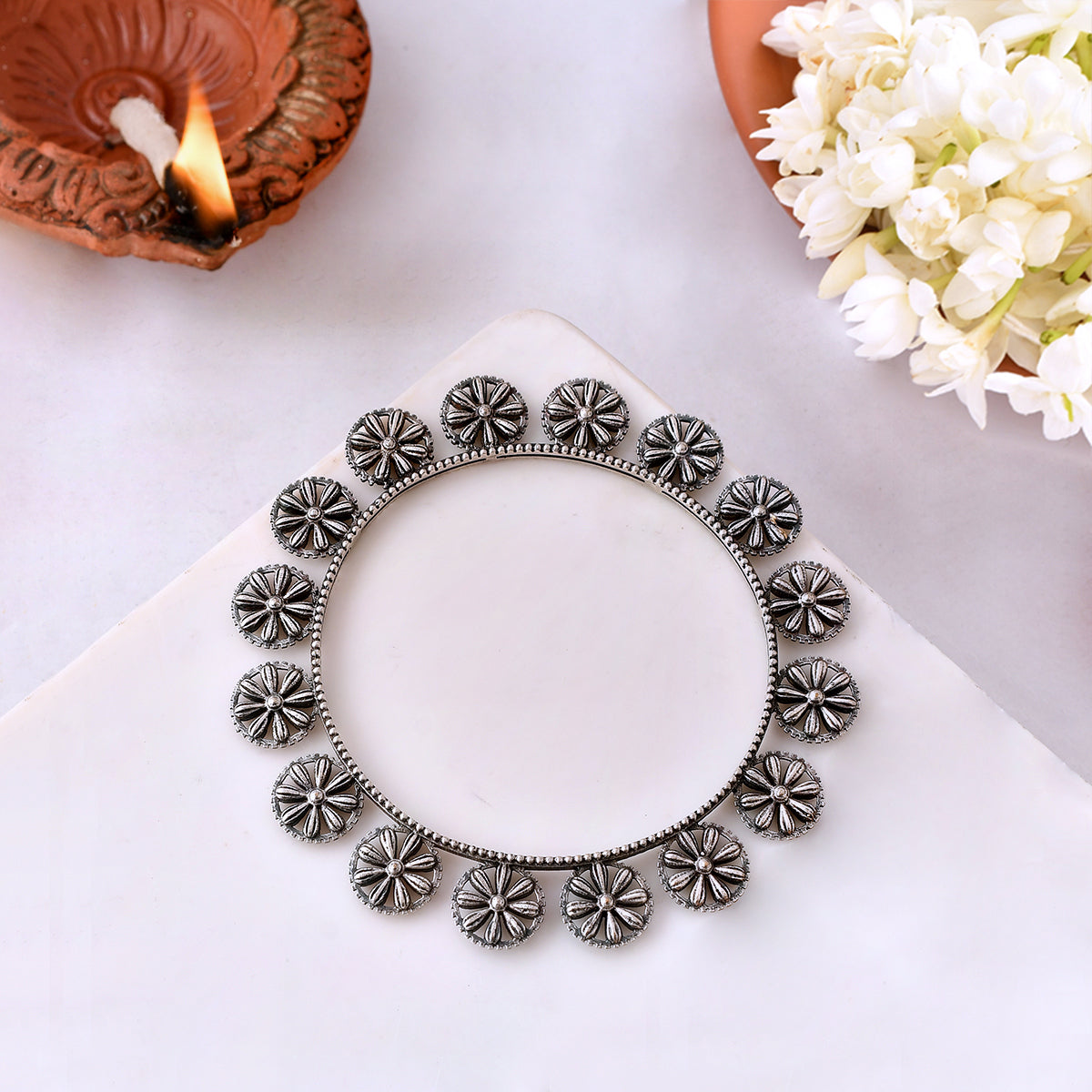 Bangle style ethnic design bracelet, inspired by beautiful banjara designs and elements of the garba dance. Made from brass and silver oxidized plated, the bracelet features floral motifs. Pair with Indian attire.
