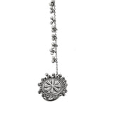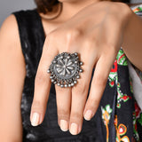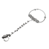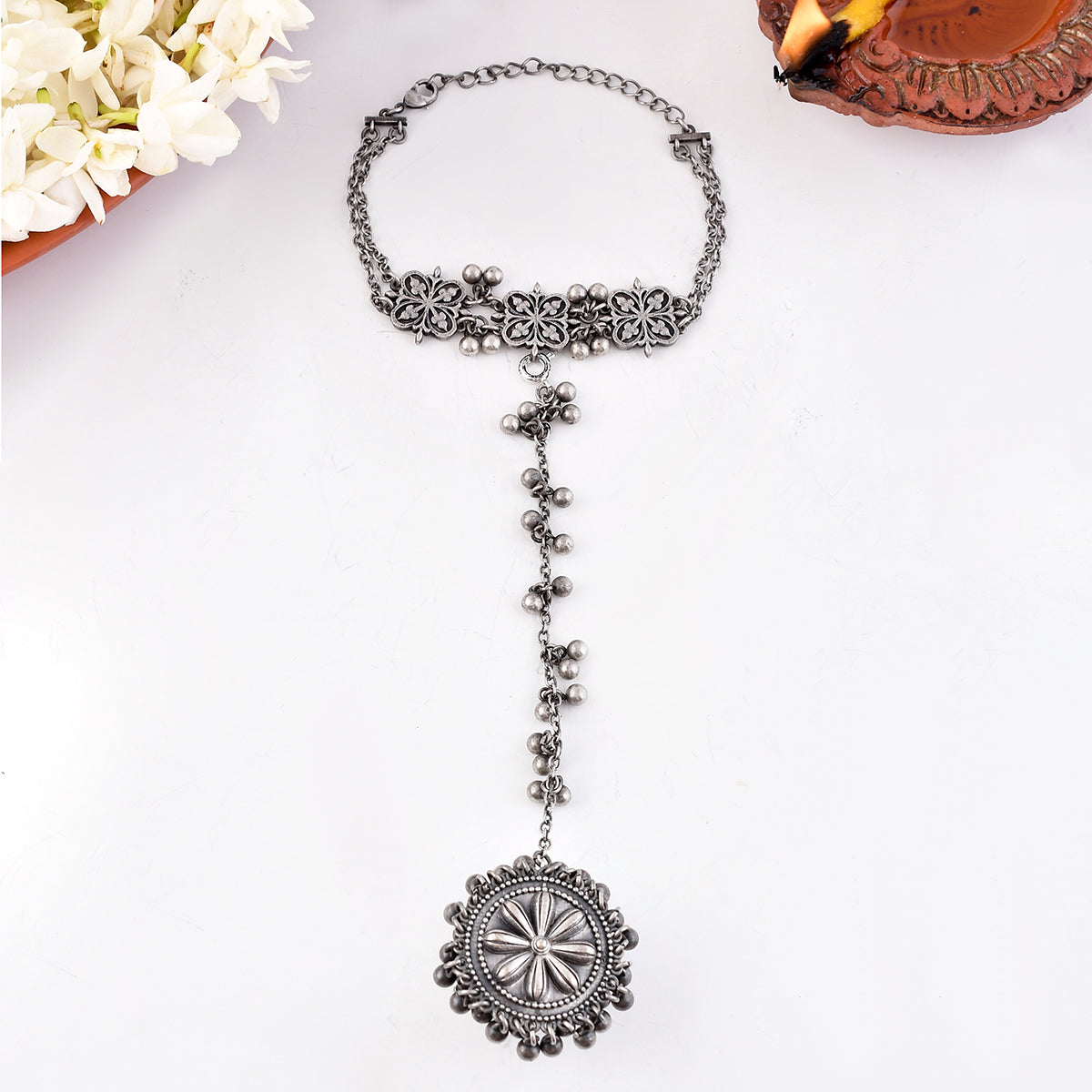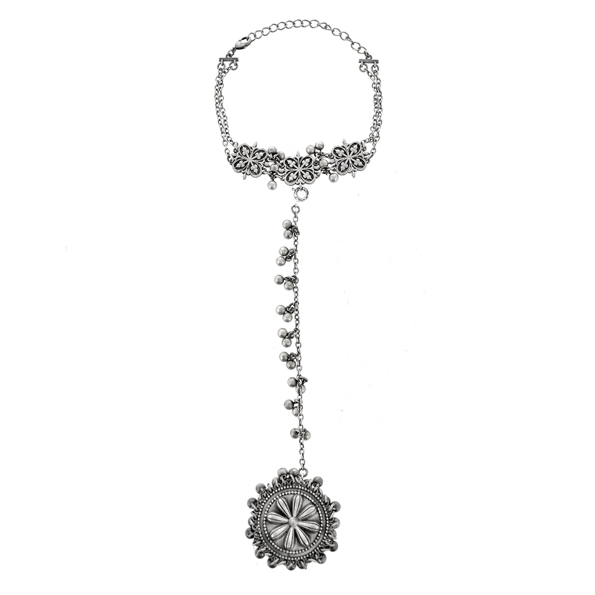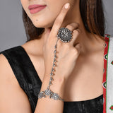 Large floral motif embossed statement hath phool, inspired by traditional banjara designs. Made from brass and oxidized silver plated, the tastefully embellished hath phool can be worn as Bracelet or Ring as well with Indian and Indo-Western attire.