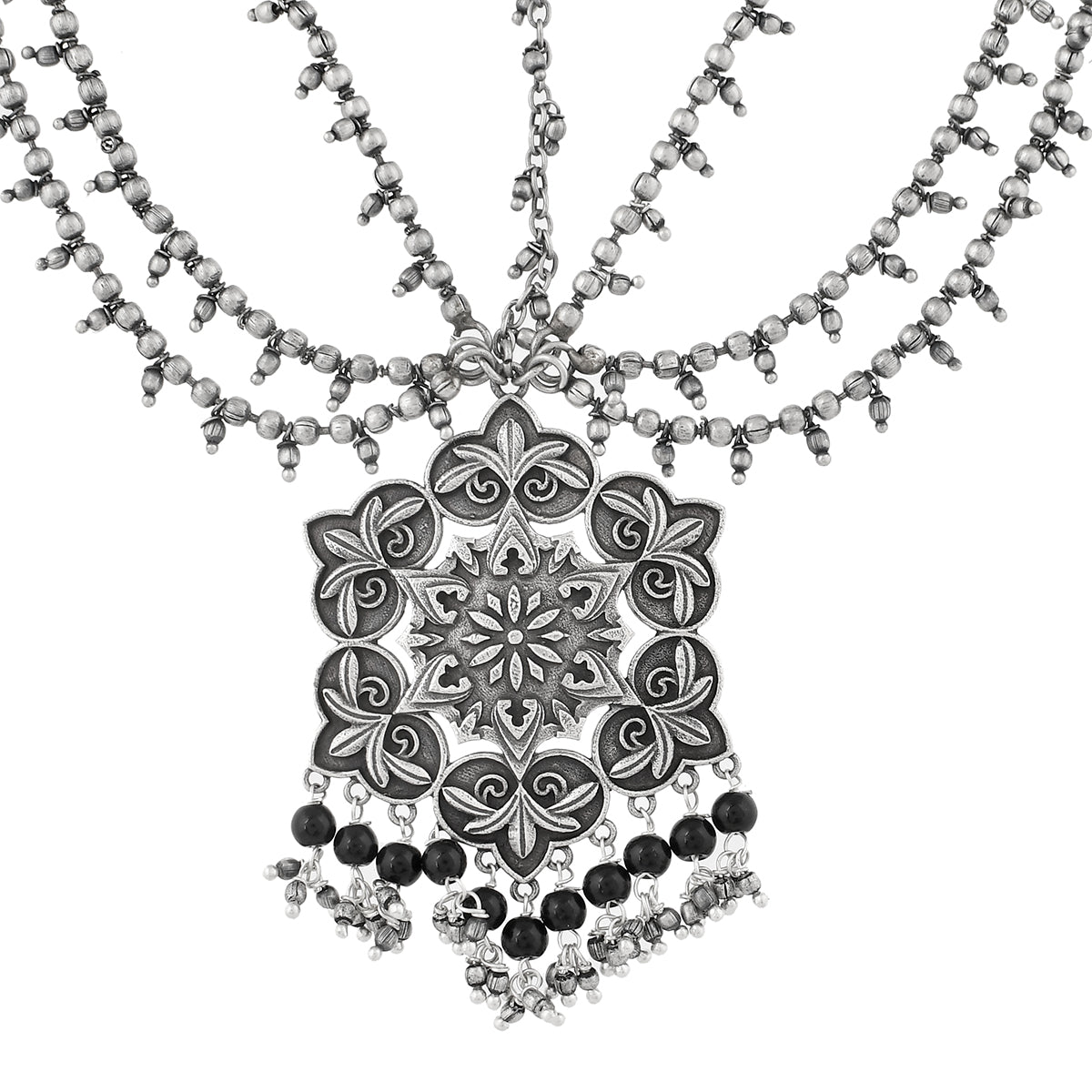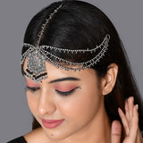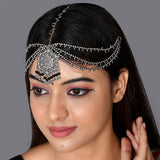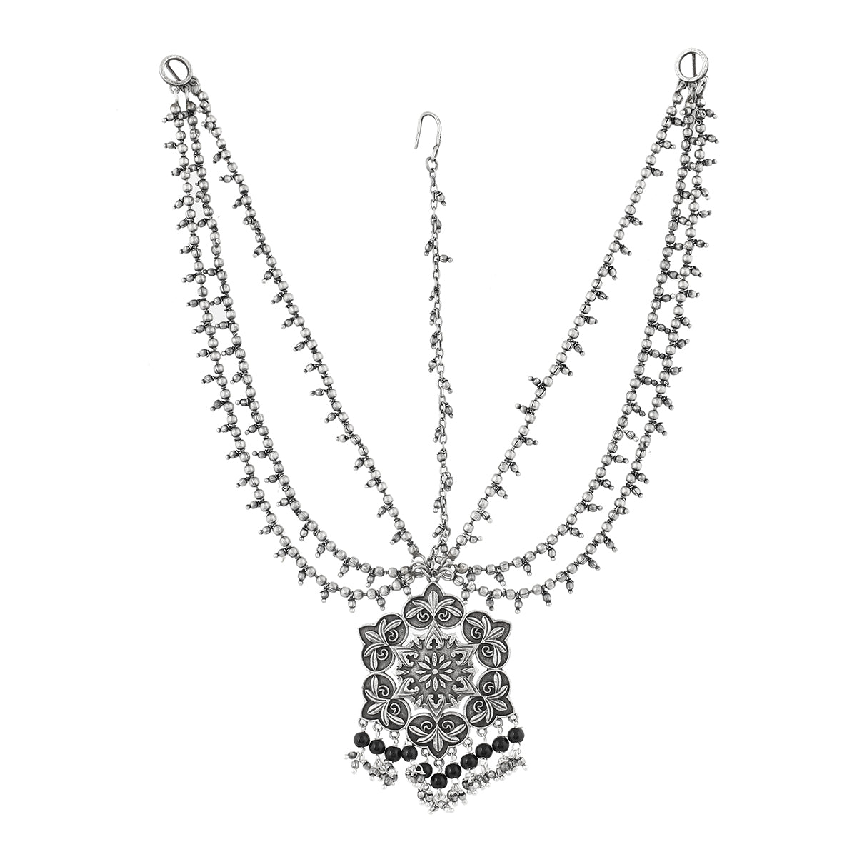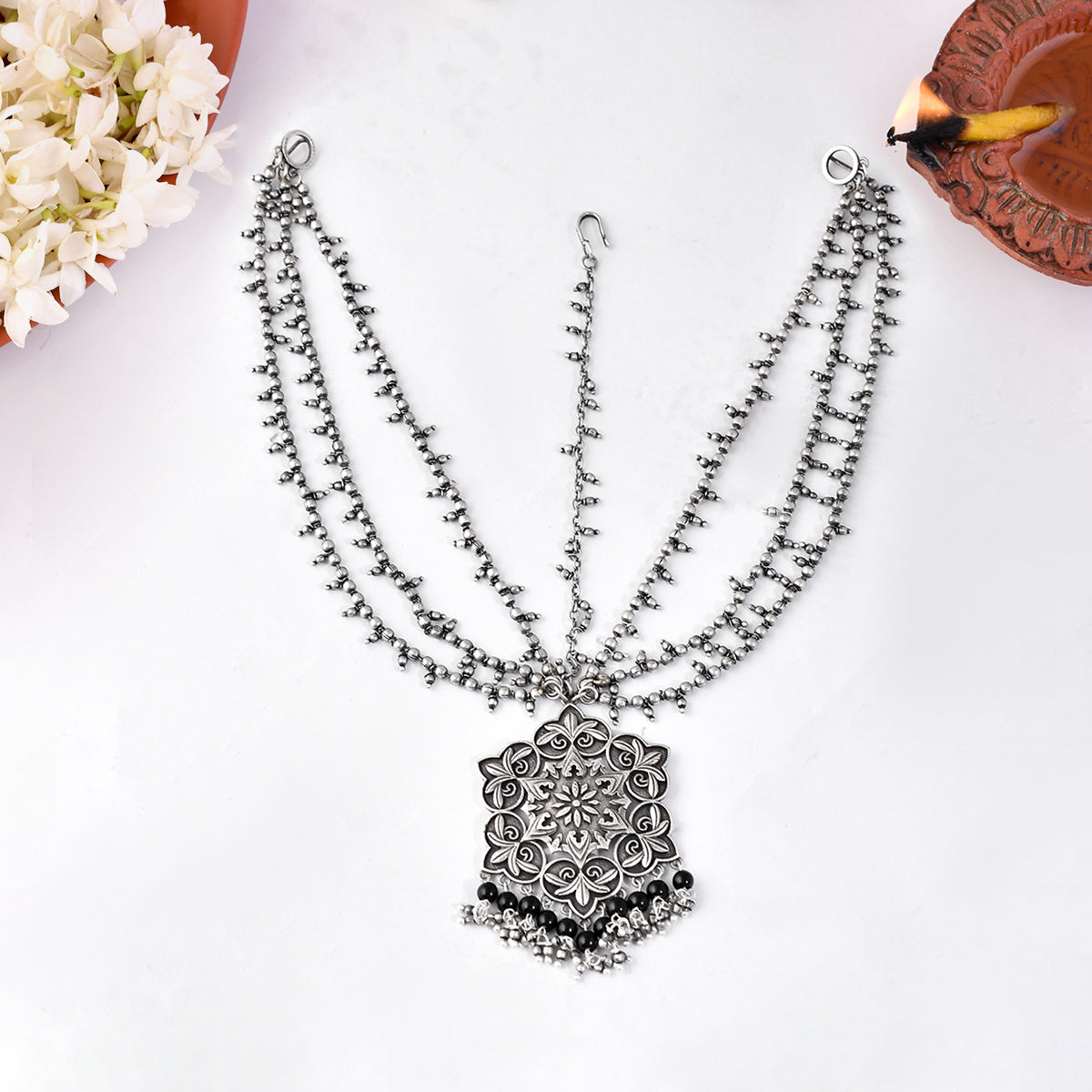 Inspired by old-school banjara designs, this heavy look statement maang tika has been fashioned out of brass and silver oxidized plated. Featuring metal embellishments, the versatile piece promises to be a comfortable wear at all times.