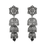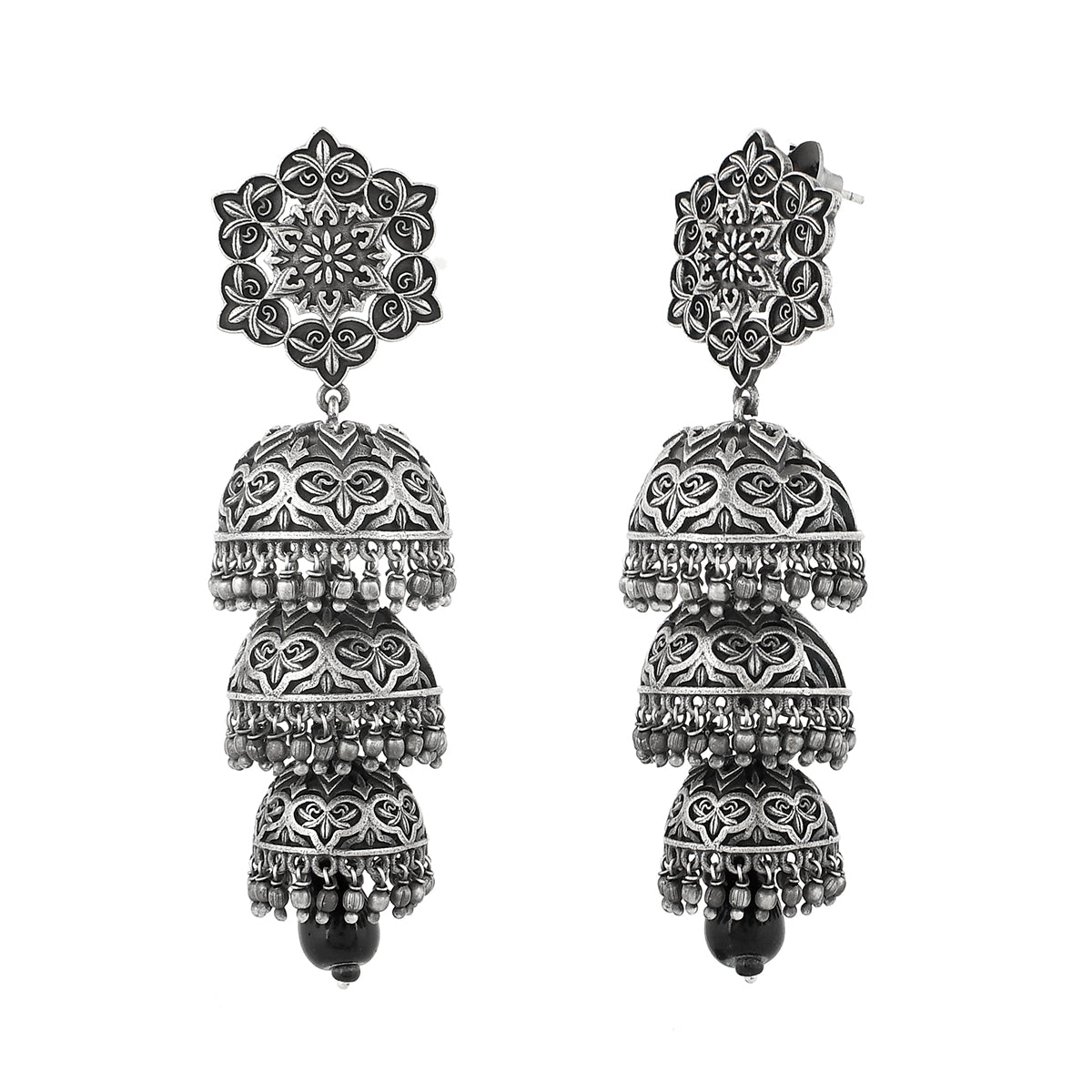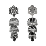Inspired by the Indian festival of Navratri and its many elements, these ethnic layered jhumka earrings have been fashioned out of brass. Silver oxidized plated and lightly embellished. Pair with Indian attire.