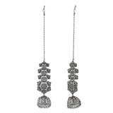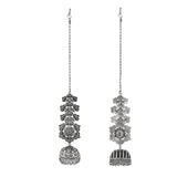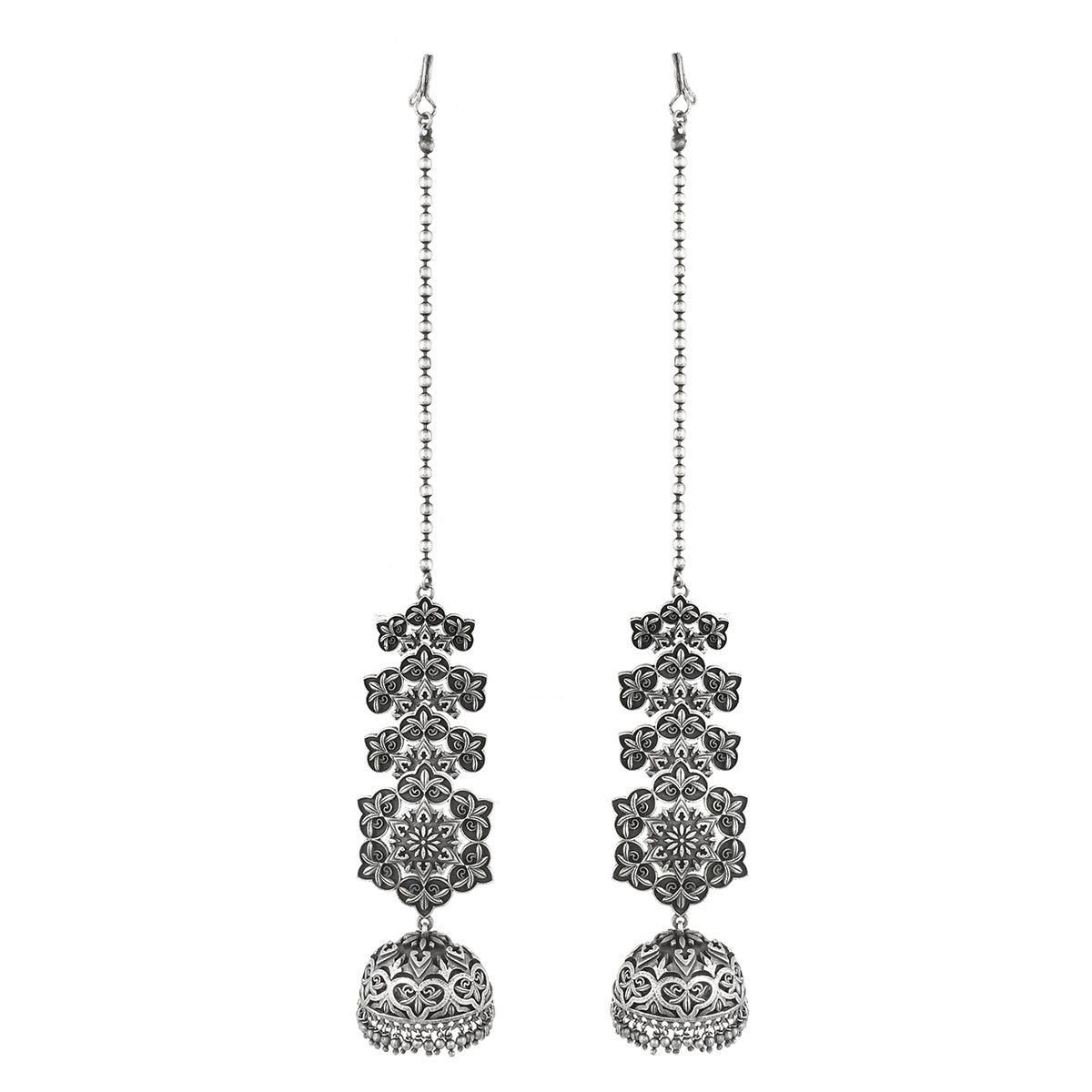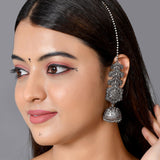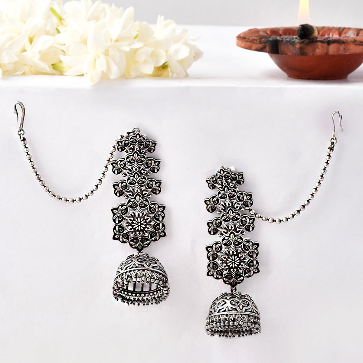 The essence of the Indian festival of Navratri and garba dance have inspired these layered jhumka Sahara earrings. Made from brass and silver oxidized plated, the lightly embellished earrings can be paired with Indian and Indo-Western outfits.