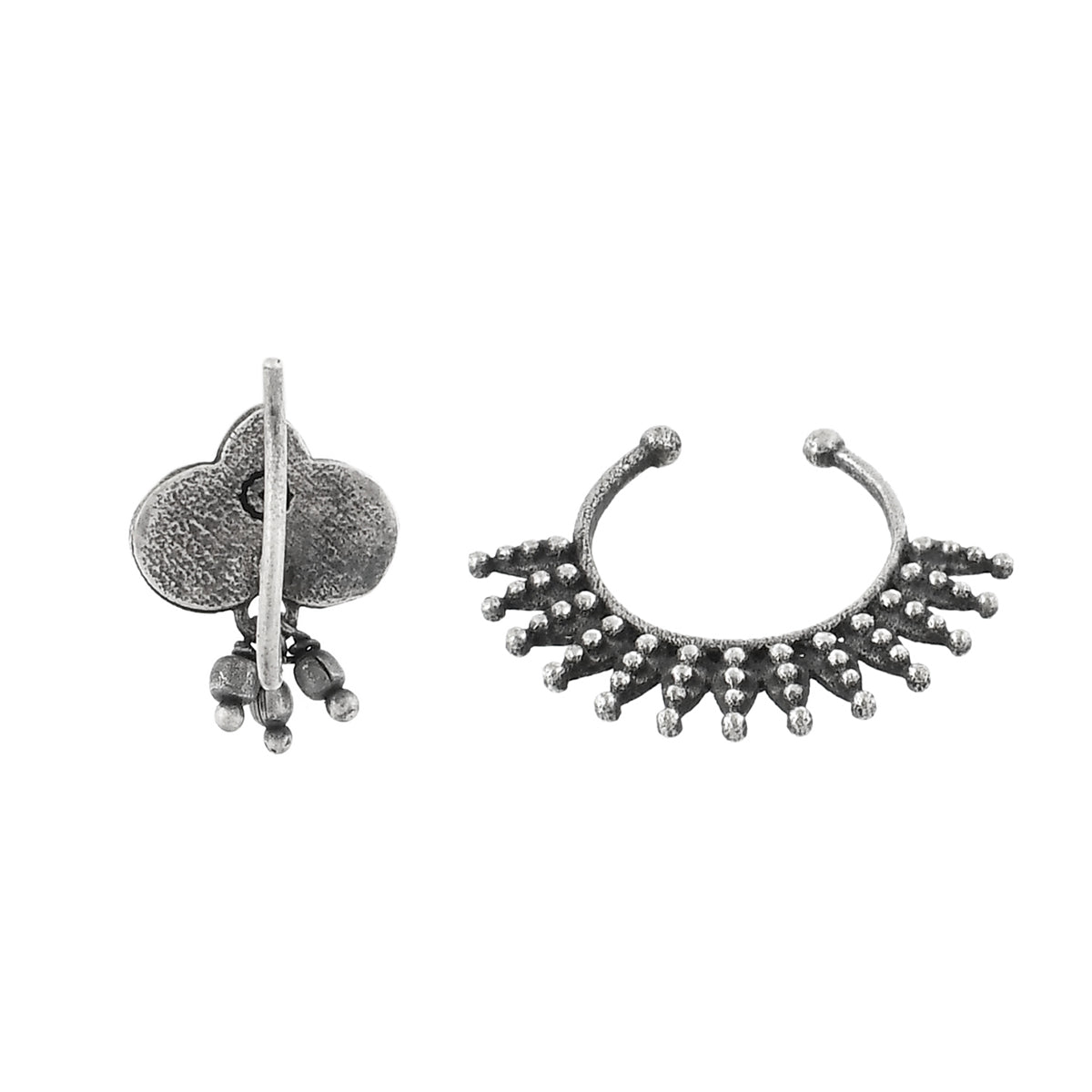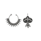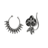 Inspired by the Indian festival of Navratri and its many elements, these clip-on nose pins feature traditional designs and promise to be a comfortable wear at all times. Made from brass and silver oxidized plated. Good for everyday wear.