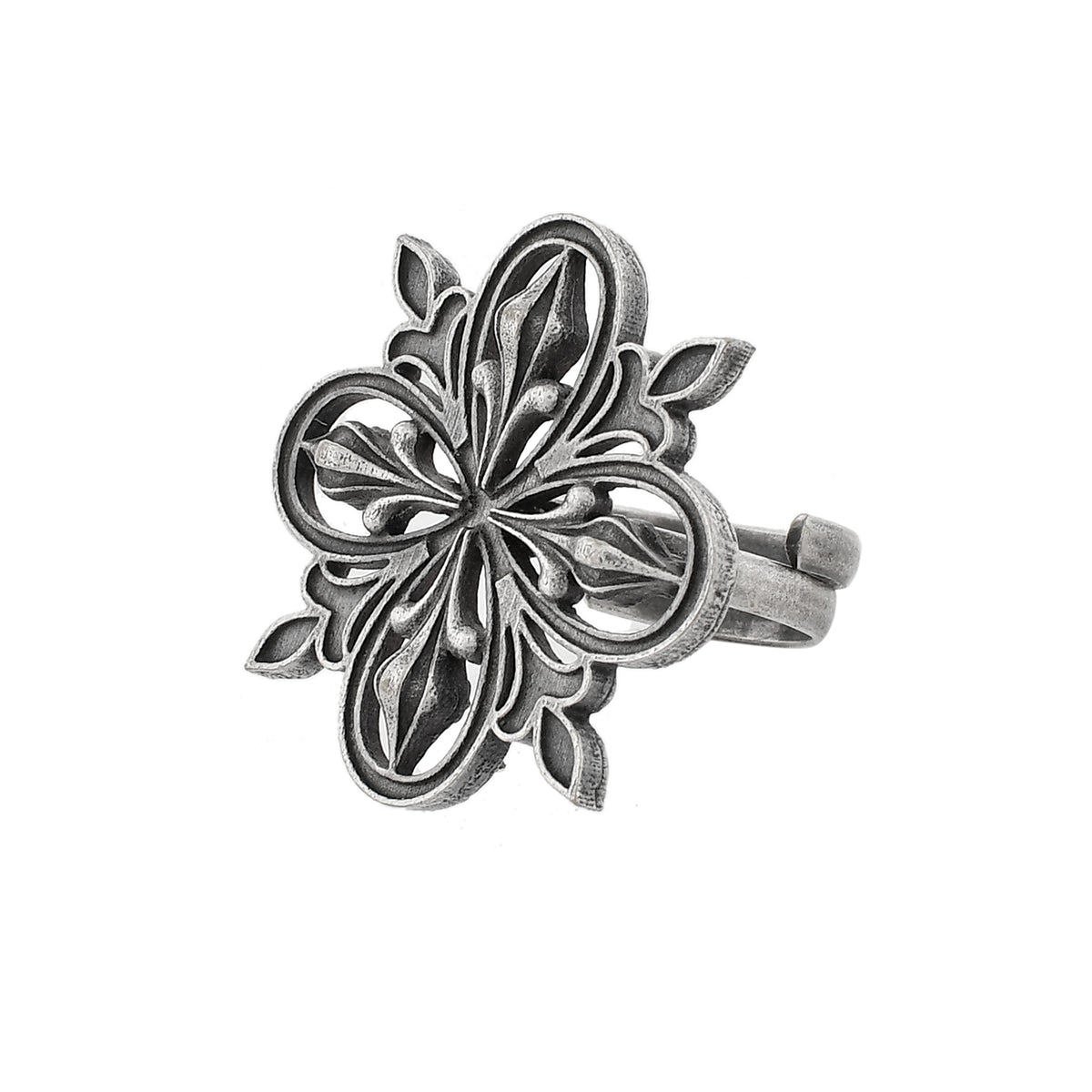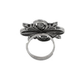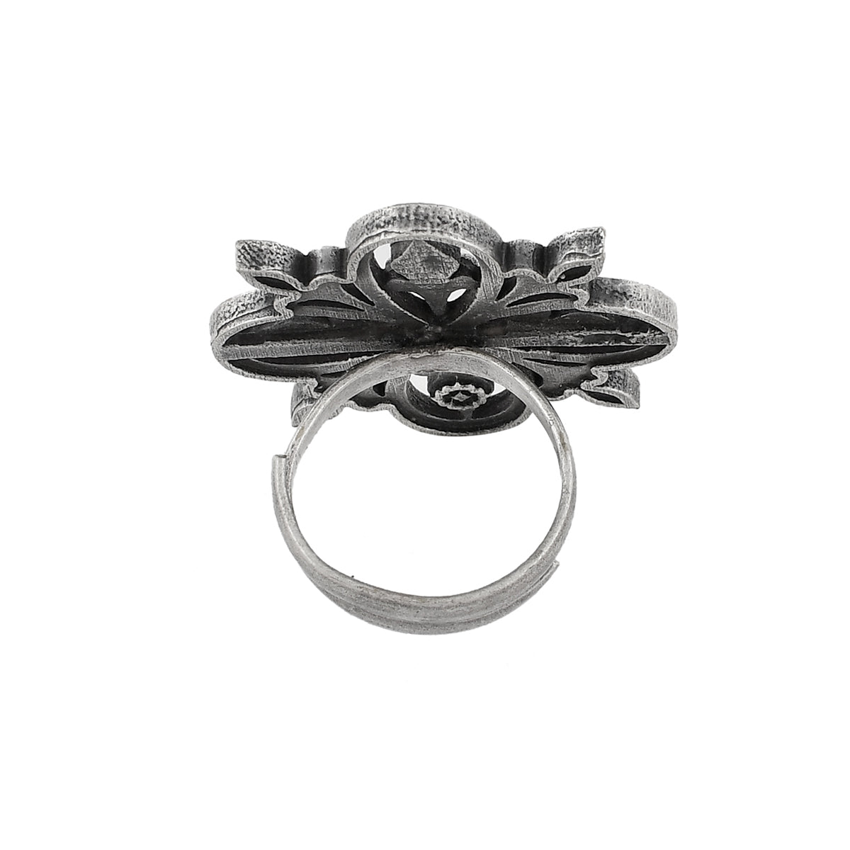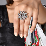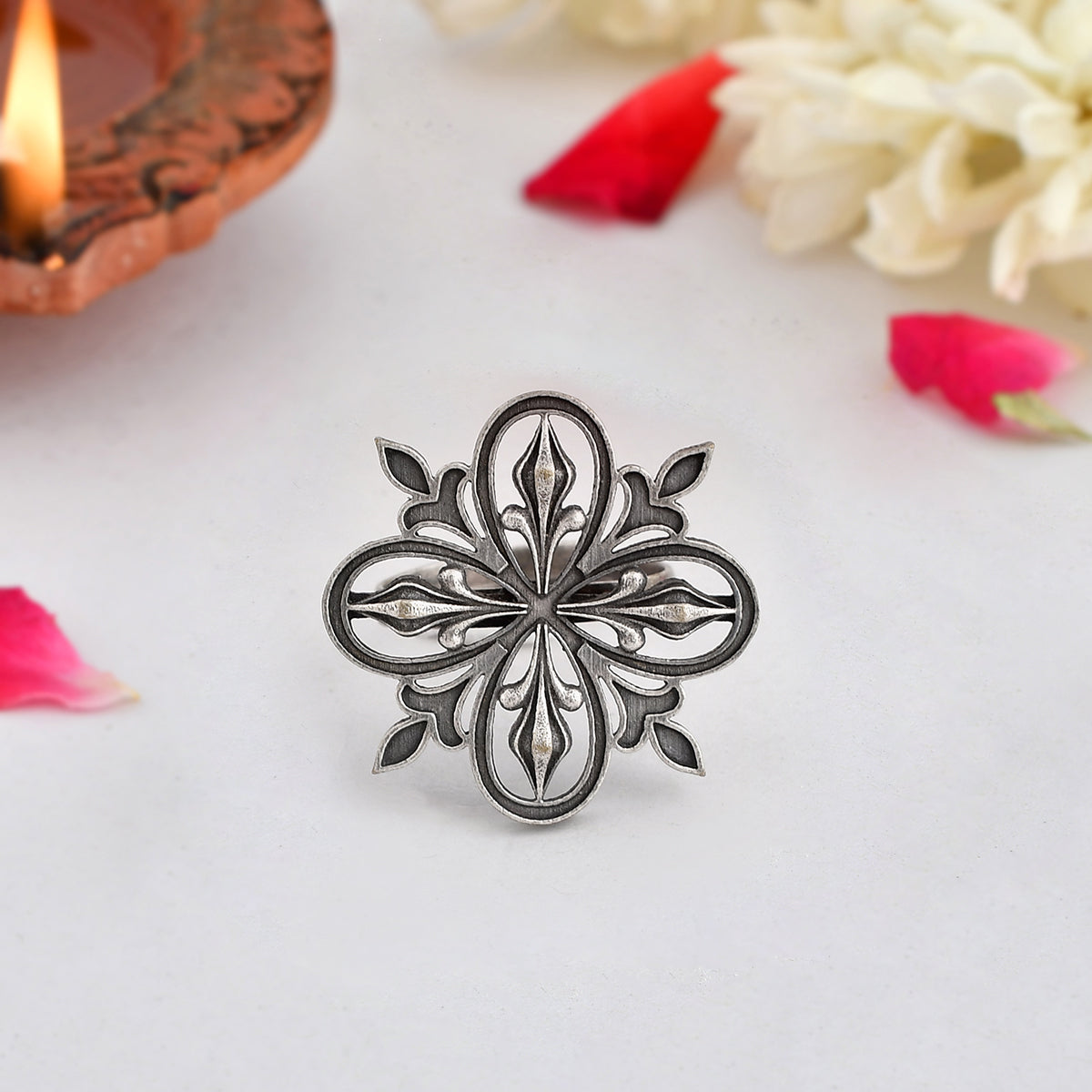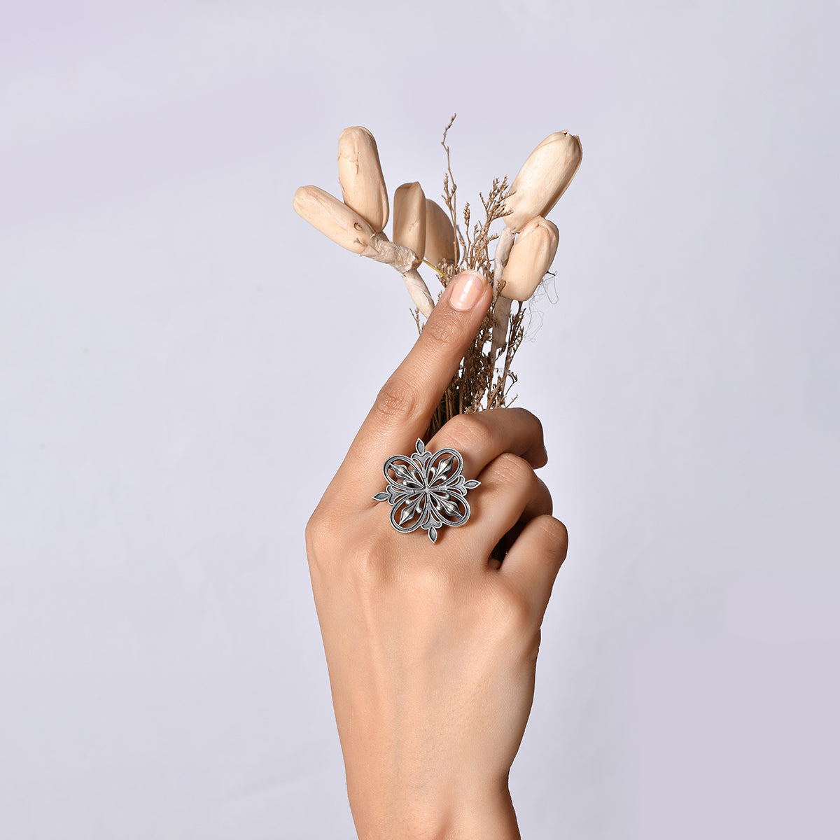 Filigree design statement ring, inspired by the elements and essence of the Indian festival of Navratri. Made from brass and silver oxidized plated. The ring can be paired with a wide range of looks and outfits.