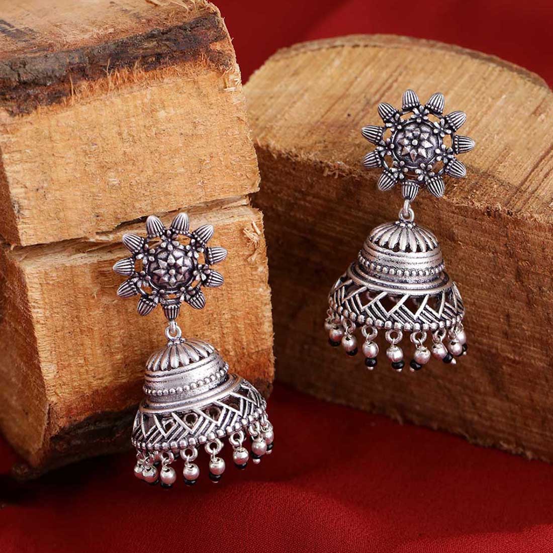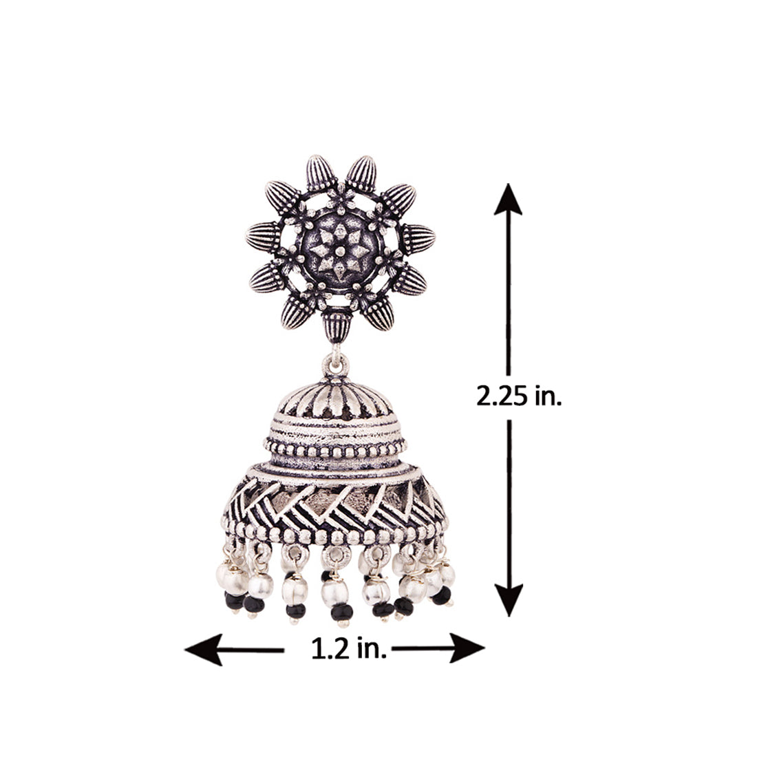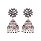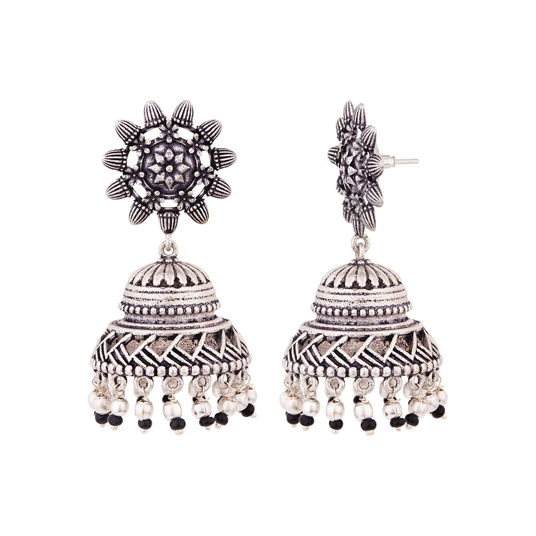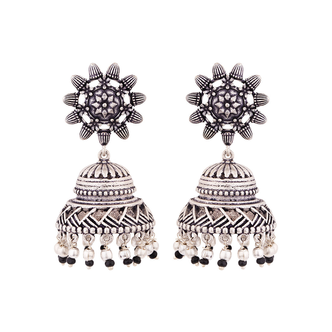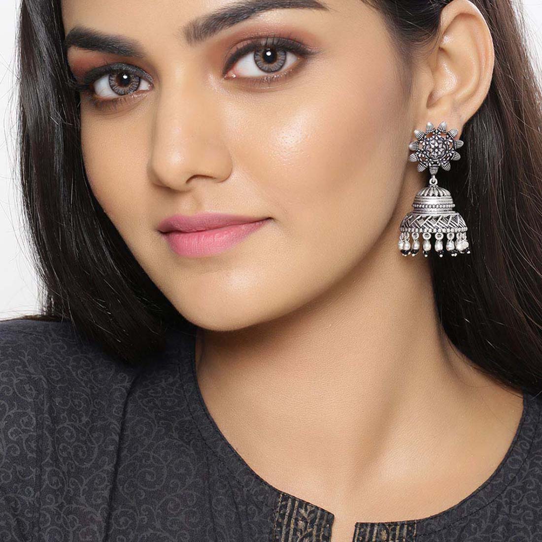 Faux pearls embellished jhumka drop earrings. Fashioned out of brass and oxidised silver plated. Wear with casual ethnic looks.