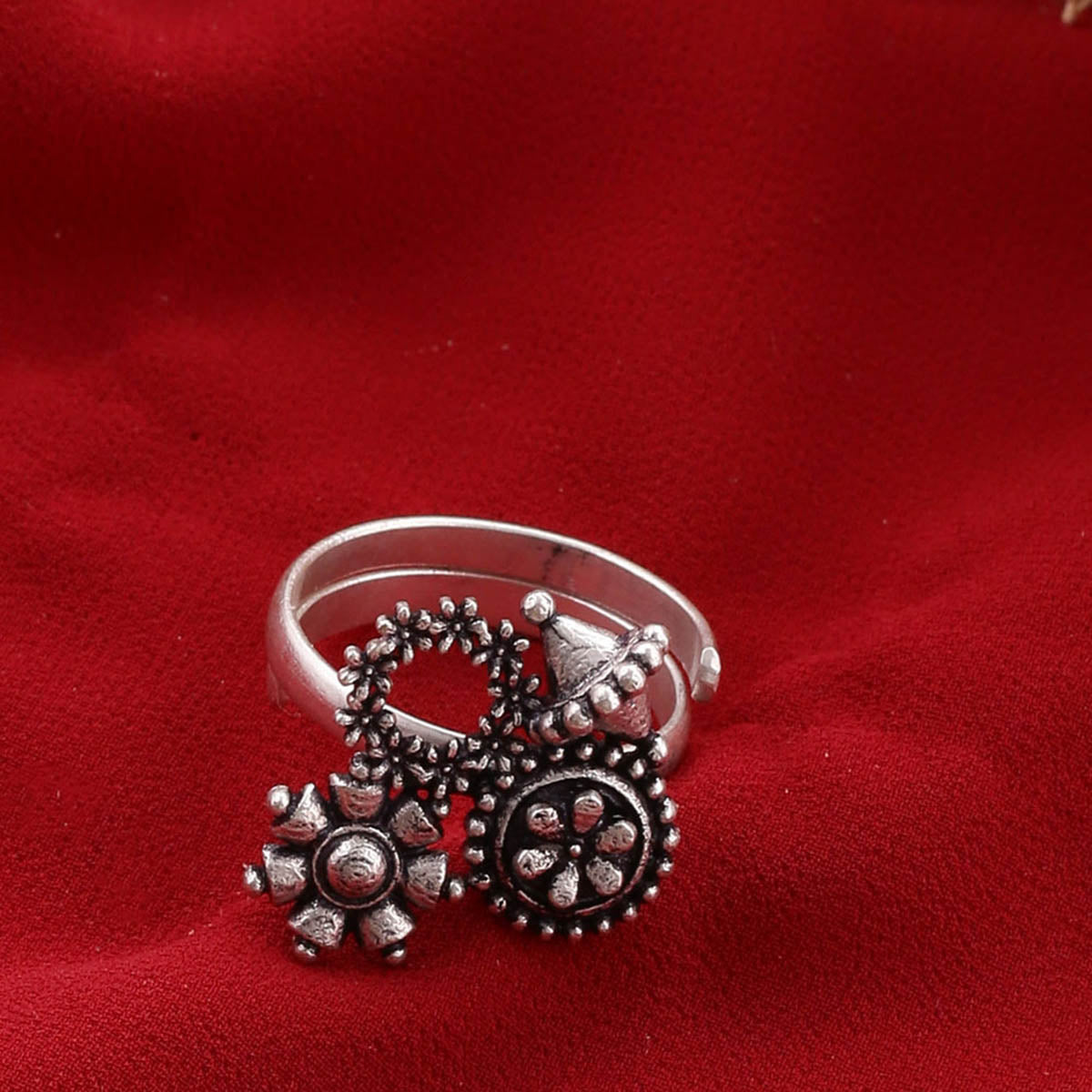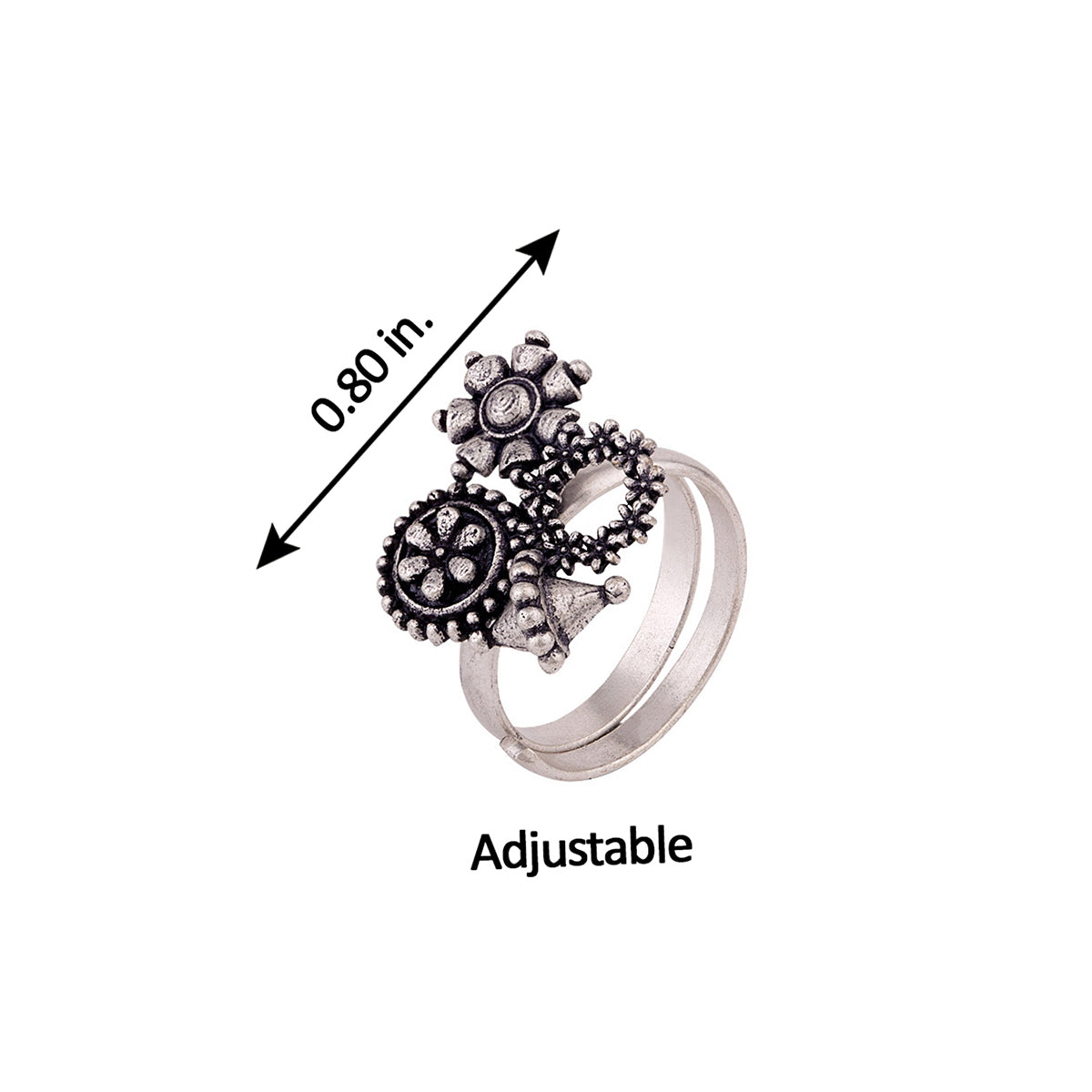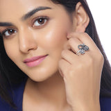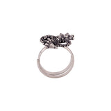 Floral motifs statement ring made from brass. Oxidised silver plated and a good match for Indo-Western looks.