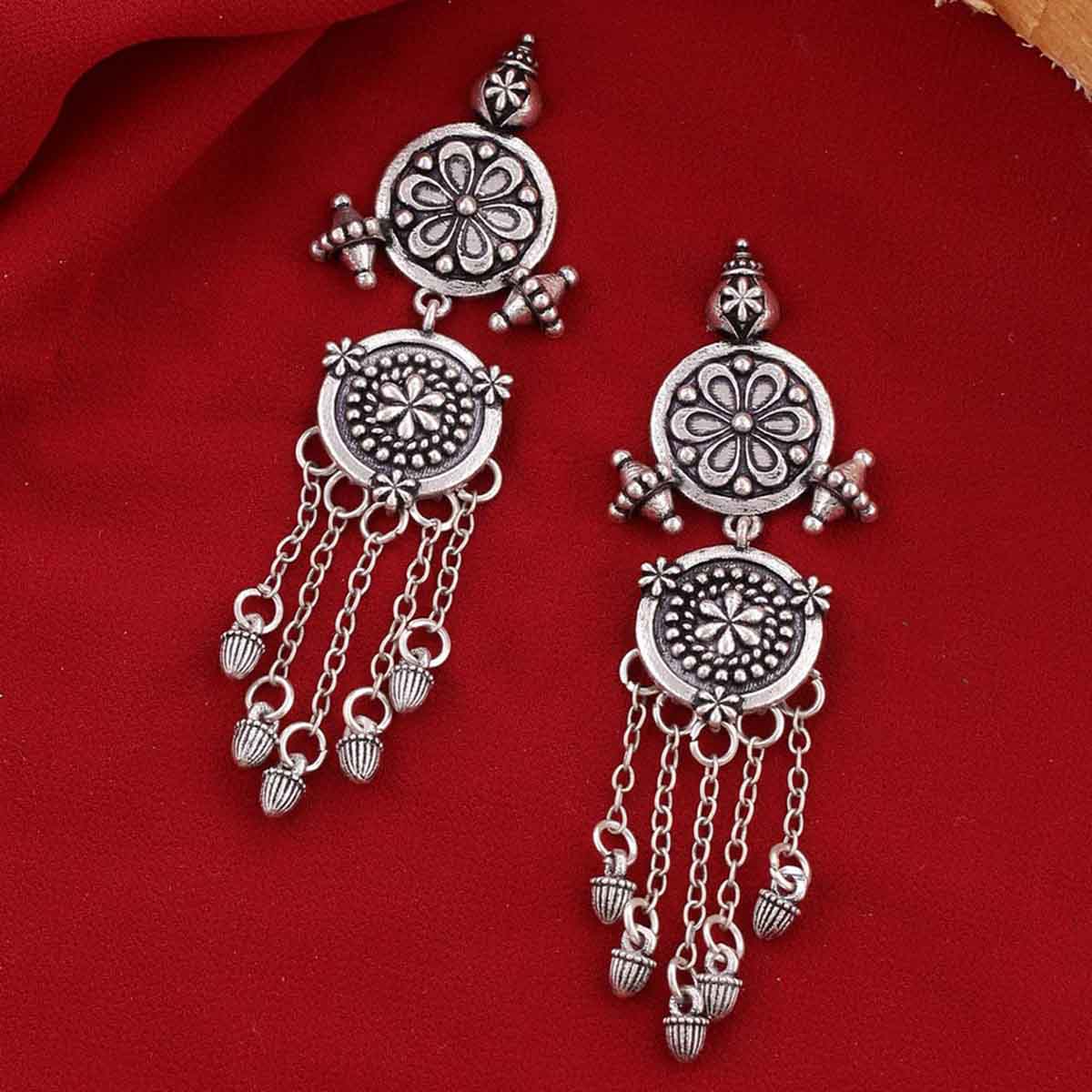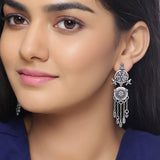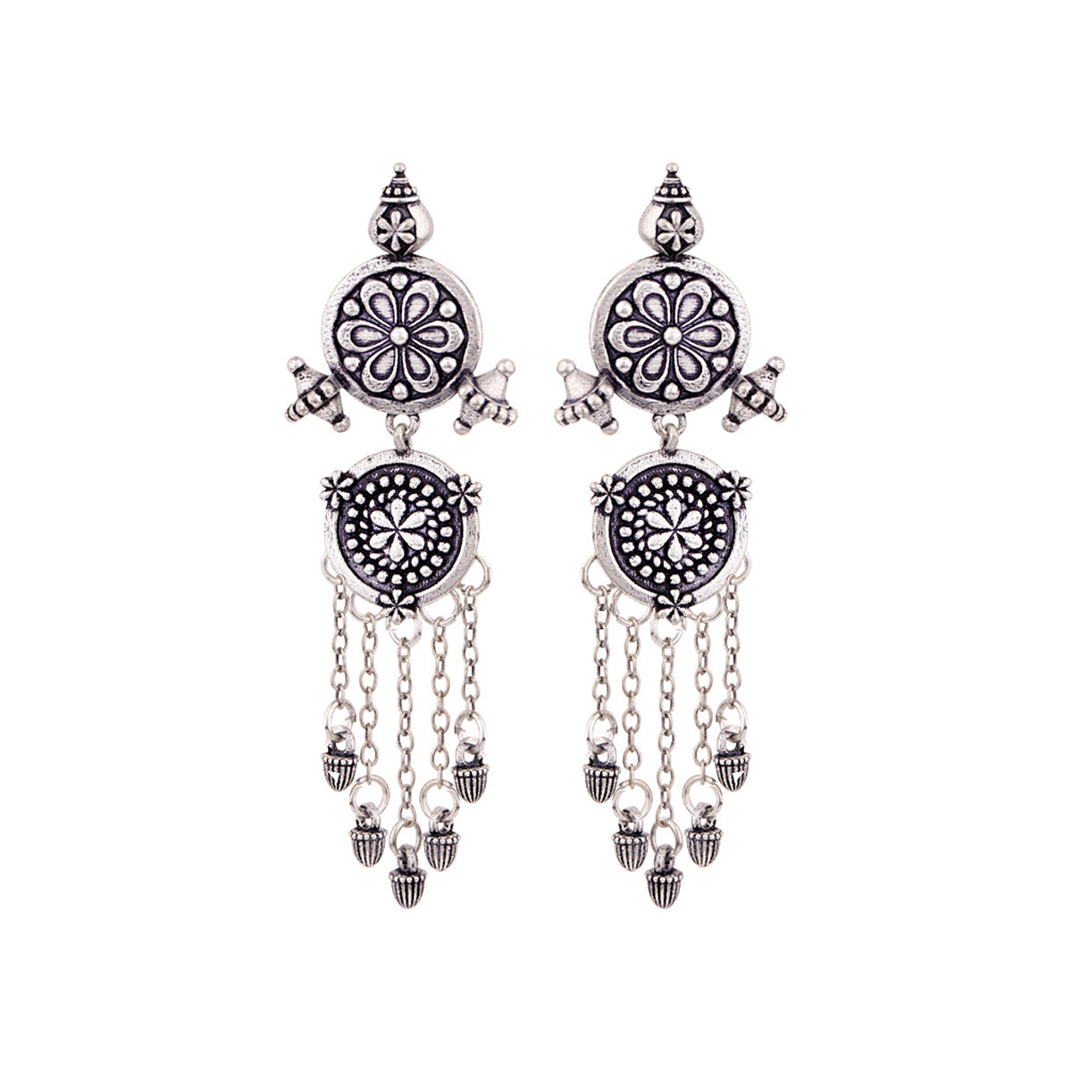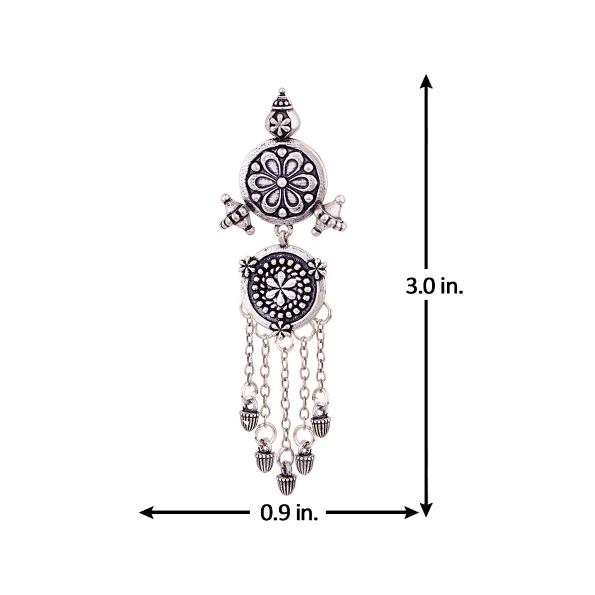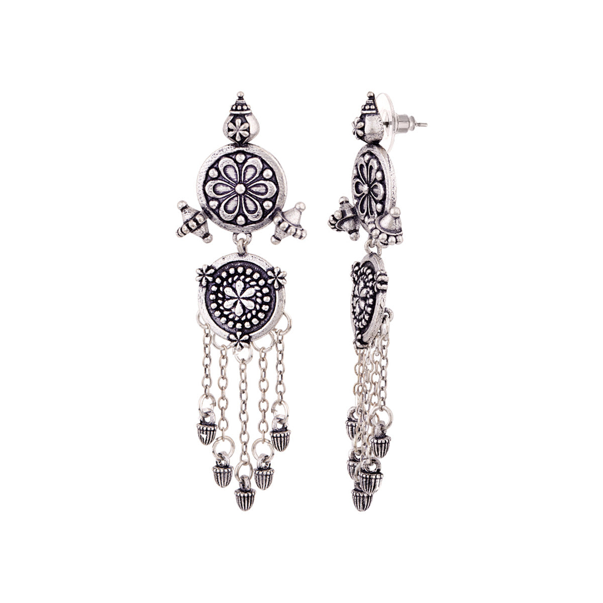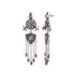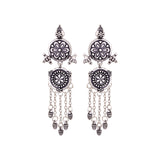 Tassels drop earrings with light embellishments. Made from brass and oxidised silver plated. Pair with ethnic attire.