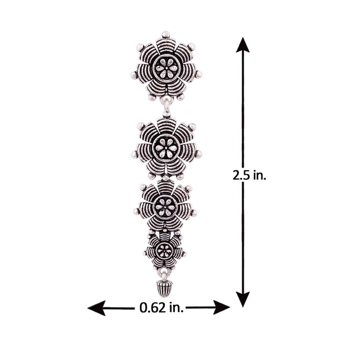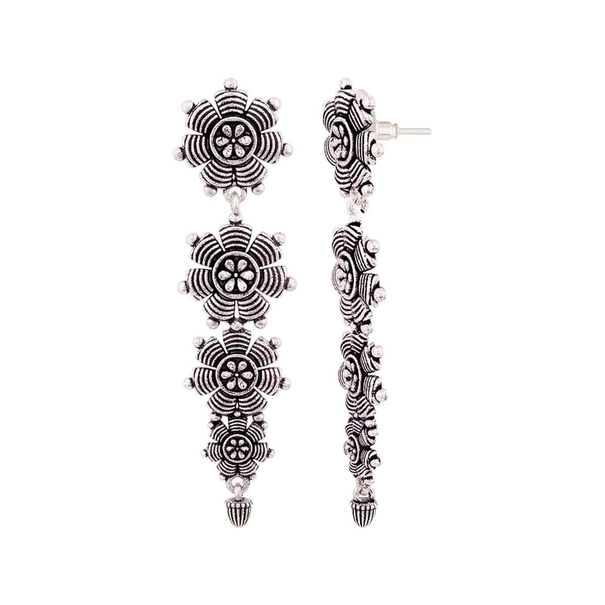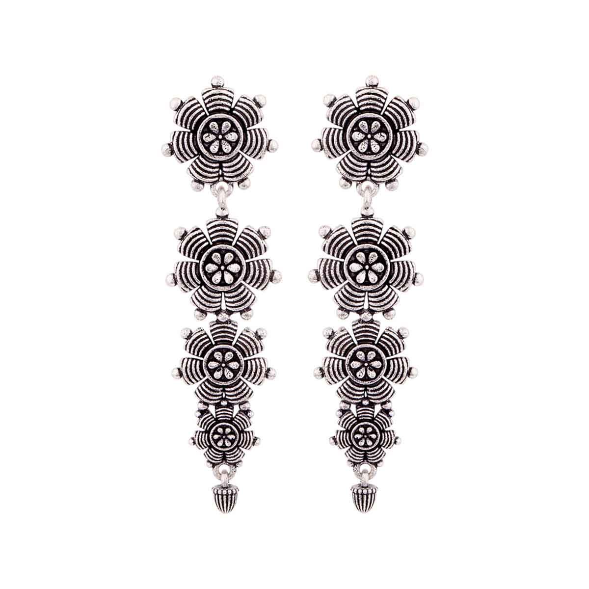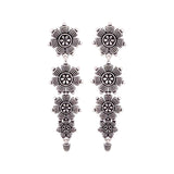 Tribal motifs layered drop earrings made from brass and lightly embellished. Oxidised silver plated. Pair with Indo-Western looks.