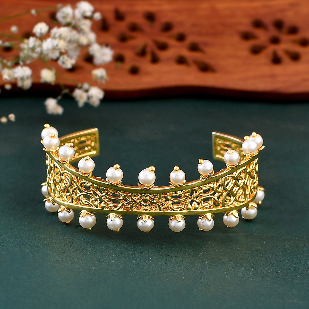 Cuff style bracelet adorned with white shell pearls and designed as a tribute to the lovely and intricate Arabesque patterns, which are a true work of art. The filigree pattern brass cuff has been given a lovely yellow gold plating. Slip in on with a formal Indian outfit to add an instant sparkle to the whole look.