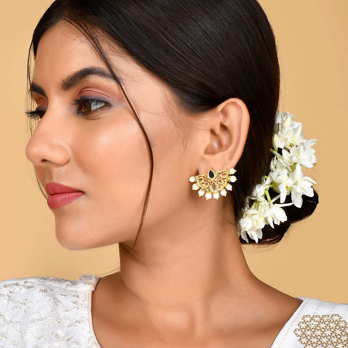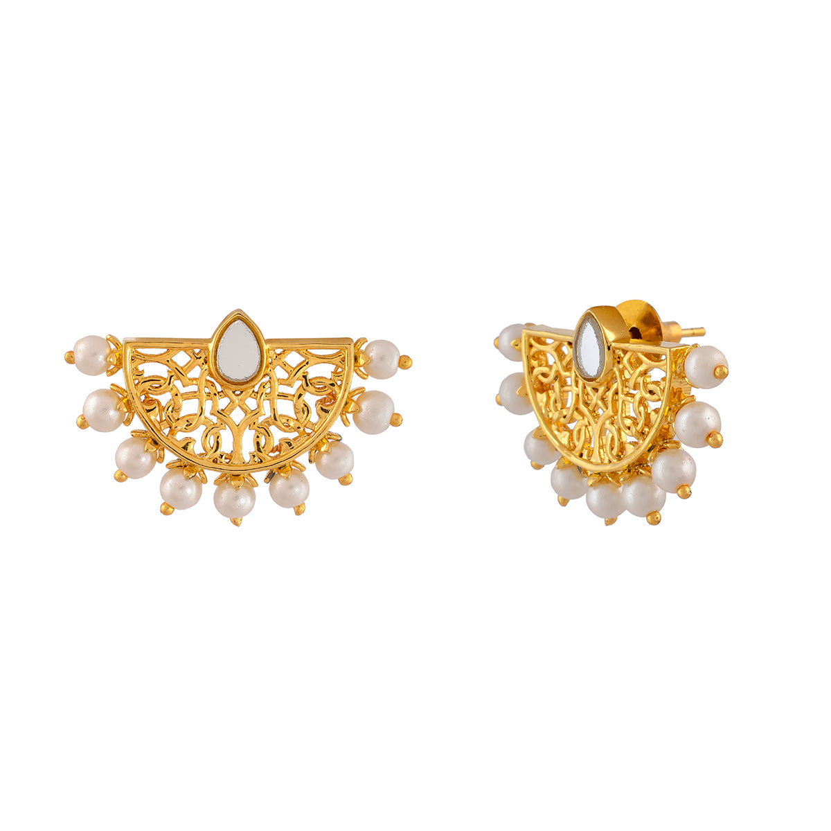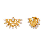 Classic Arabesque patterns have inspired these dainty drop earrings, which are elegant and versatile. The delicate filigree design earrings have been fashioned out of brass. Gold plating and shell pearls add to the grace of this pair, which will compliment all your favorite traditional looks.