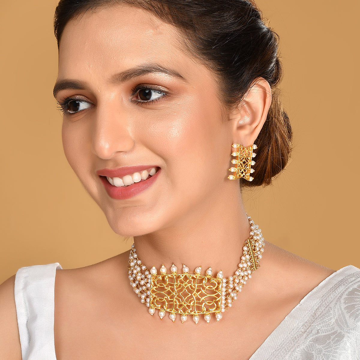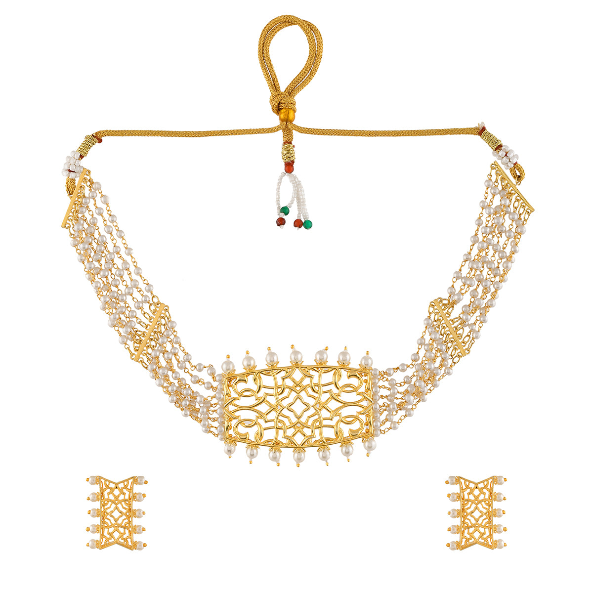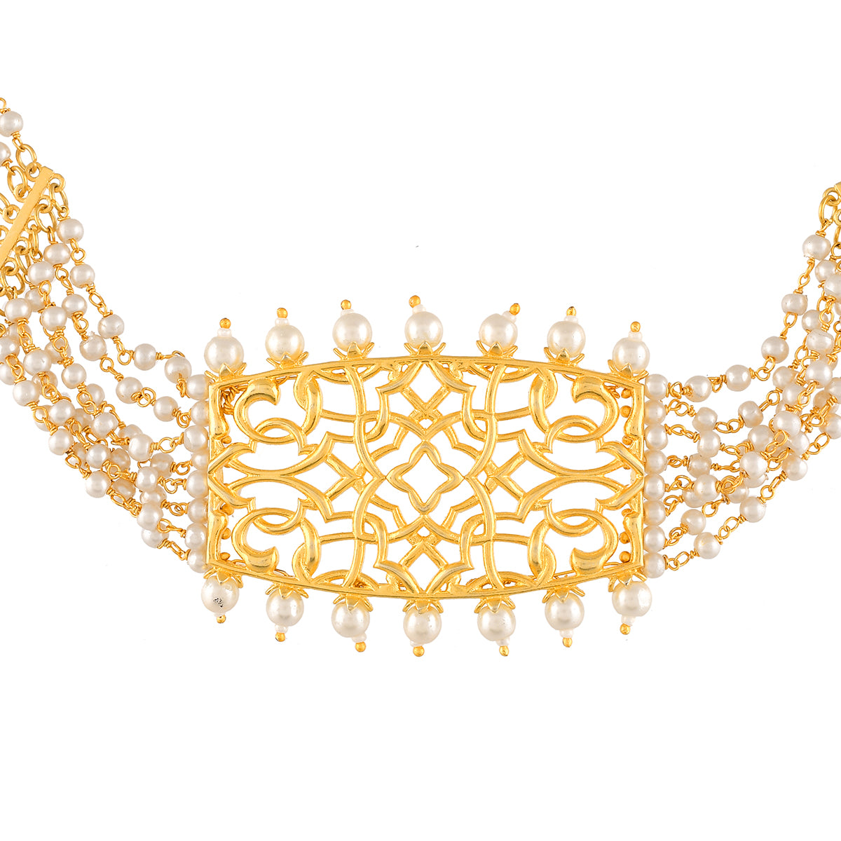 Inspired by the enchanting world of Arabesque architectural embellishments, the Rani Choker Set is a masterpiece that captures the essence of the Nazakat Collection.Adorning this regal choker set are luminous pearls, chosen for their unmatched radiance and timeless appeal.The Rani Choker Set is a symbol of grace and sophistication, making it the perfect choice for special occasions and moments when you want to exude regal charm.