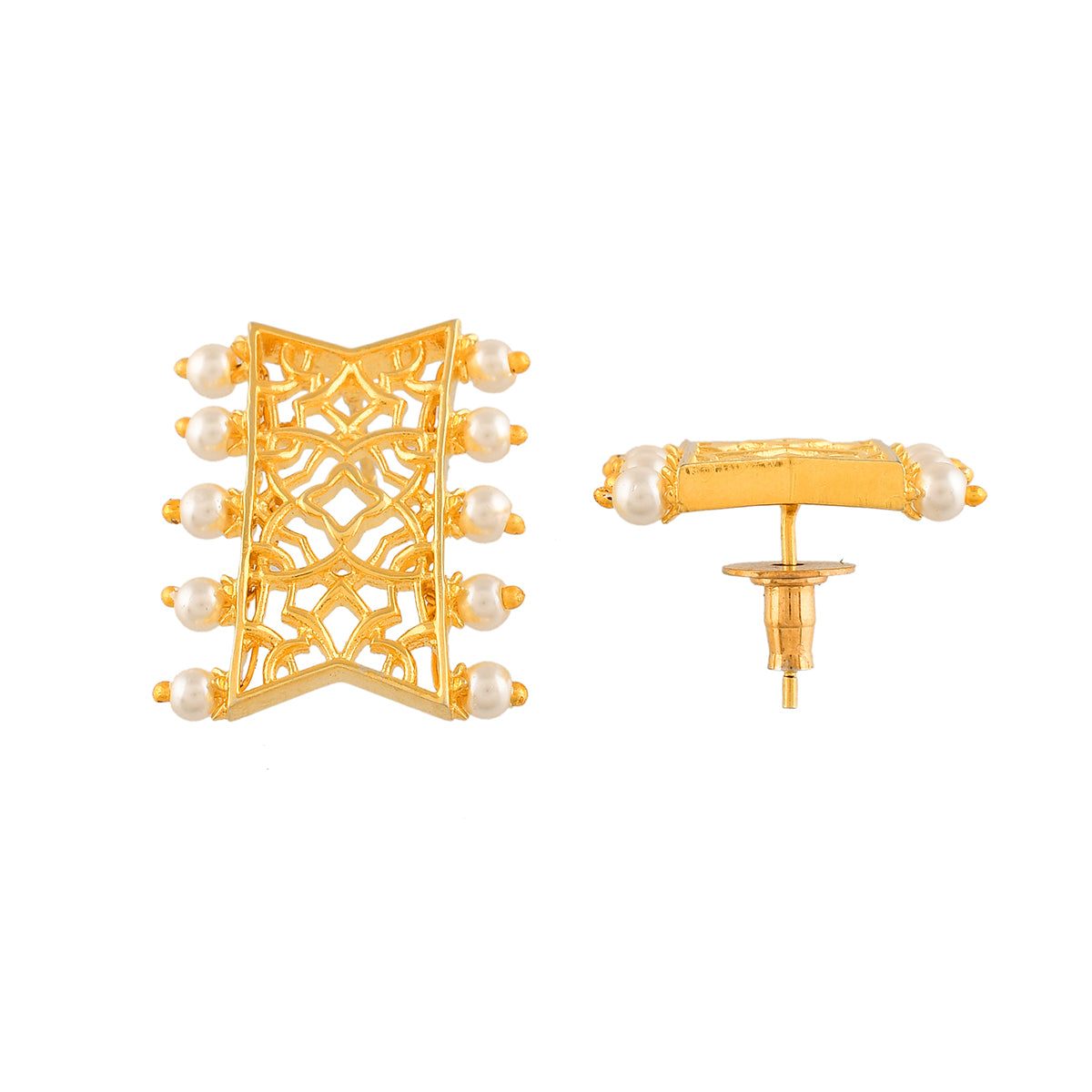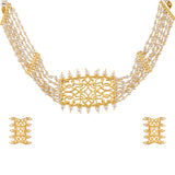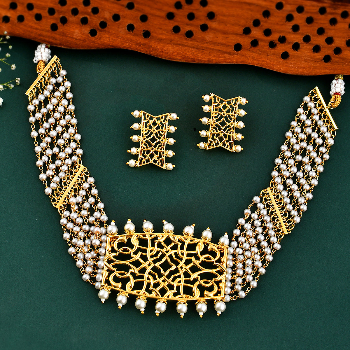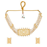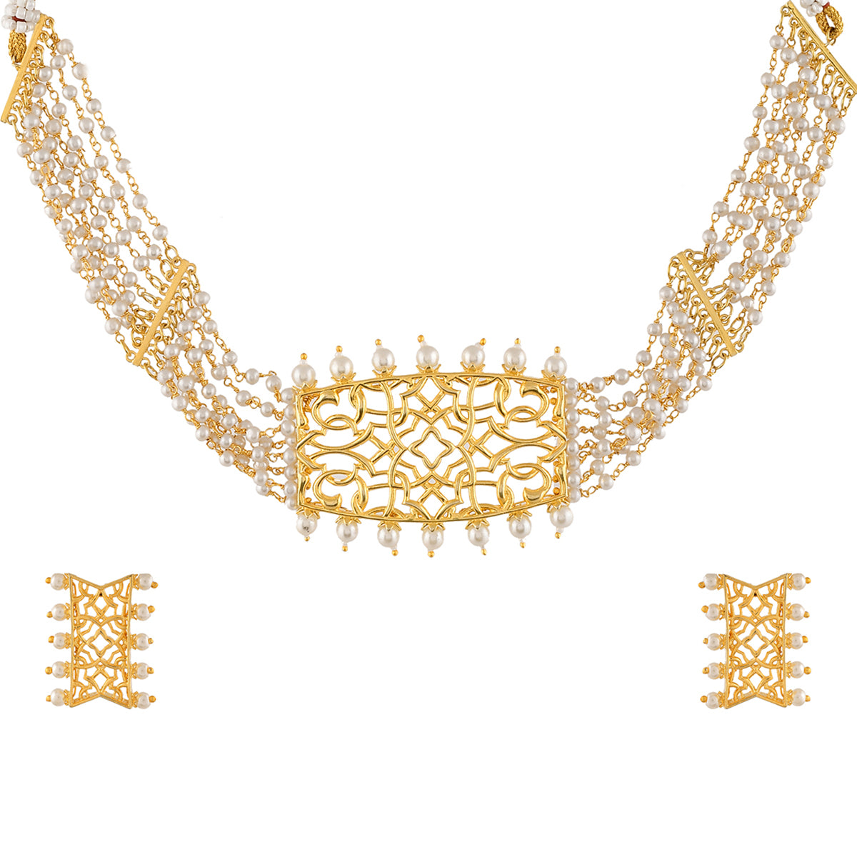 Inspired by the enchanting world of Arabesque architectural embellishments, the Rani Choker Set is a masterpiece that captures the essence of the Nazakat Collection.Adorning this regal choker set are luminous pearls, chosen for their unmatched radiance and timeless appeal.The Rani Choker Set is a symbol of grace and sophistication, making it the perfect choice for special occasions and moments when you want to exude regal charm.