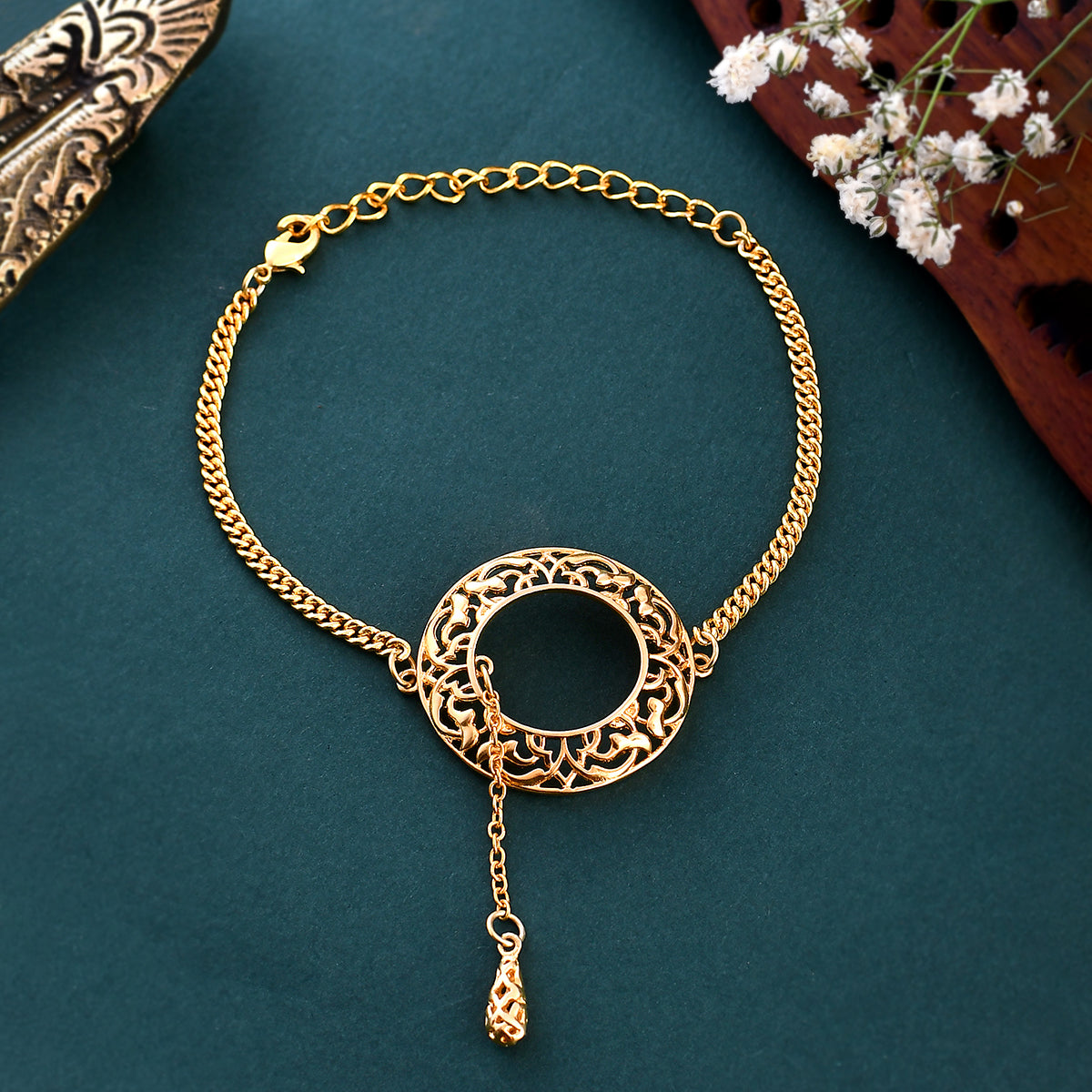 Intricate Arabesque patterns have been inspired this traditional yet edgy bracelet, which features a lovely filigree design. The contemporary design bracelet has been fashioned out of brass. Yellow gold plating adds to the charm of this versatile piece, which promises to be a comfortable wear at all times.