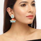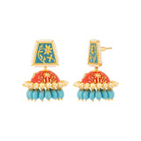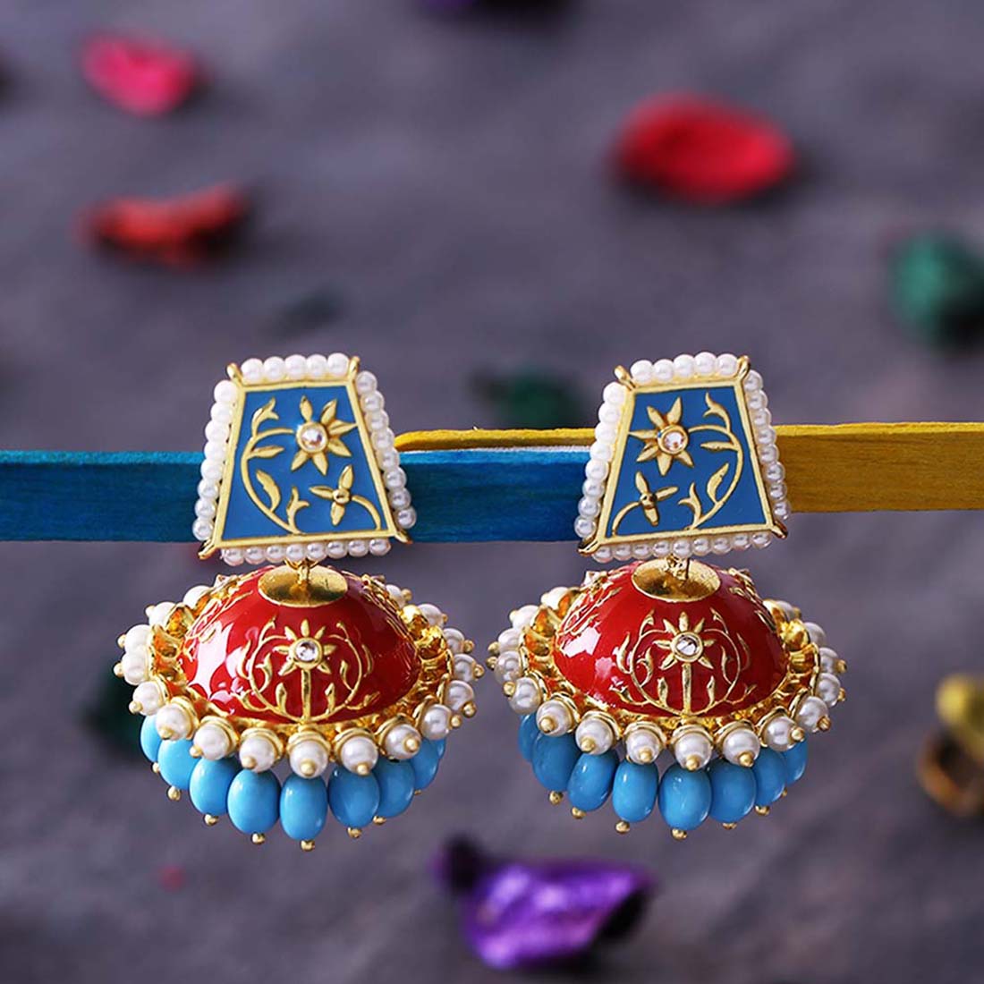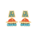 Inspired by the popular Blue Pottery of Jaipur, these brass earrings have been embellished with gems. Yellow gold plated and good for formal wear.