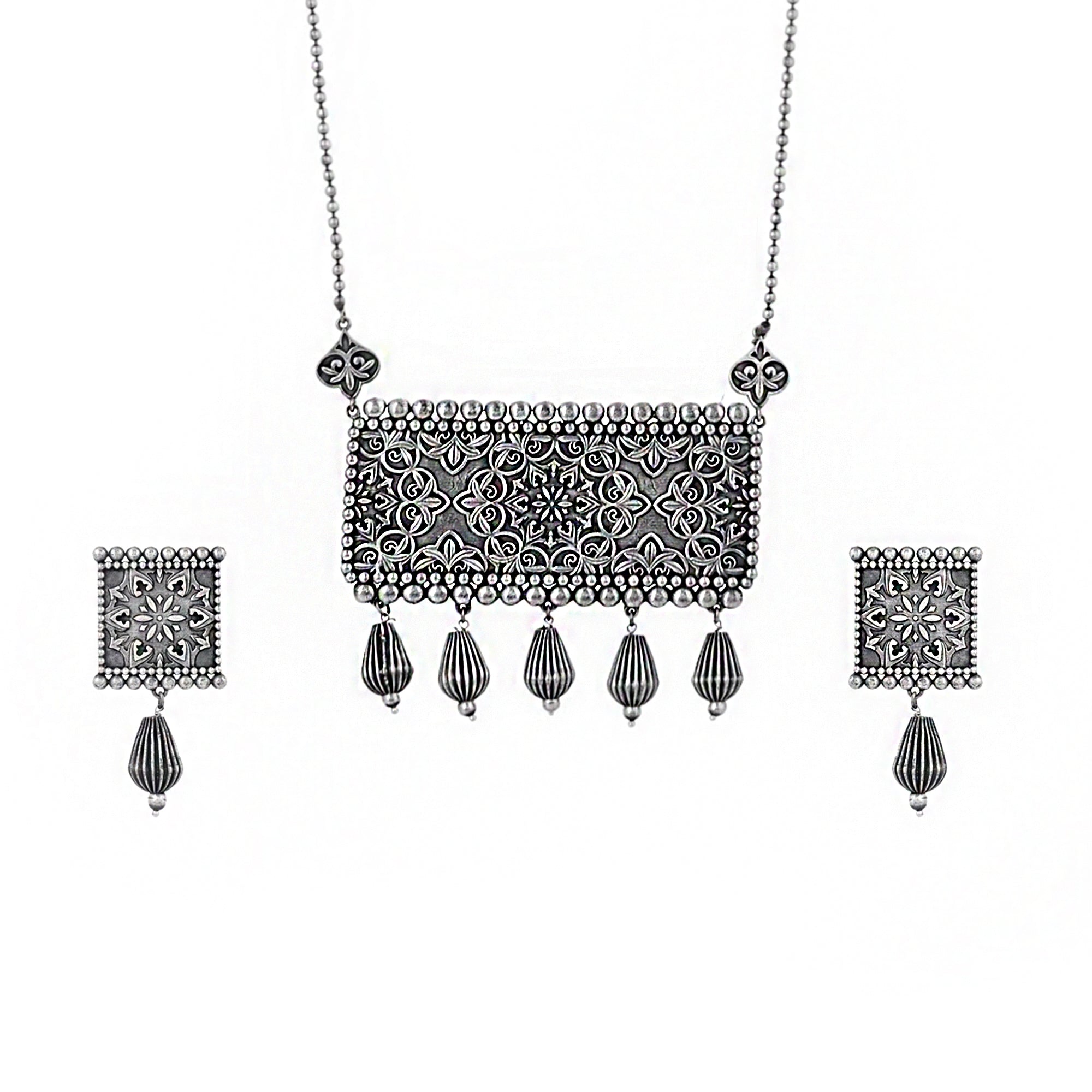 Inspired by beautiful banjara designs and the elements of Navratri, this floral motifs embossed jewellery set has been fashioned out of brass. The lightly embellished necklace and drop earrings have been given an oxidized silver plating. Lightweight, comfortable and versatile.Caring...
