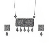 Inspired by beautiful banjara designs and the elements of Navratri, Motifs are embossed jewellery set has been fashioned out of brass. The lightly embellished necklace and drop earrings have been given an oxidised silver plating. Lightweight, comfortable and versatile.