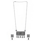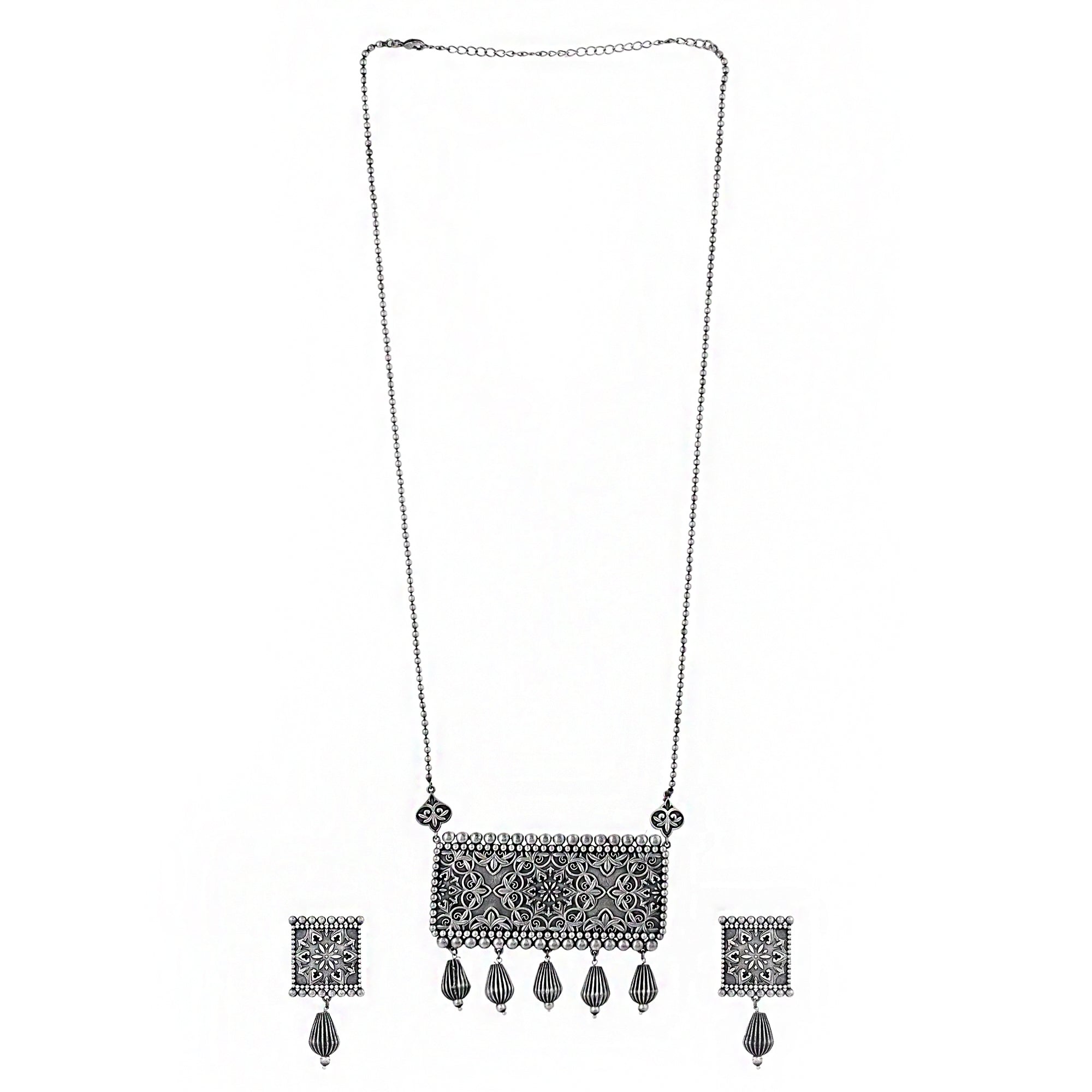 Inspired by beautiful banjara designs and the elements of Navratri, this edgy jewellery set has been fashioned out of brass. The lightly embellished long drop necklace and matching earrings have been given an oxidized silver plating. Lightweight, comfortable and versatile.Caring...