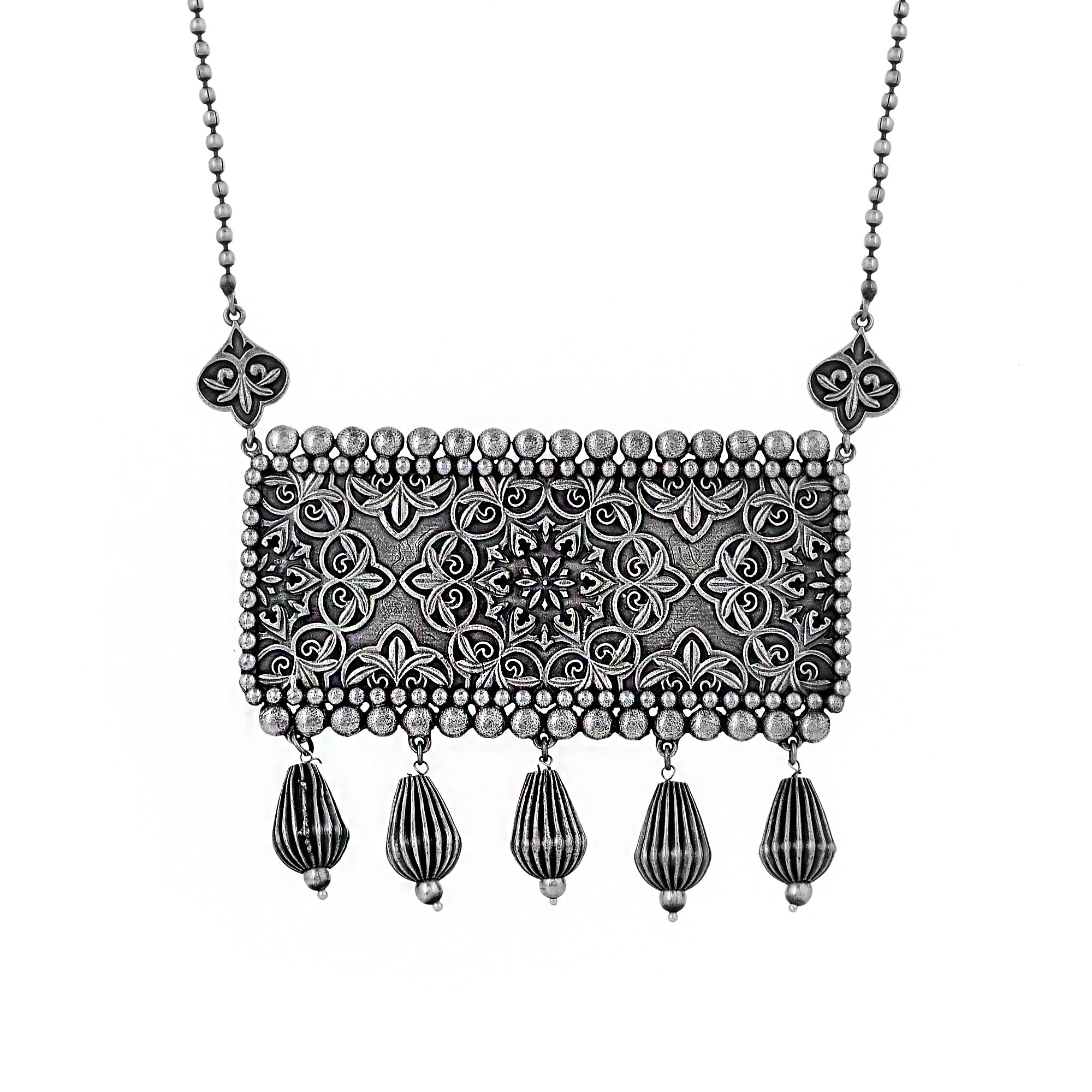 The elements and essence of the Indian festival of Navratri have inspired this mandala design statement necklace, which features delicate floral designs. Made from brass and oxidized silver plated. Pair with an ethnic skirt or traditional kurta.Caring for your fashion...