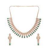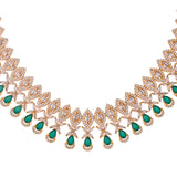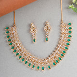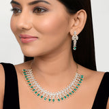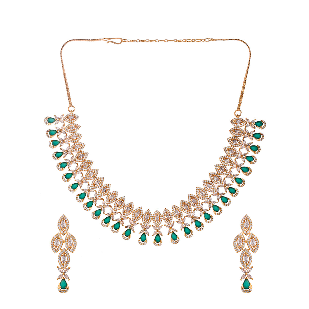 Teardrop jewellery set, fashioned out of brass and featuring a lovely gold plating. Embellished with green and white cubic zirconia gemstones, the necklace and earrings promise to be a comfortable wear at all times. Pair with a designer saree or cocktail gown.