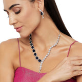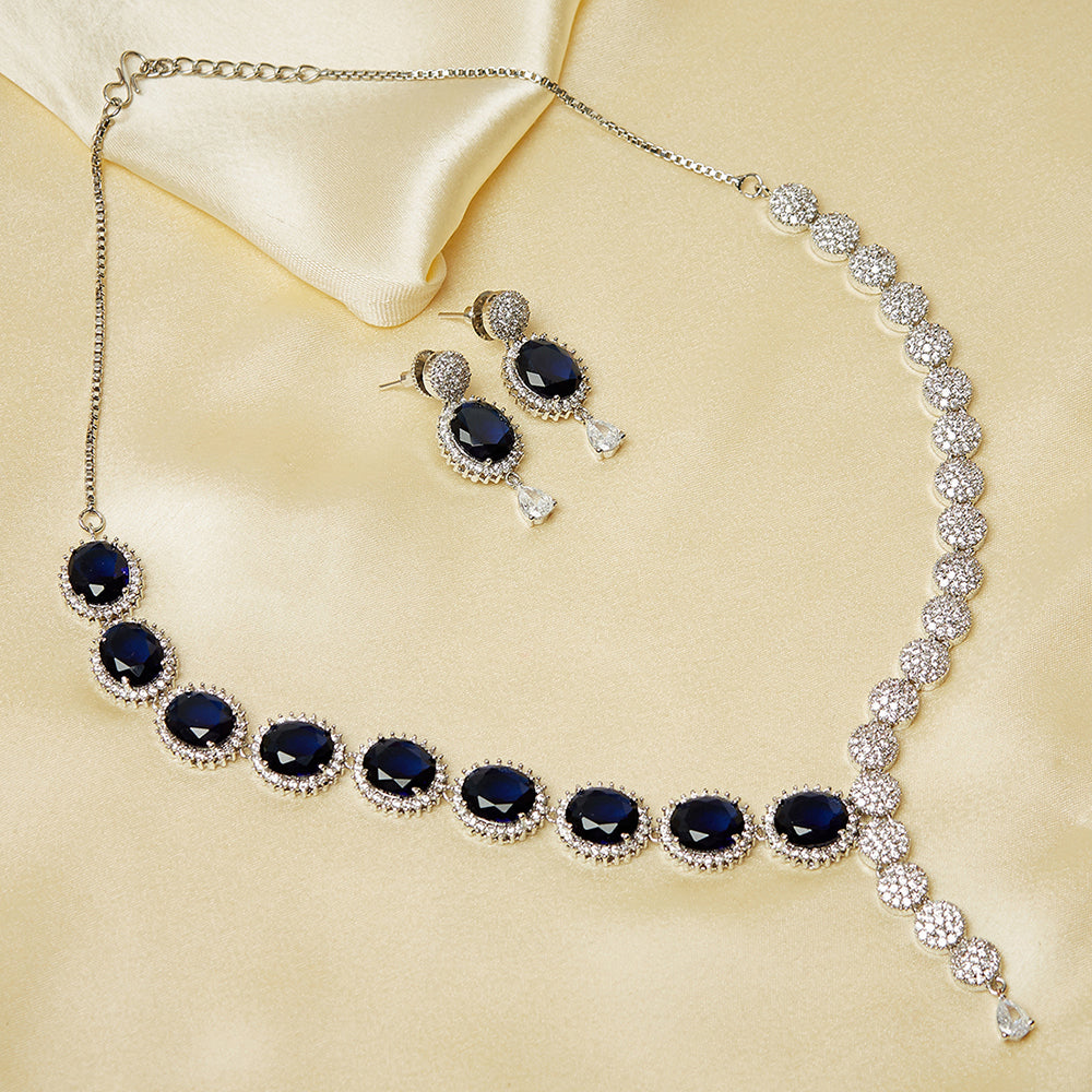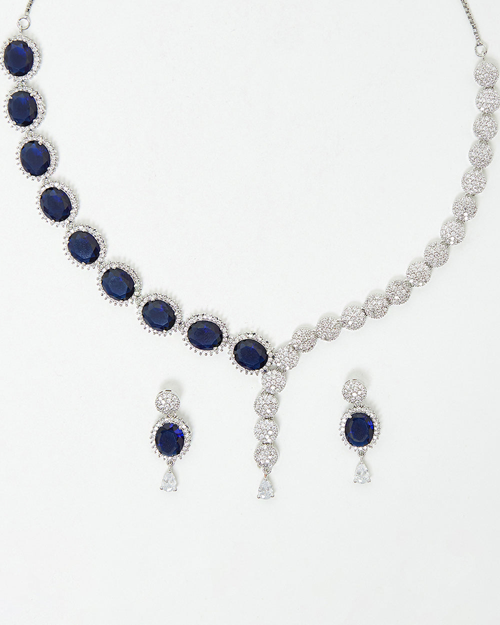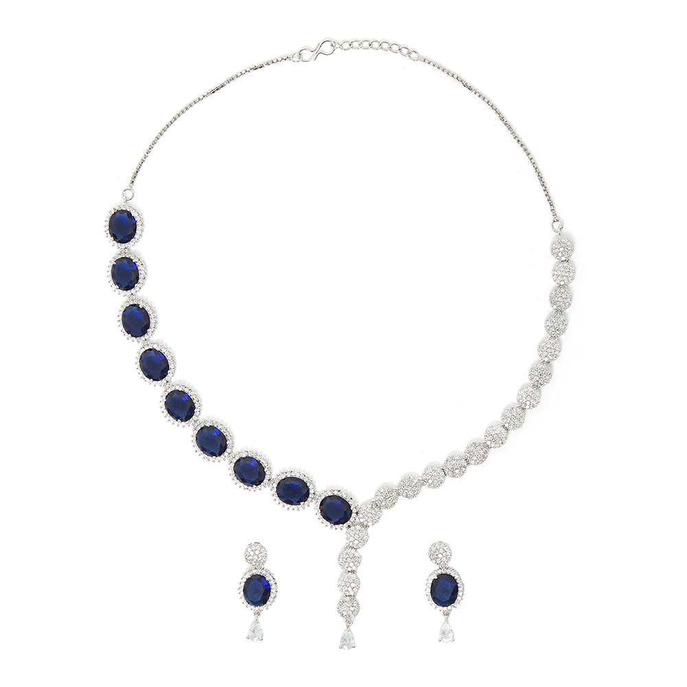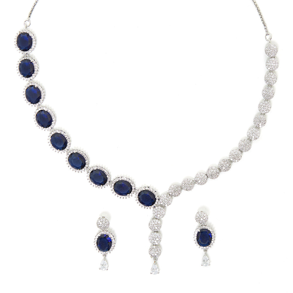 A contemporary design jewellery set, made from brass of the highest quality. Silver plating adds to the allure of the necklace and drop earrings, which have been embellished with oval cut blue zircon gemstones and tinier round cut white zircons in a cluster setting. The elegant set will pair well with a wide range of formal outfits, right from designer sarees to cocktail gowns.