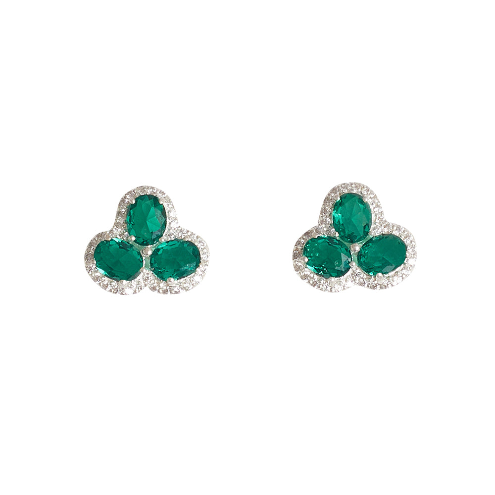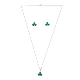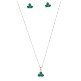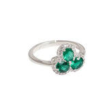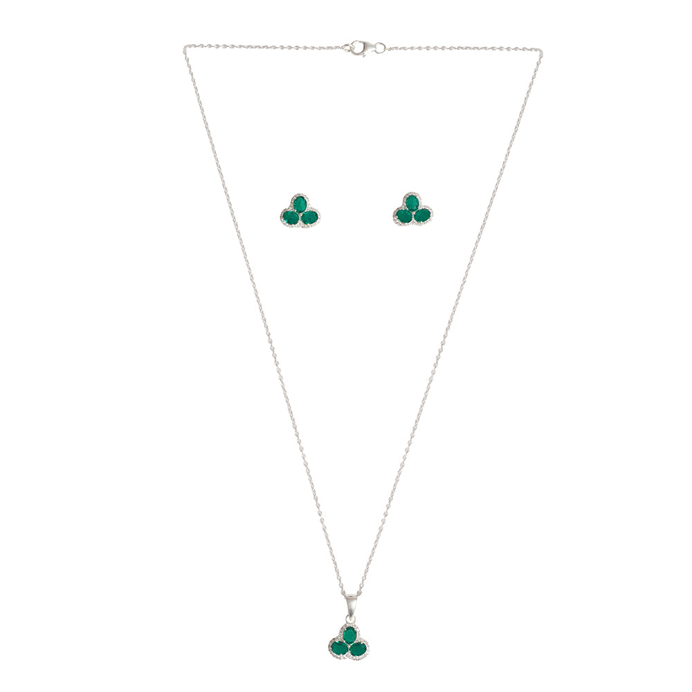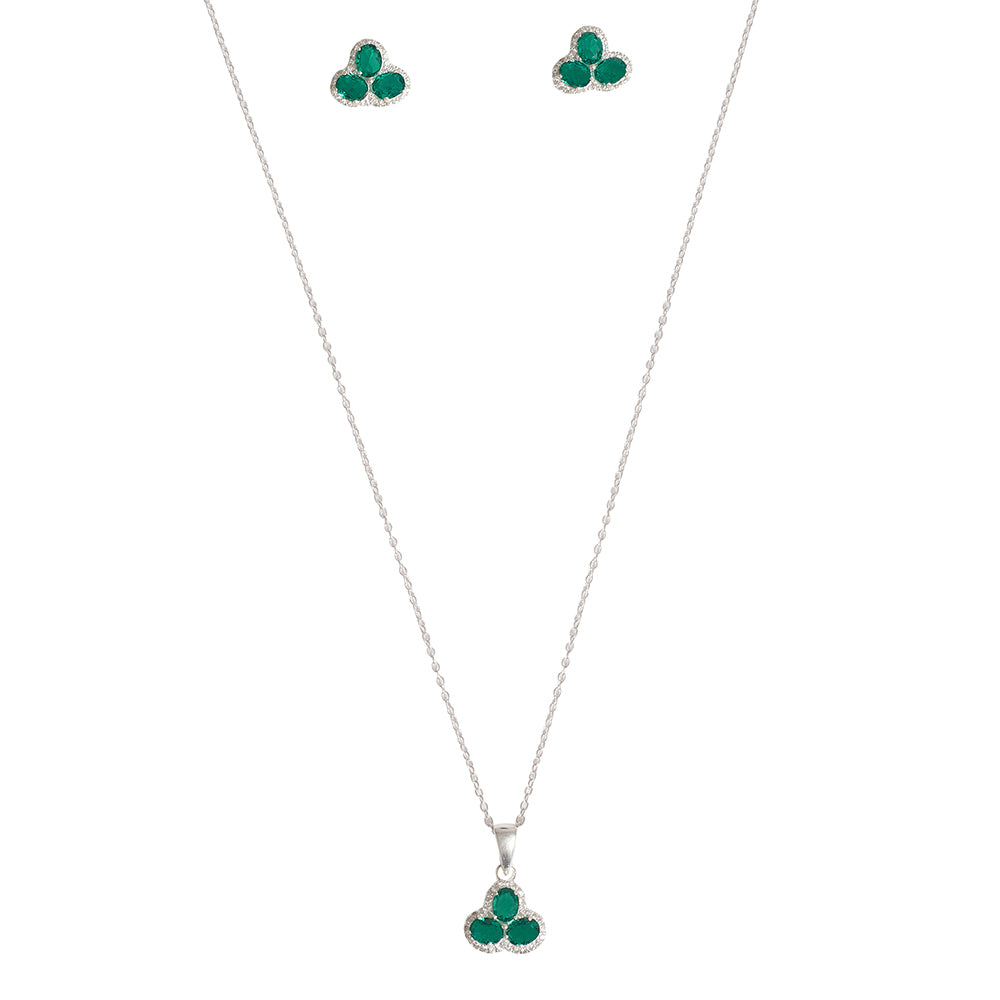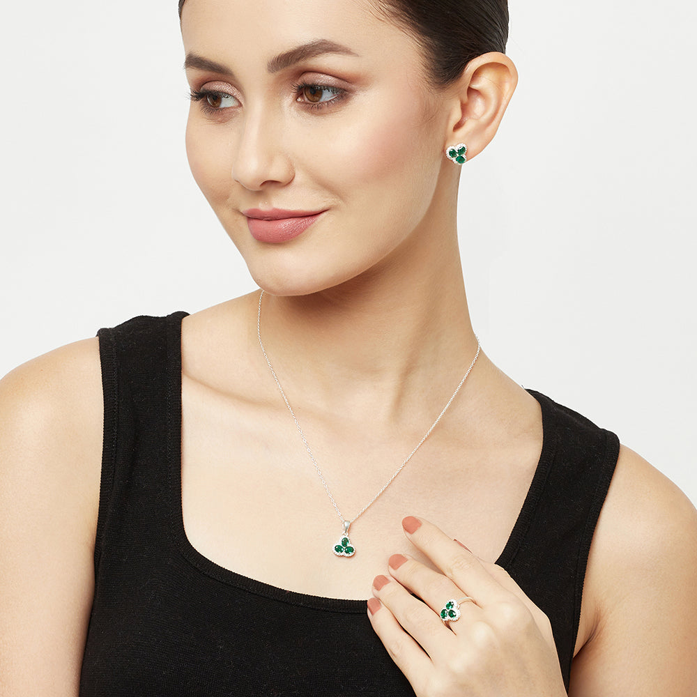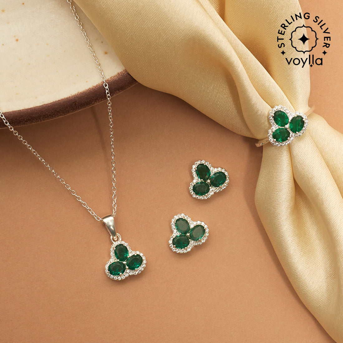 A jewellery box set inclusive of necklace, stud earrings and adjustable ring. The pieces have all been crafted from 925 sterling silver into floral motifs and embellished with Emerald gemstones in a classic oval cut. The set is good for everyday casual or office wear, and can also be paired with formal outfits.
