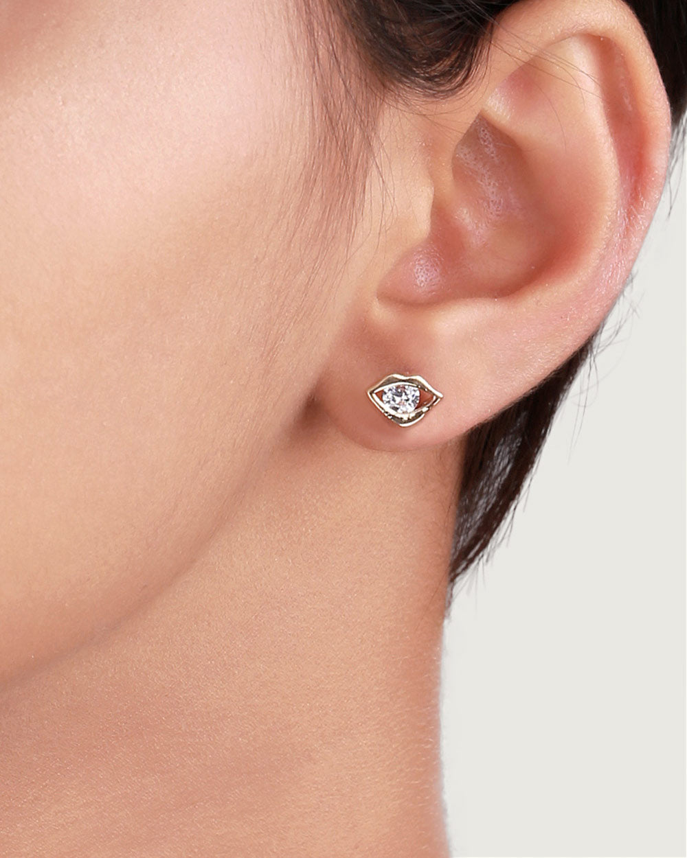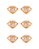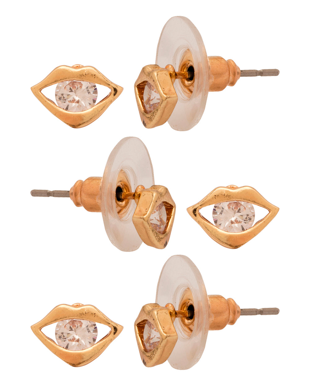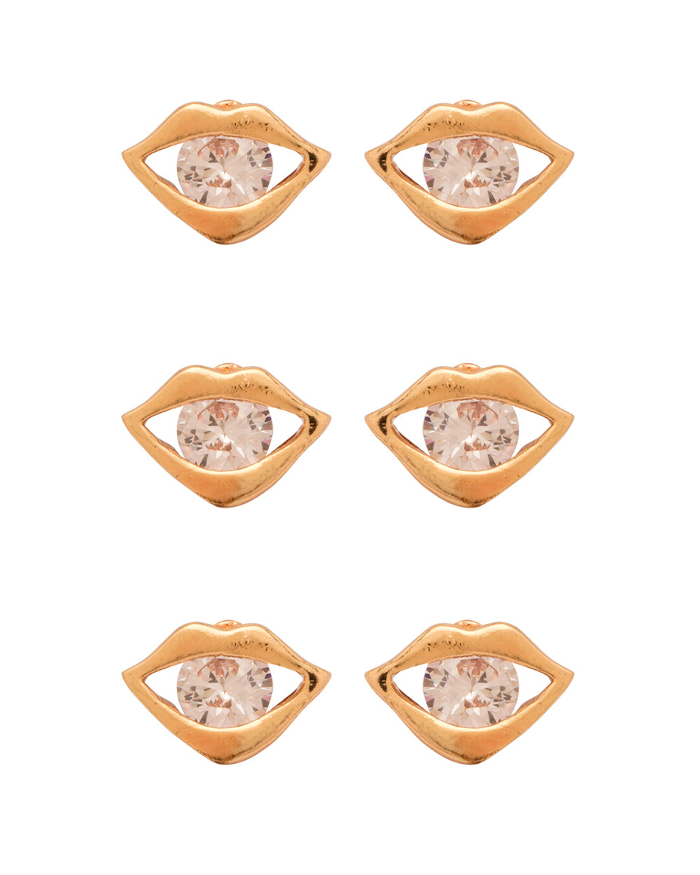 3 pairs of stud earrings featuring a classy lip design in gold tone material with American Diamond embellishment. This pretty sparkling earrings are stunning and chic piece of jewelry one must have.