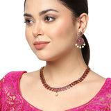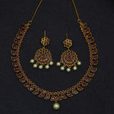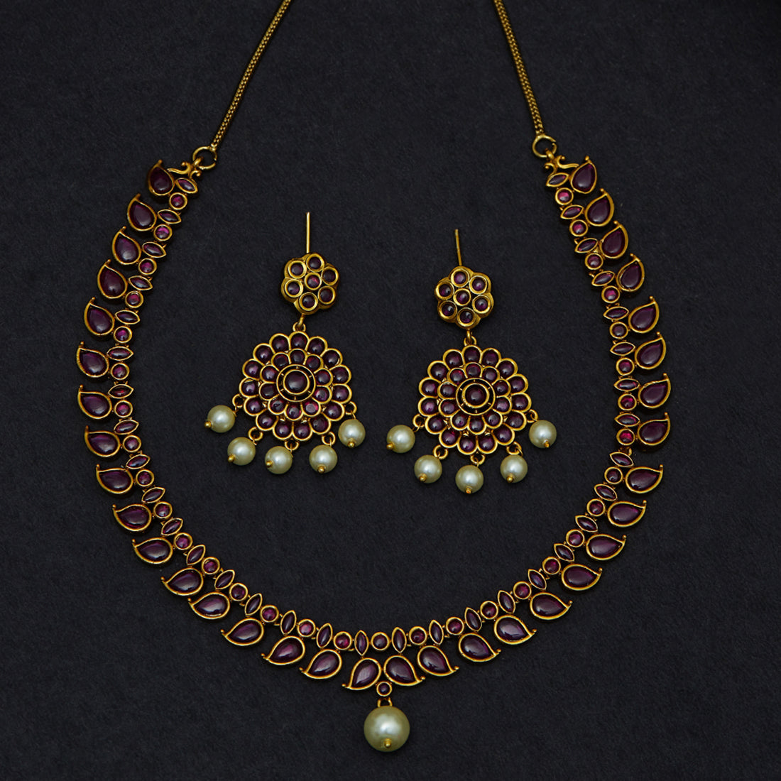 Delicate paisley and floral motifs adorned jewellery set, fashioned out of brass. Yellow gold plated for added charm and opulence, the necklace and drop earrings are lightweight and comfortable. Pair the set with a lehenga or silk saree.