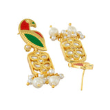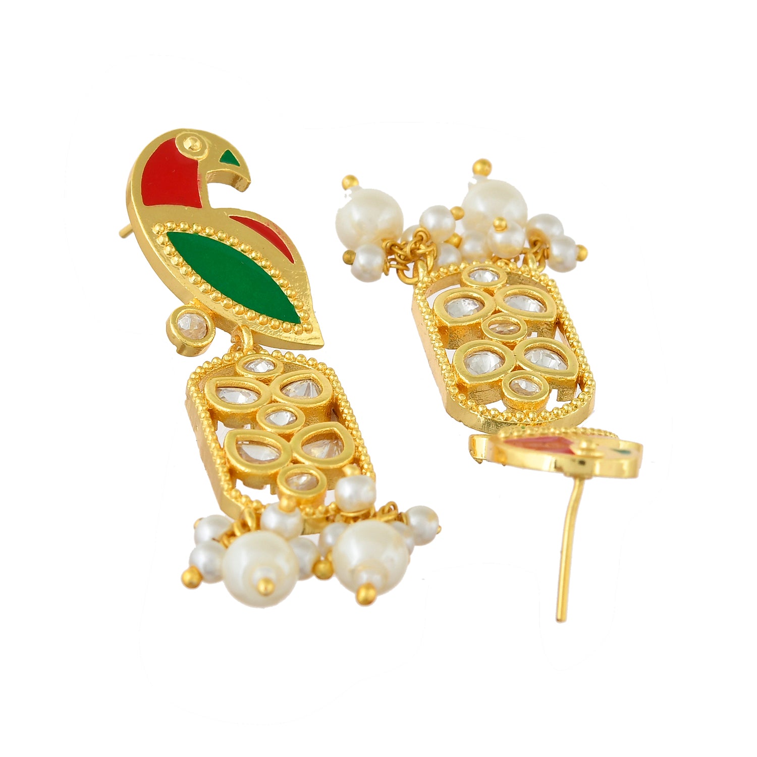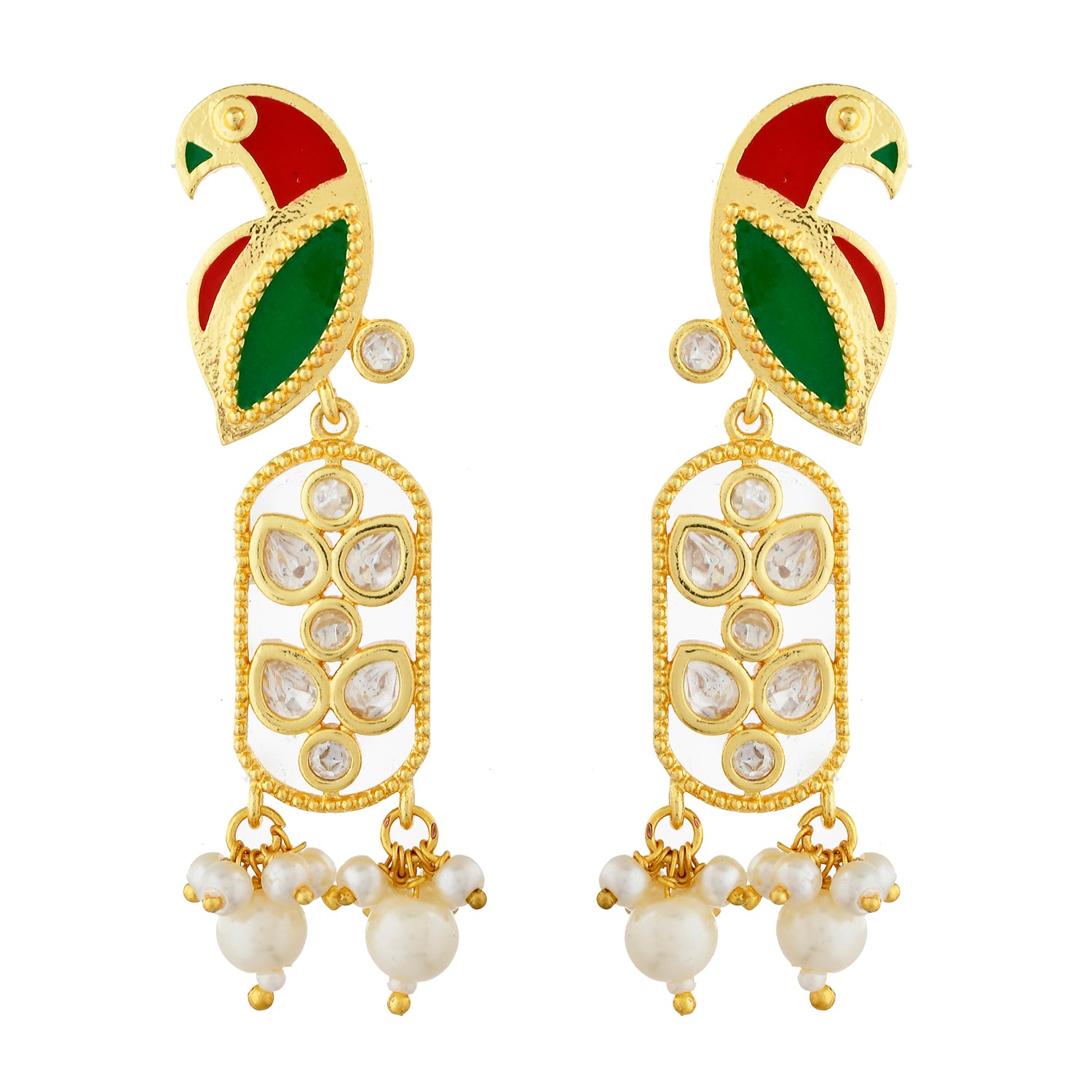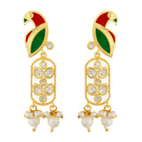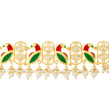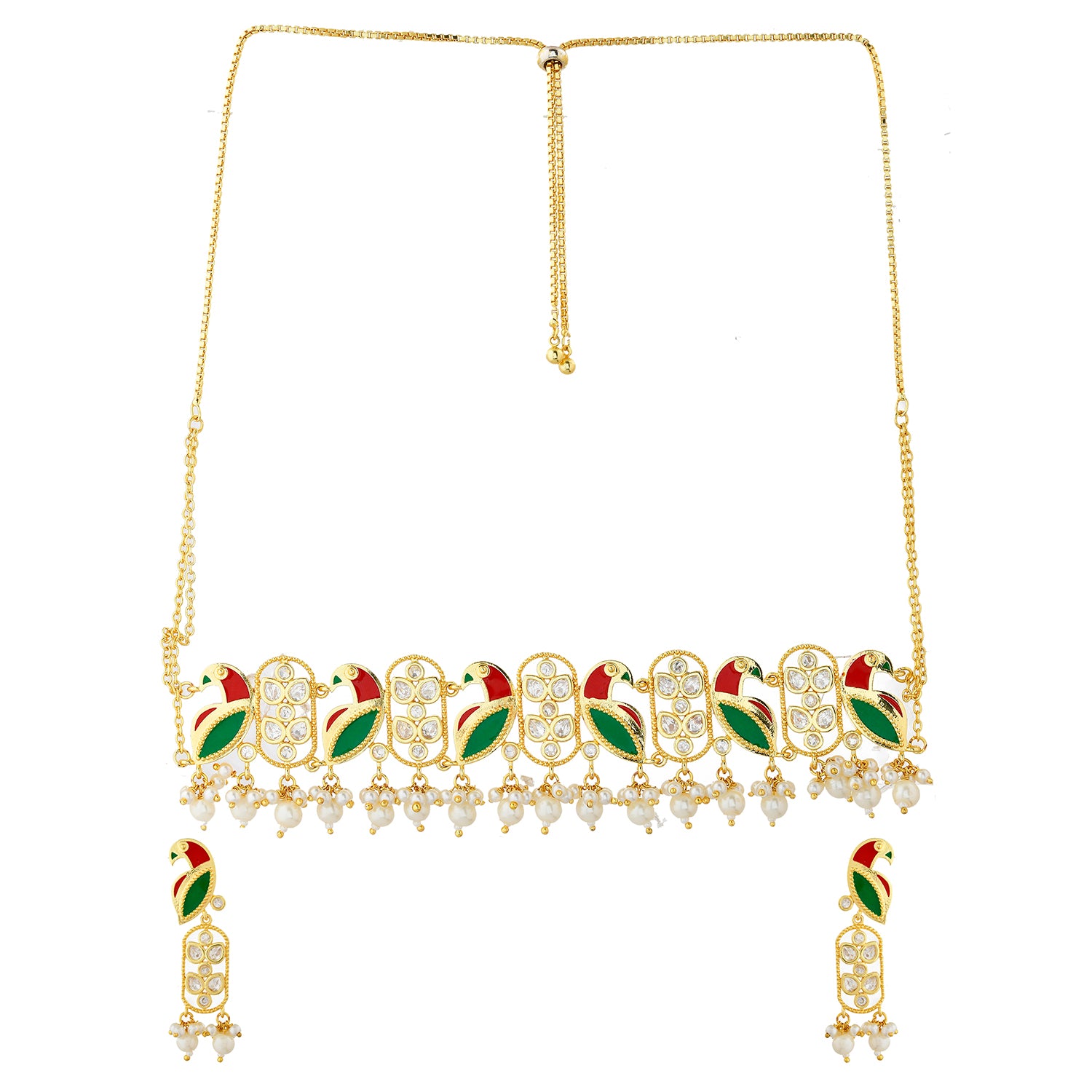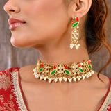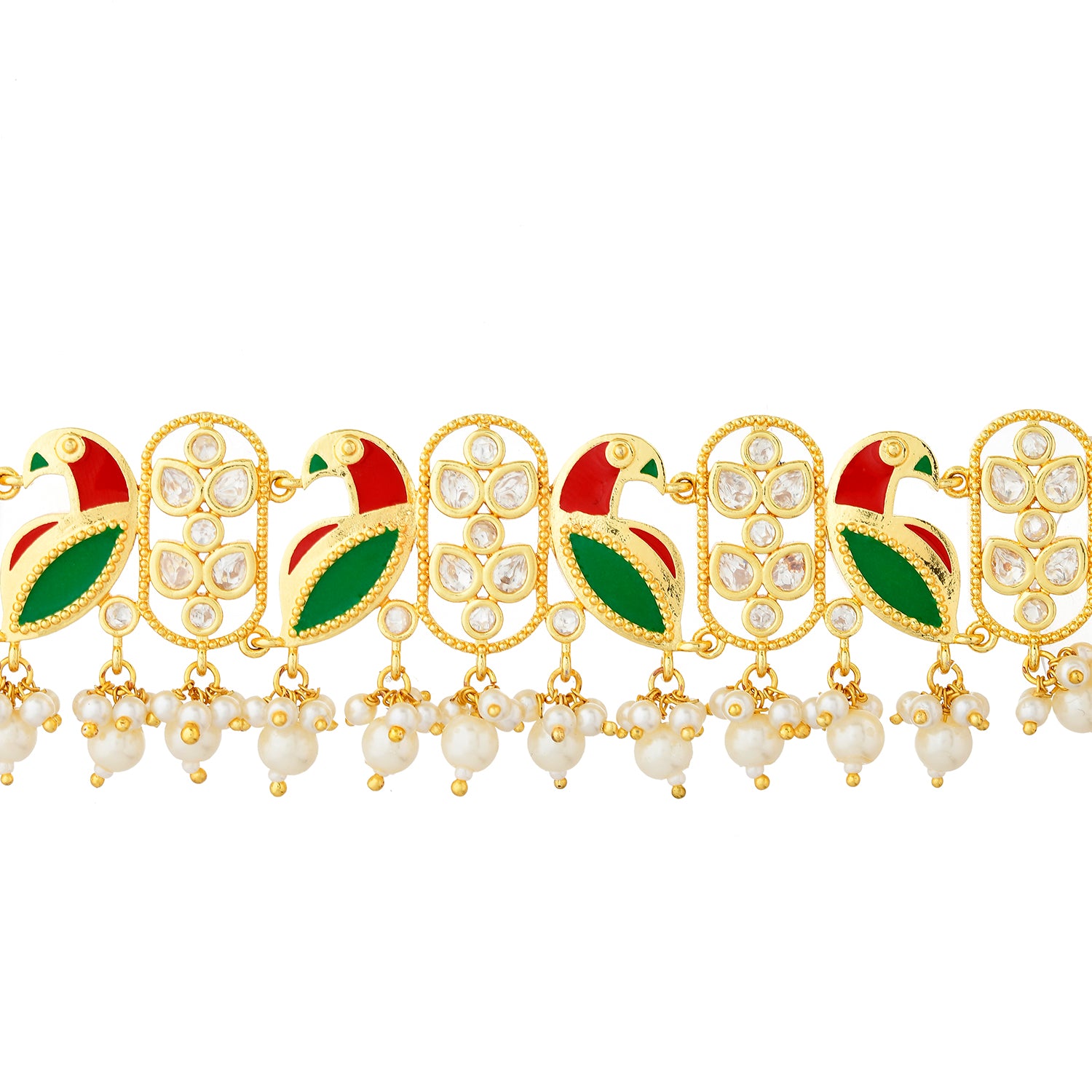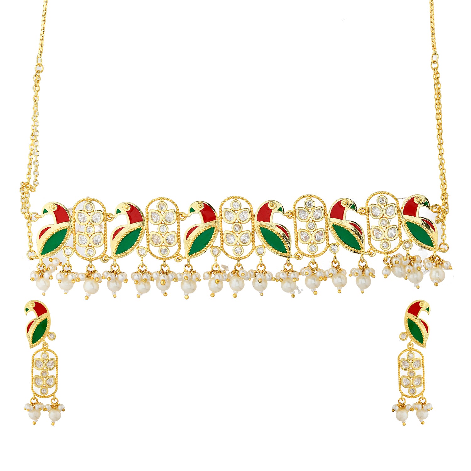 The Voylla Humera Choker Necklace Set is a stunning piece from the Panchhi collection, crafted from high-quality brass and adorned with a luxurious gold plating. This exquisite set features intricate American Diamond Kundan work, with vibrant red and green enamel accents that evoke the elegance of nature's most majestic birds. The choker is embellished with delicate pearl drops, adding a touch of sophistication and grace. Perfect for festive occasions, weddings, and parties, this necklace set is a versatile addition to any wardrobe. It makes an ideal gift for women, whether for Valentine's Day, Diwali, Raksha Bandhan, Christmas, or New Year, and is sure to delight mothers, wives, girlfriends, and sisters alike. The timeless beauty of Kundan, combined with the harmonious design, makes this set a cherished treasure symbolic of love and elegance.