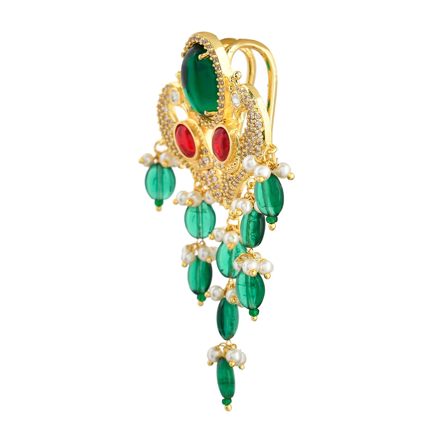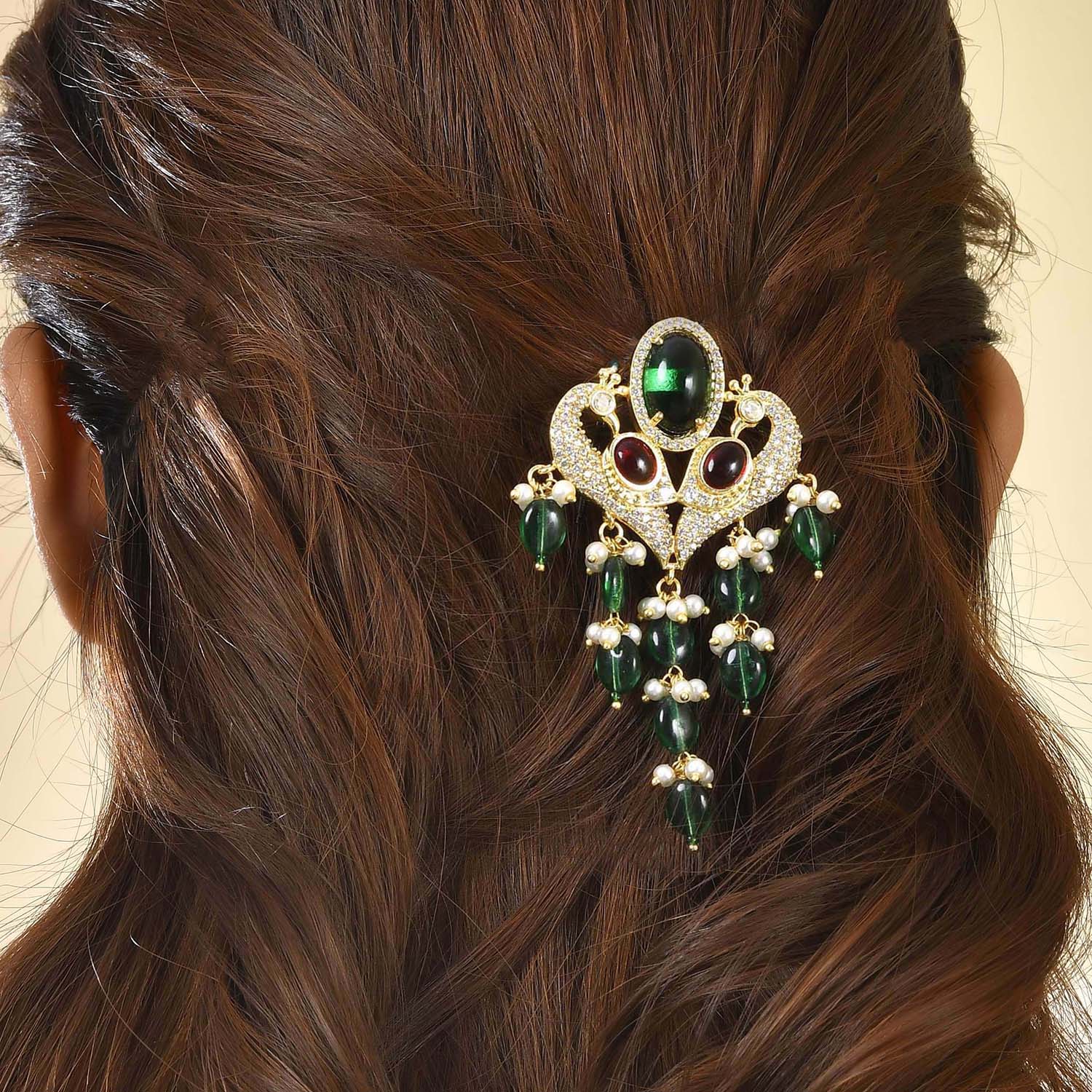 The Voylla Maurika Hair Pin from the Panchhi collection is a magnificent piece of craftsmanship. Made from high-quality brass and plated with opulent gold, this hair pin features an elaborate design adorned with American Diamond Kundan stones. The beautiful combination of vibrant green and red stones, along with delicate pearls, lends a regal and festive charm, making it perfect for special occasions like weddings, parties, and festivals. This versatile accessory can be styled with traditional attire for a sophisticated look or with contemporary outfits for a unique statement. It makes an excellent gift for women on various occasions such as ValentineÕs Day, Diwali, Raksha Bandhan, Christmas, New Year, Holi, or as a thoughtful gesture for sisters, girlfriends, wives, mothers, or lovers. This party wear hair pin is a timeless addition to any jewelry collection, and a perfect gift for any festive or celebratory moment.