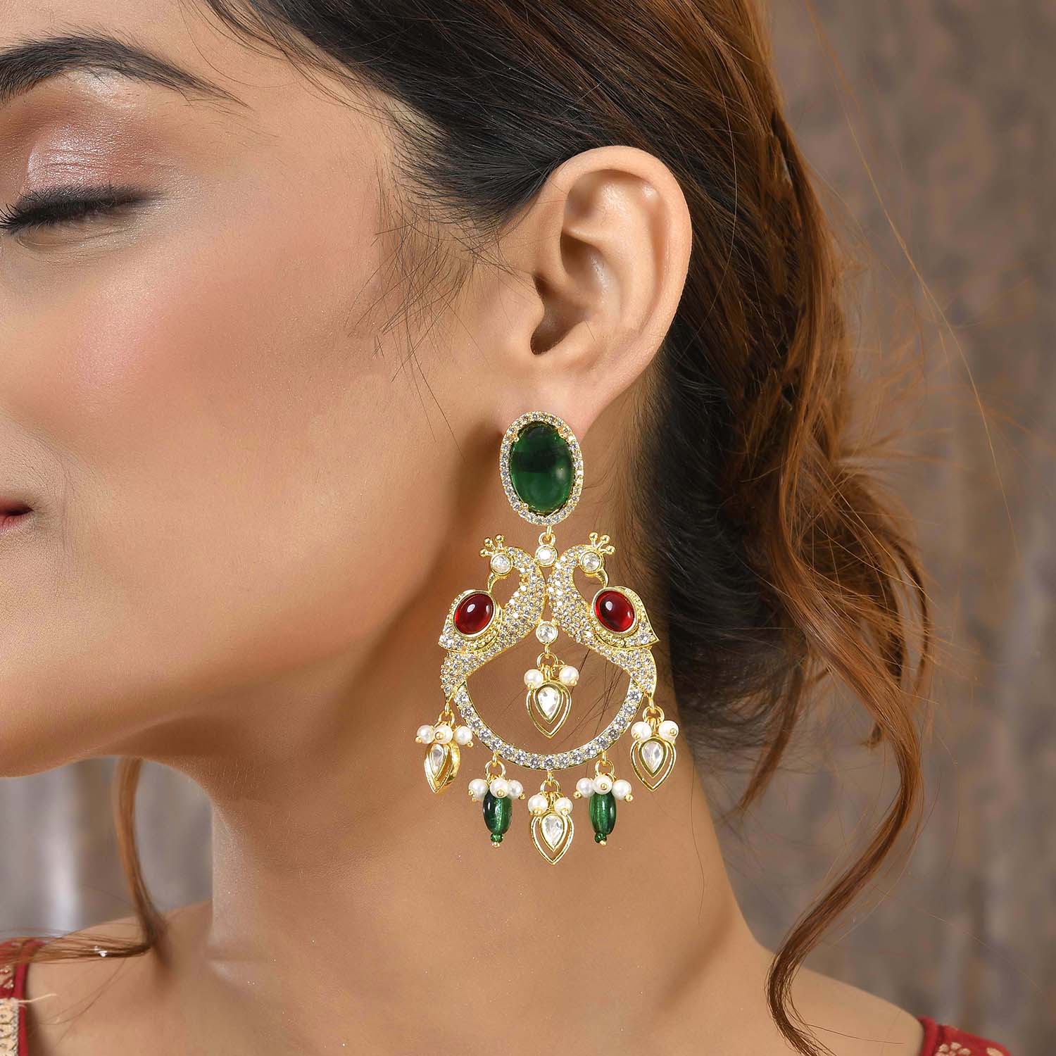 The Voylla Mayurika Chandbali Earrings, crafted from high-quality brass and finished with luxurious gold plating, are a perfect blend of traditional elegance and modern design. Part of the Panchhi collection, which is inspired by the grace of natureÕs most majestic birds, these earrings feature intricate peacock motifs that symbolize beauty, love, and grace. Adorned with exquisite American Diamond Kundan stones, the vibrant green and red hues, paired with delicate pearl accents, create a captivating contrast that enhances their beauty. Perfect for festive occasions like Diwali, Rakshabandhan, Holi, or weddings, these earrings are versatile enough to complement both traditional and contemporary outfits. Styling tip: wear them with a classic saree or a chic cocktail dress for an effortlessly elegant look. They make an excellent gift for women, ideal for ValentineÕs Day, Christmas, New Year, or as a token of love for sisters, girlfriends, wives, mothers, or lovers. Each piece in this collection symbolizes harmony, elegance, and the sacred union of two souls, making them a timeless addition to any jewelry collection.