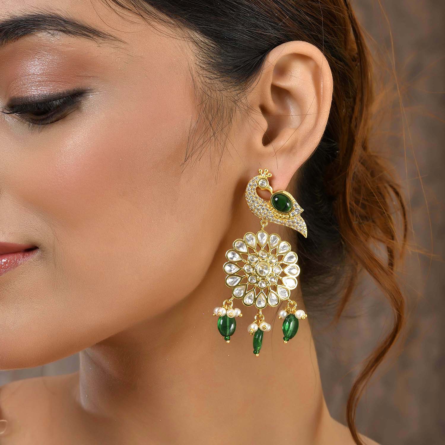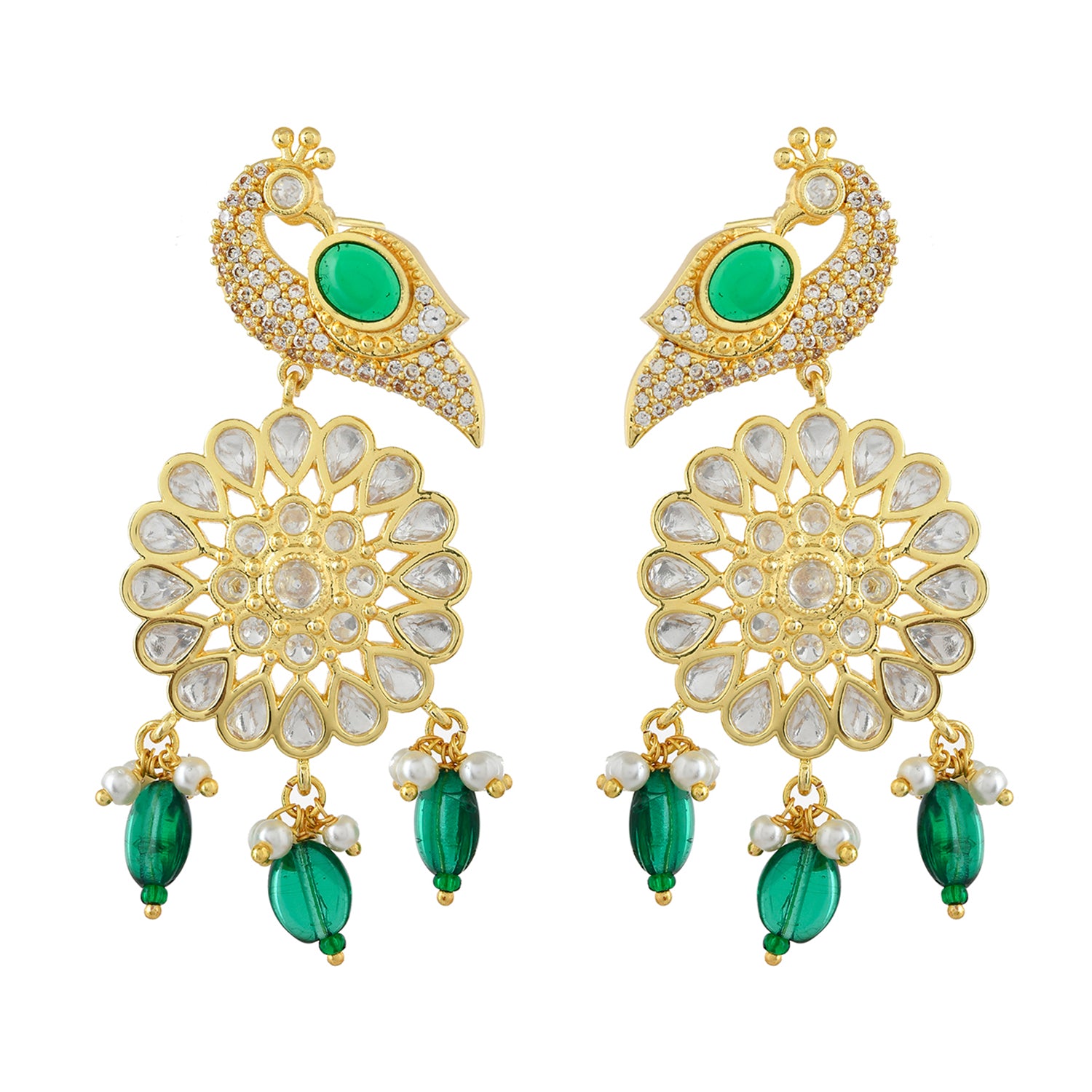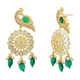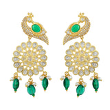 Introducing the exquisite Voylla Mayurika Dangler Earrings from the Panchhi collection, a perfect blend of intricate design and top-notch quality. Crafted from premium brass and adorned with luxurious gold plating, these earrings showcase a stunning peacock motif embellished with American Diamond Kundan work and a central green gem, symbolizing harmony and grace. The danglers are further accentuated with delicate pearls and vibrant green beads, making them a versatile accessory for festive occasions, weddings, and parties. Whether paired with traditional or contemporary outfits, these earrings add a touch of sophistication and elegance. They make an exceptional gift for women, ideal for occasions like Diwali, Rakshabandhan, Valentine's Day, Christmas, and New Year. Perfect for your sister, girlfriend, wife, mother, or as a delightful self-indulgence, these earrings are a timeless treasure that will be cherished for years to come.