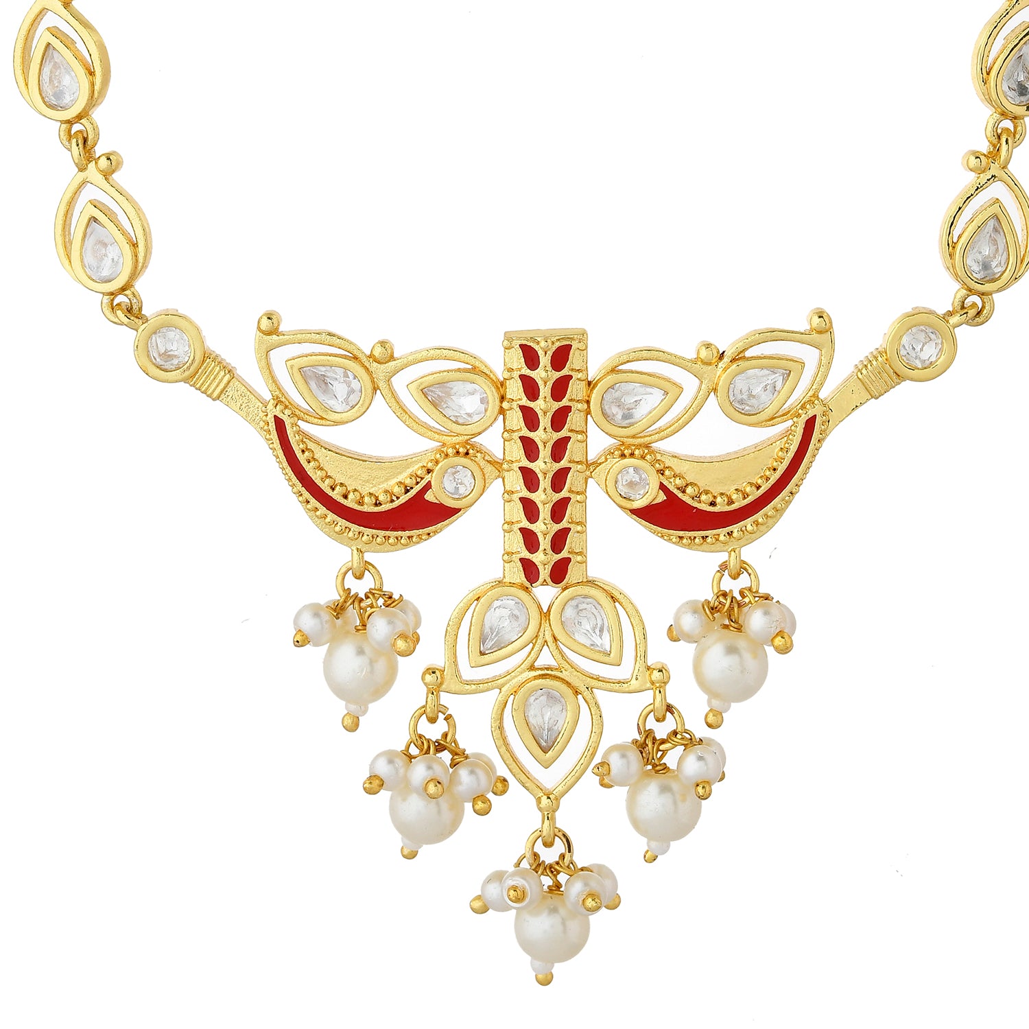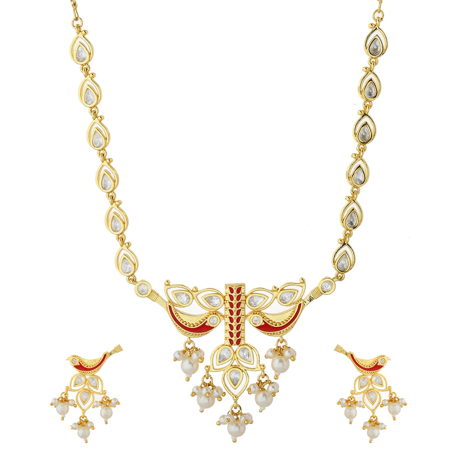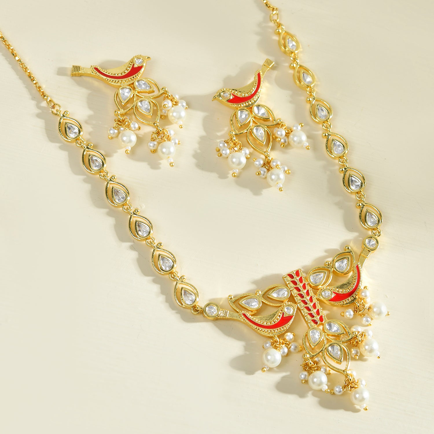 The Voylla Papiha Necklace Set from the Panchhi collection is a breathtaking piece that embodies timeless elegance and intricate craftsmanship. Made from high-quality brass and lavishly plated in gold, this set features exquisite American Diamond Kundan work, inspired by the graceful beauty of nature's most majestic birds, including the charming sparrow. The necklace showcases teardrop-shaped stones, delicate pearl-like beads, and intricate sparrow motifs, creating a harmonious blend of sophistication and charm. Perfect for festive occasions, weddings, and parties, the vibrant hues of gold, red, and white add a touch of splendor to any attire. This necklace set makes a thoughtful and cherished gift for women, whether it's for ValentineÕs Day, Diwali, Rakshabandhan, Christmas, or New Year, and is ideal for sisters, girlfriends, wives, mothers, and lovers. A symbol of love and harmony, the Voylla Papiha Necklace Set is a must-have for every jewelry collection and an elegant addition to any bride's trousseau.