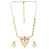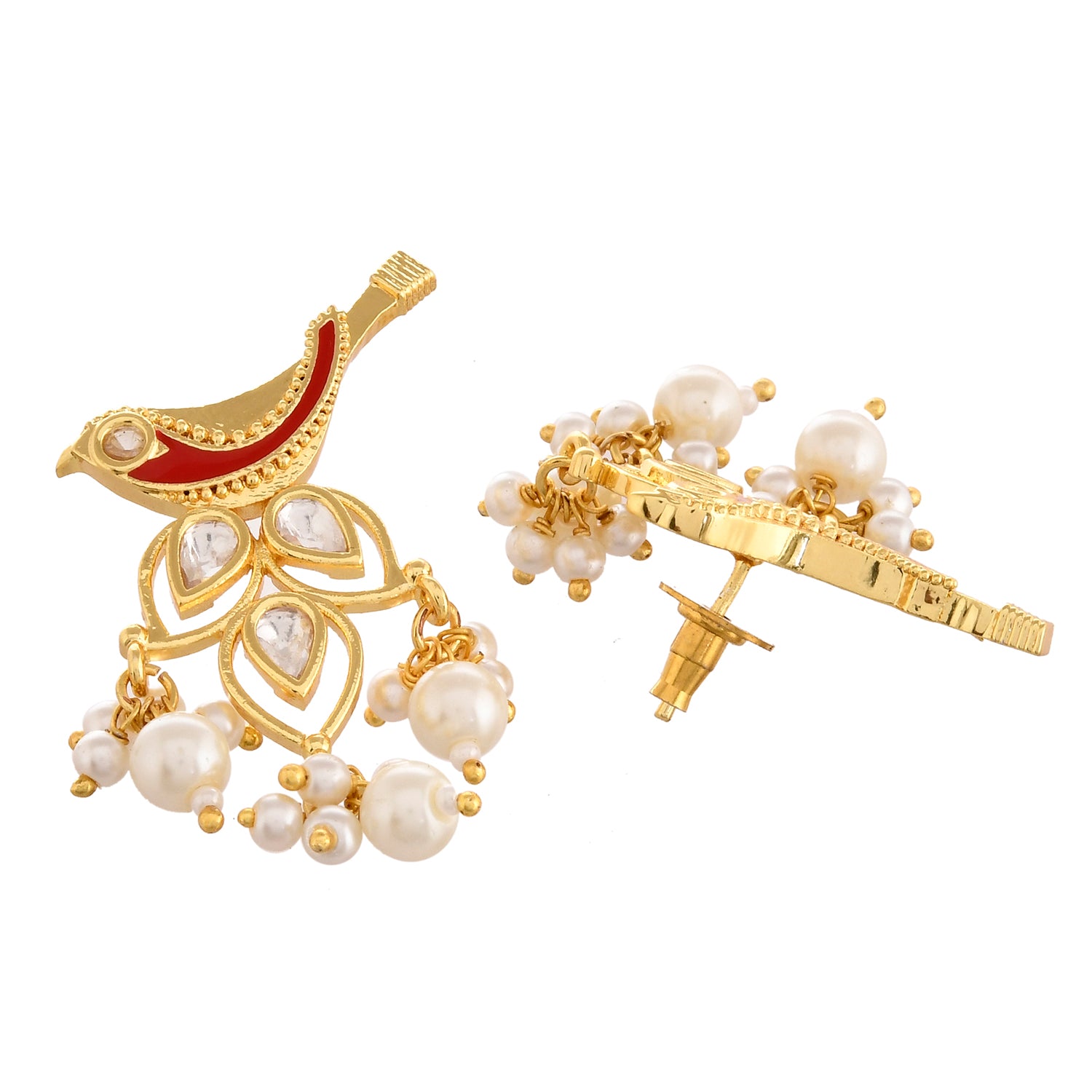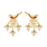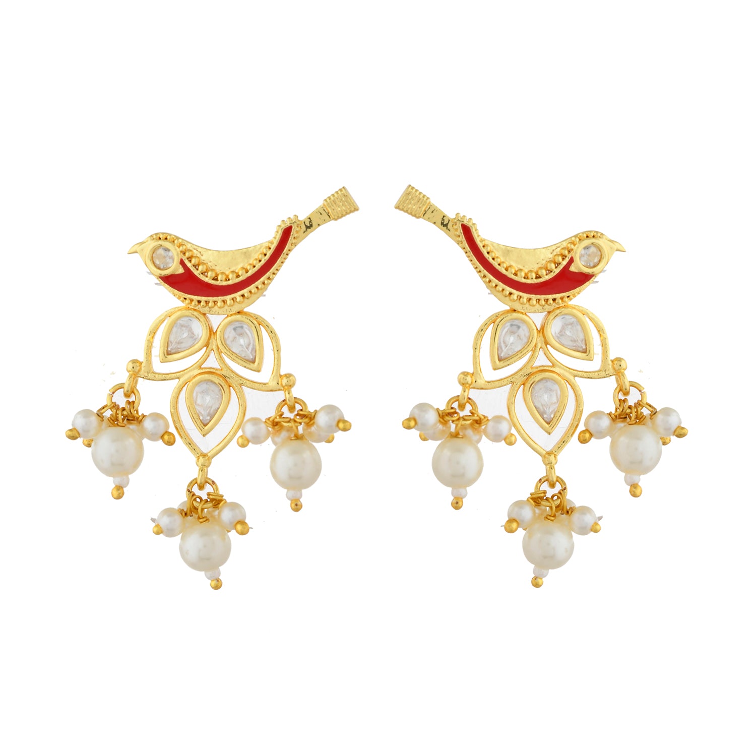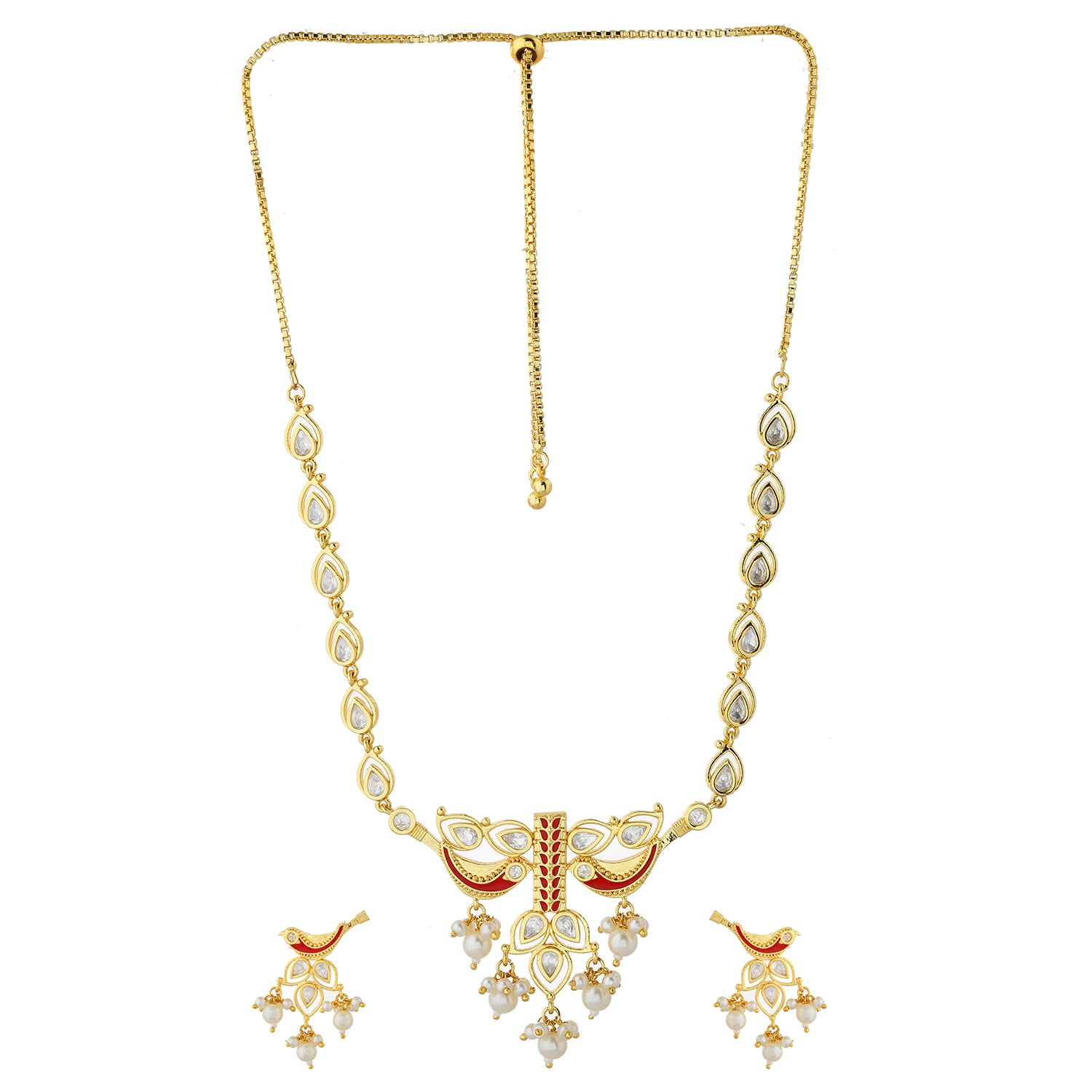 The Voylla Papiha Necklace Set from the Panchhi collection is a breathtaking piece that embodies timeless elegance and intricate craftsmanship. Made from high-quality brass and lavishly plated in gold, this set features exquisite American Diamond Kundan work, inspired by the graceful beauty of nature's most majestic birds, including the charming sparrow. The necklace showcases teardrop-shaped stones, delicate pearl-like beads, and intricate sparrow motifs, creating a harmonious blend of sophistication and charm. Perfect for festive occasions, weddings, and parties, the vibrant hues of gold, red, and white add a touch of splendor to any attire. This necklace set makes a thoughtful and cherished gift for women, whether it's for ValentineÕs Day, Diwali, Rakshabandhan, Christmas, or New Year, and is ideal for sisters, girlfriends, wives, mothers, and lovers. A symbol of love and harmony, the Voylla Papiha Necklace Set is a must-have for every jewelry collection and an elegant addition to any bride's trousseau.