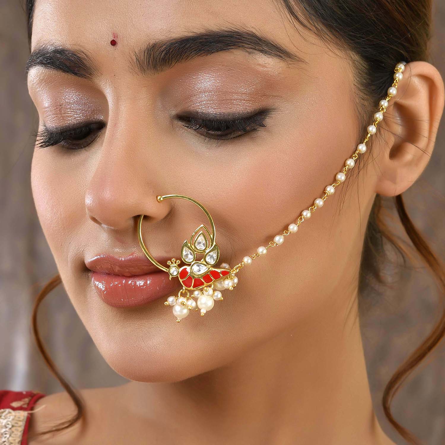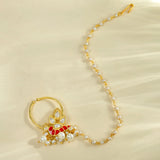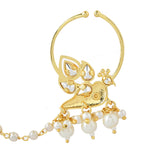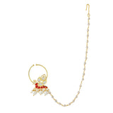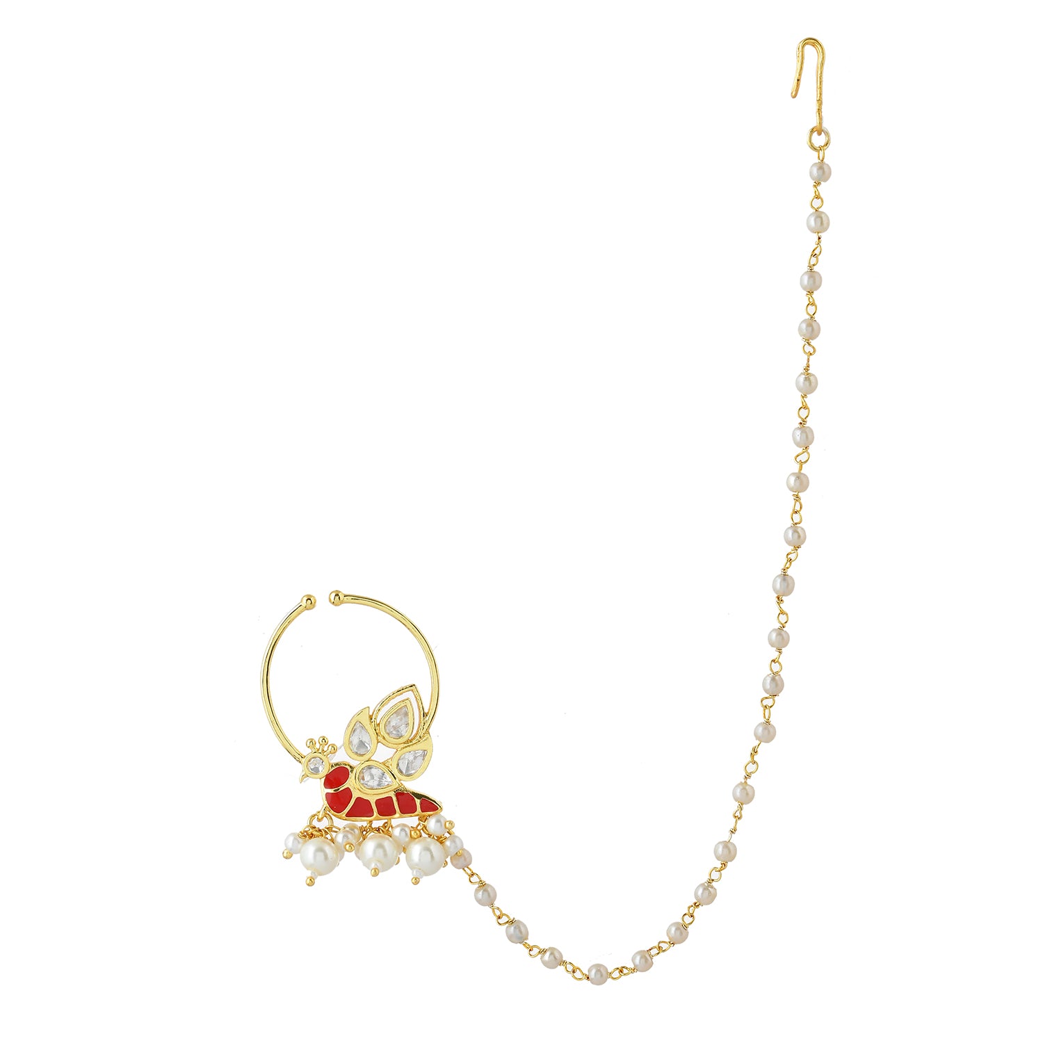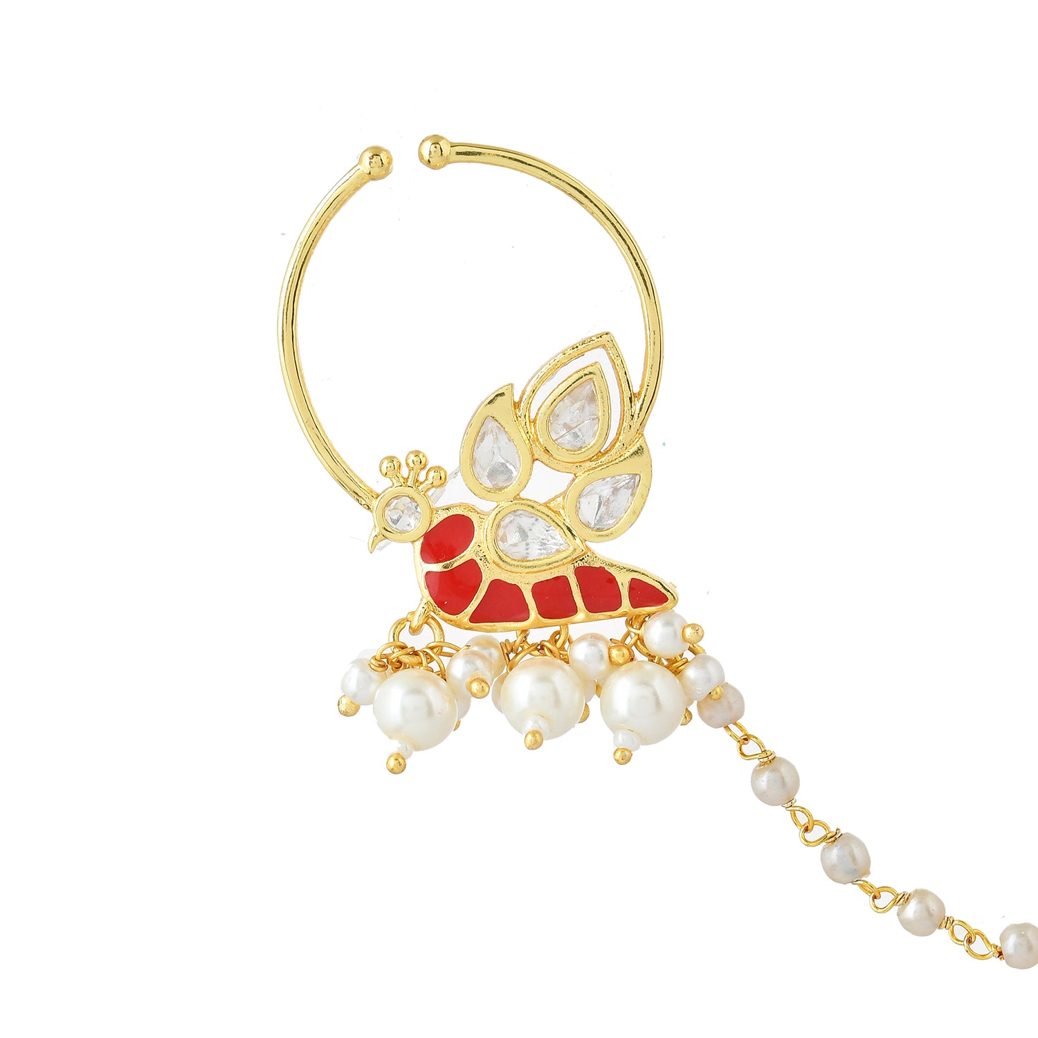 The Voylla Pariniti Nose Ring from the Panchhi collection is a stunning piece of jewelry crafted from high-quality brass with a luxurious gold plating. This exquisite nose ring features intricate American Diamond Kundan work, beautifully complemented by delicate red enamel detailing and dangling pearl accents, embodying the elegance of nature's most majestic birds. Perfect for festive occasions, weddings, and parties, this nose ring adds a touch of sophistication and grace to any outfit. It makes an ideal gift for women, whether for Valentine's Day, Diwali, Rakshabandhan, Christmas, New Year, or any special occasion, and is sure to be cherished by sisters, girlfriends, wives, mothers, and lovers alike. The timeless design and superior craftsmanship make it a must-have addition to every bride's trousseau, symbolizing harmony, elegance, and the sacred union of two souls.