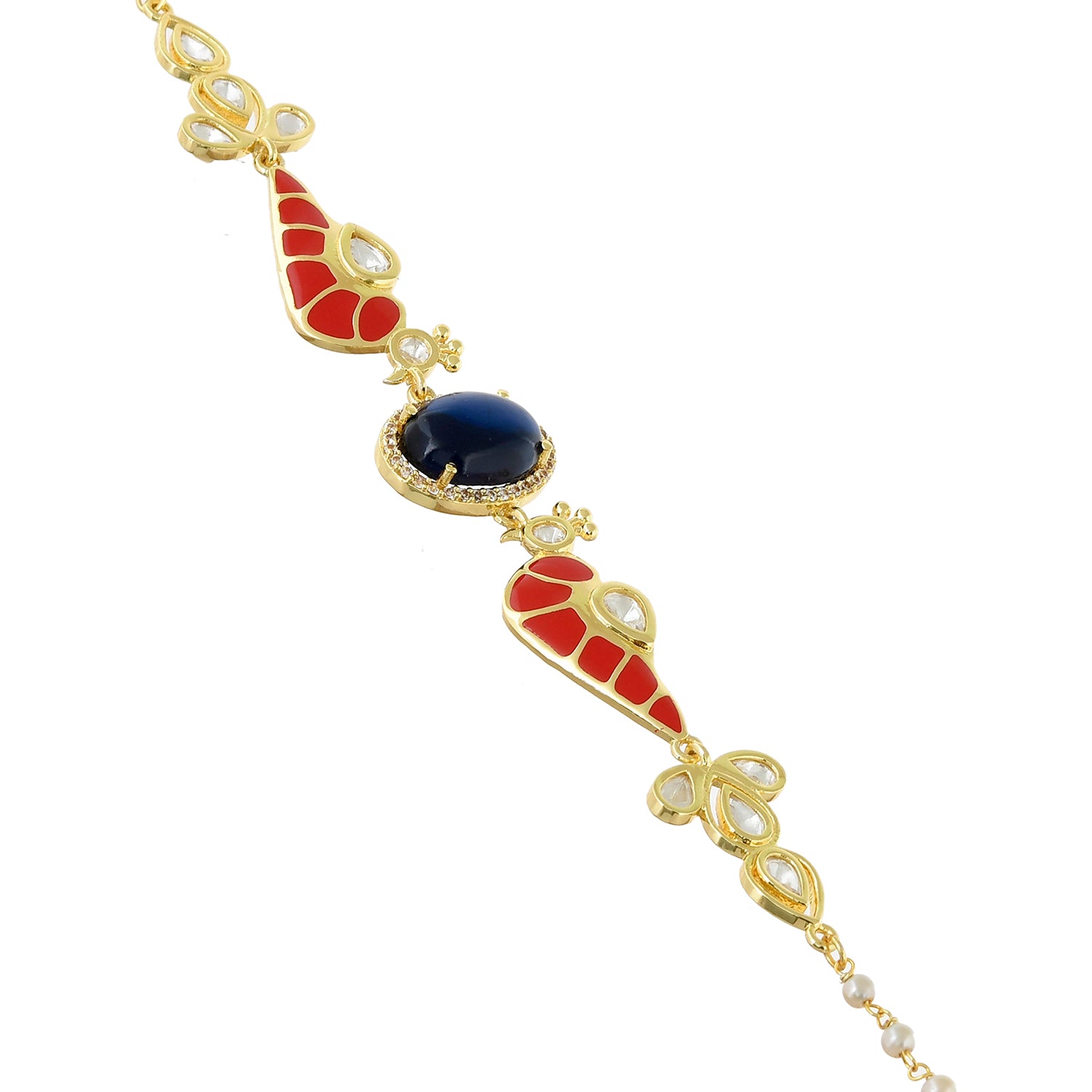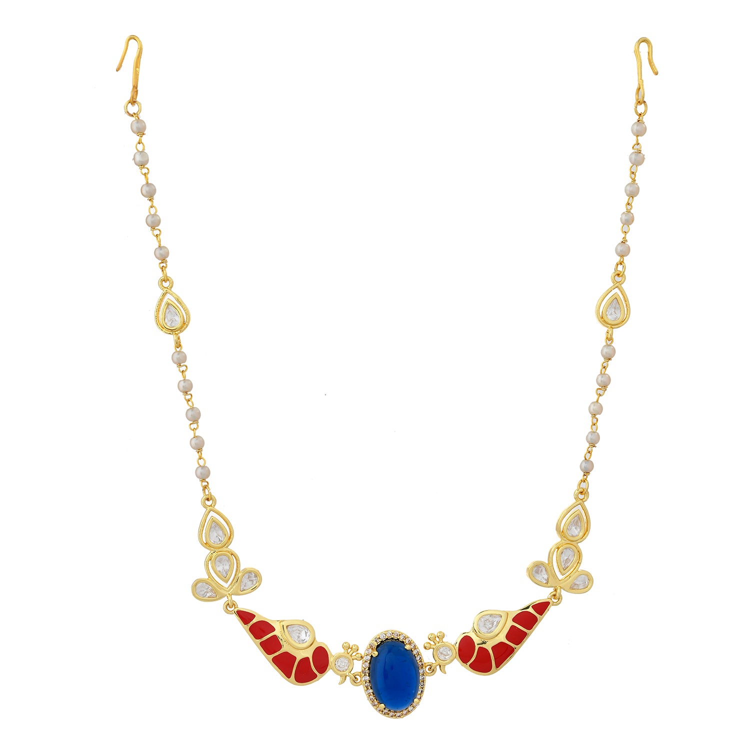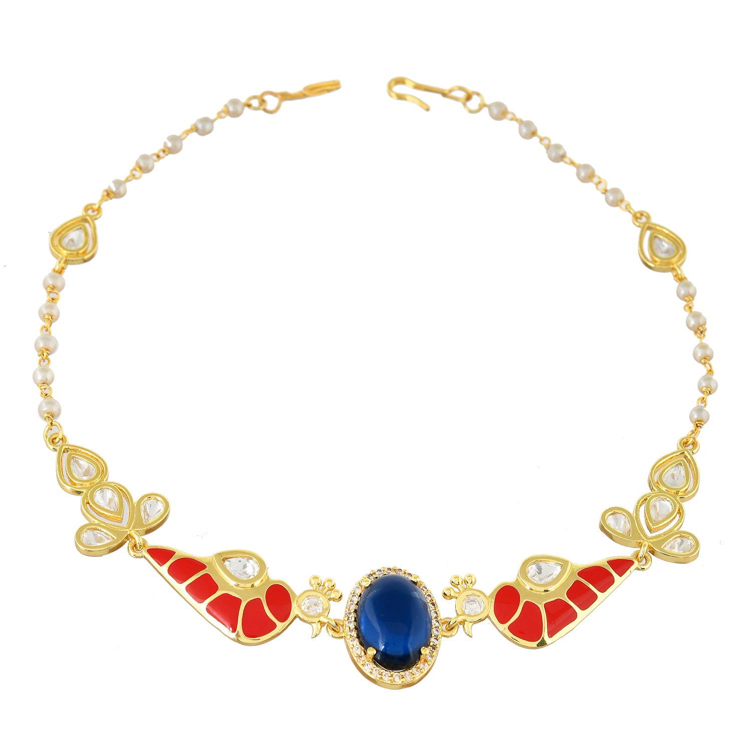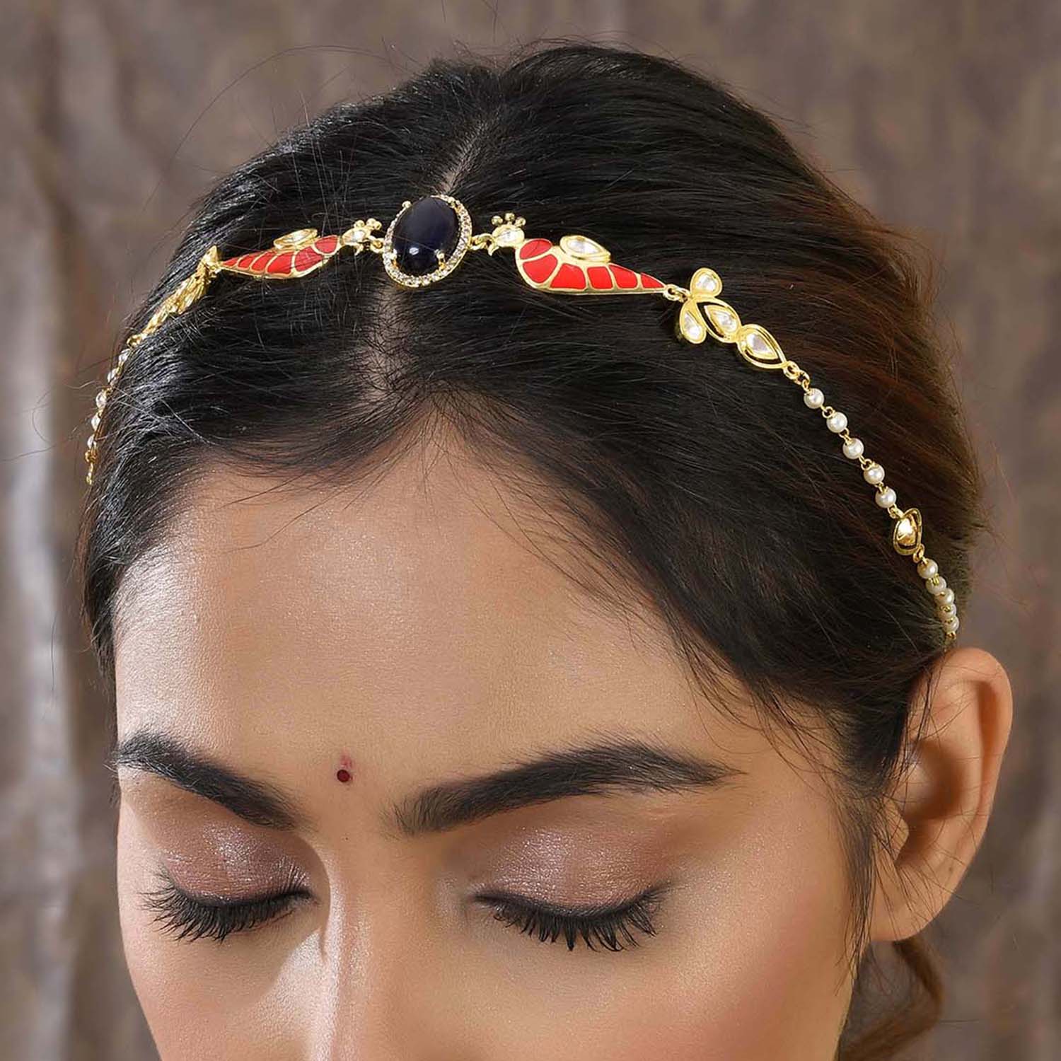The Voylla Pariniti Sheeshpatti hair accessory is a stunning piece crafted from high-quality brass with a luxurious gold plating. Part of the Panchhi collection, this Sheeshpatti is adorned with American Diamond Kundan stones, featuring an intricate design that includes a central deep blue stone surrounded by delicate red and white enamel work. The accessory is perfect for women looking to add a touch of elegance to their festive, wedding, or party wear. Its vibrant colors and exquisite craftsmanship make it an ideal gift for occasions like Diwali, Rakshabandhan, ValentineÕs Day, Christmas, and New Year. Whether for a sister, girlfriend, wife, or mother, this Sheeshpatti is a timeless treasure that symbolizes harmony and elegance, making it a cherished addition to any jewelry collection. Inspired by the elegance of nature's most majestic birds, the Panchhi collection captures the essence of love and grace with the ageless beauty of Kundan, making it a must-have for every brideÕs trousseau.
