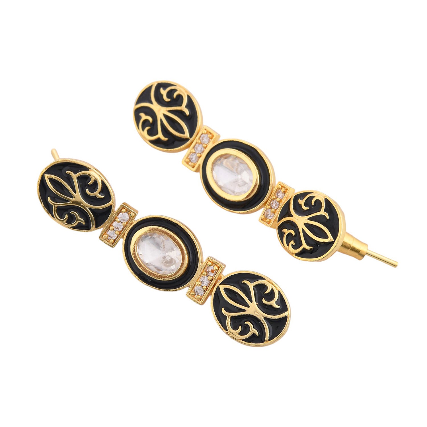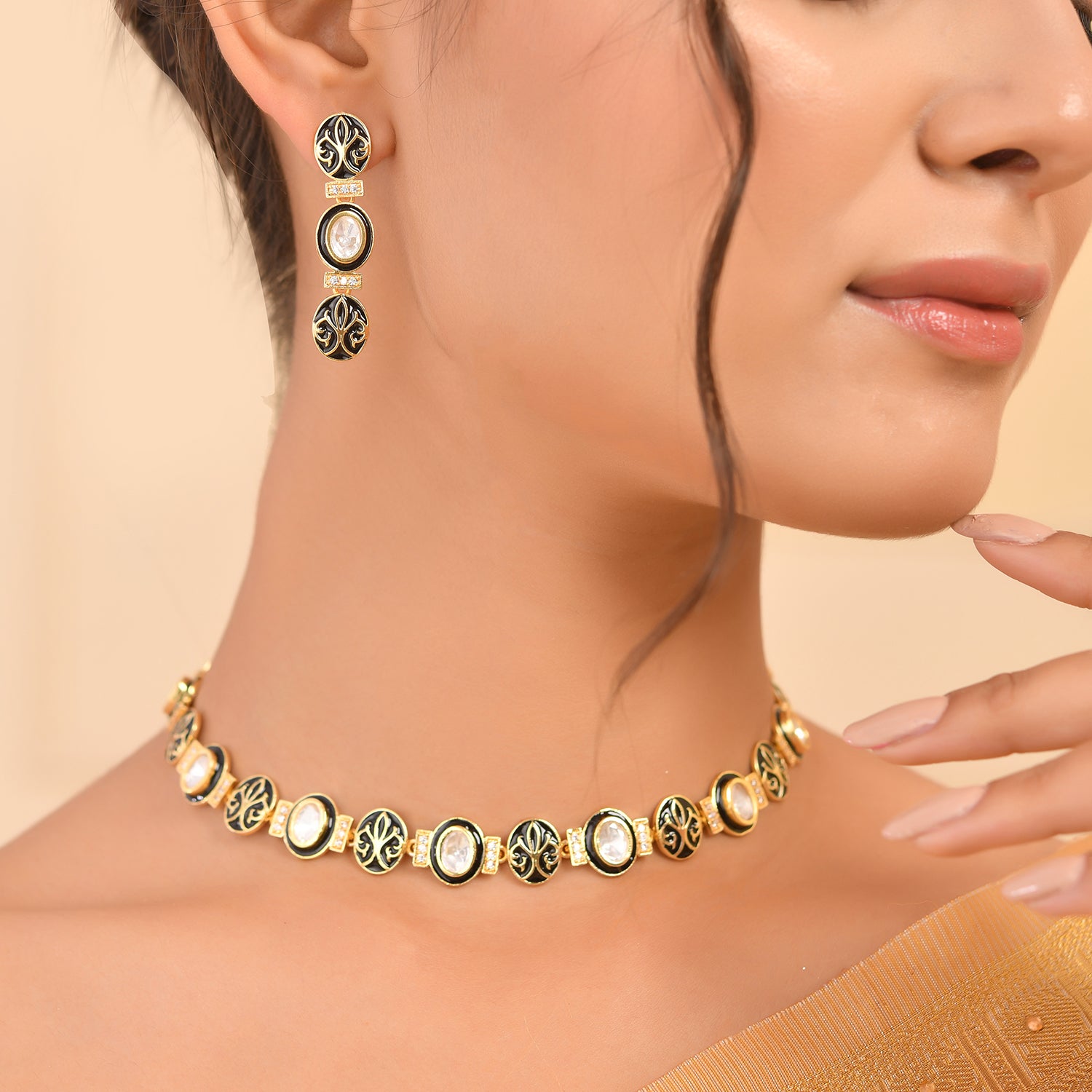Voylla's Pashmina Collection, a stunning tribute to the intricate artistry of traditional Pashmina shawls and Baroque opulence. Each piece, from the Regal Floral Necklace with its gold-embossed floral motifs and sparkling reverse American diamonds, to the Baroque Elegance Earrings that blend vintage charm with modern sophistication, exudes refined luxury. The Majestic Cuff Bracelet offers a bold statement with its elaborate design, while the Imperial Ring add a touch of classic allure to any ensemble.Adorn yourself with pieces that transform every moment into a celebration of style and heritage.