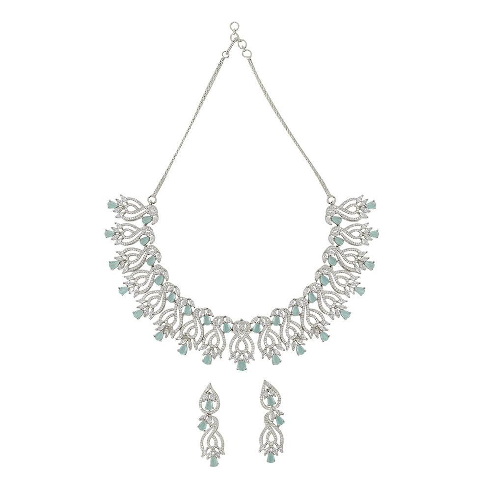 Silver plated brass jewellery set with green and white zircons gemstones in a classic cluster setting. Pair with a designer saree.Caring for your fashion jewelry: We, at Voylla, take care of every piece of jewelry so that you don't spend...