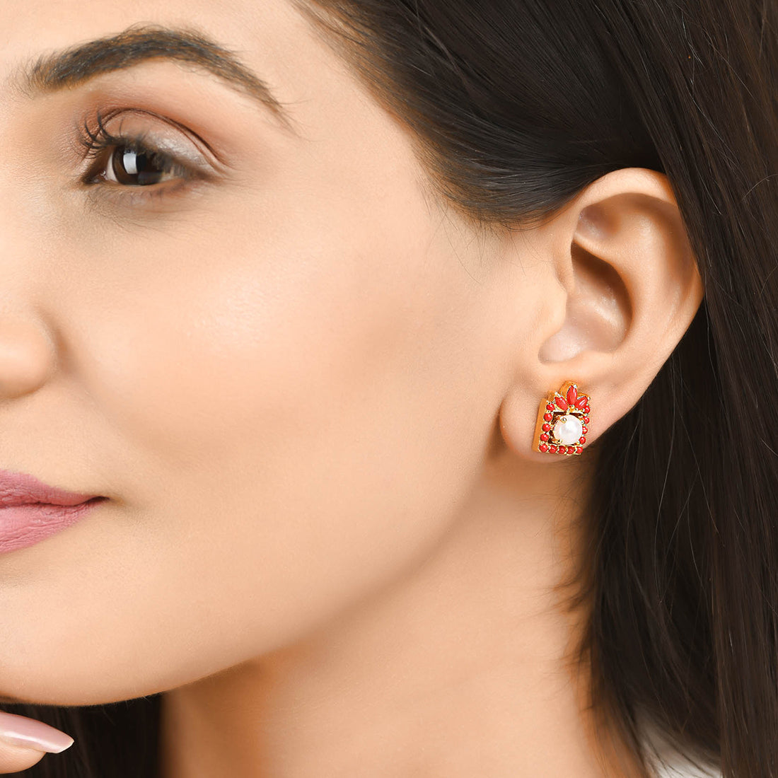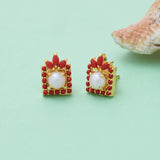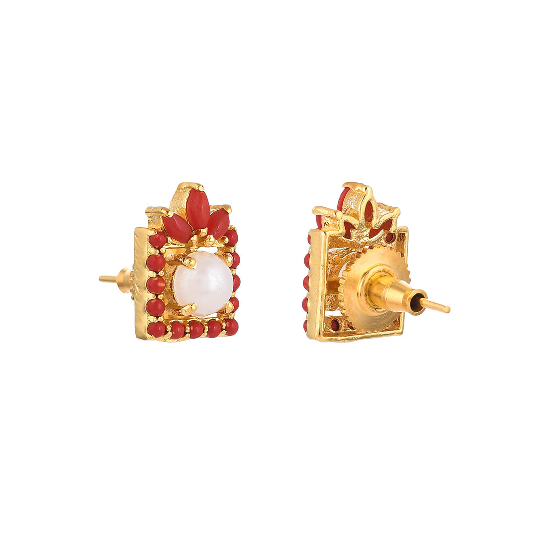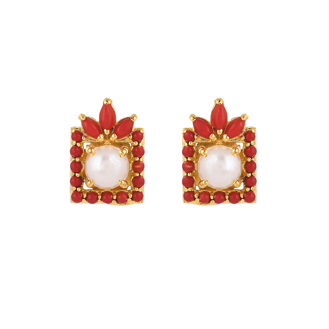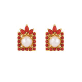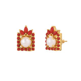 Brass stud earrings with white pearl beads and red zirconia gemstones. Gold plated and a good match for casual looks.
