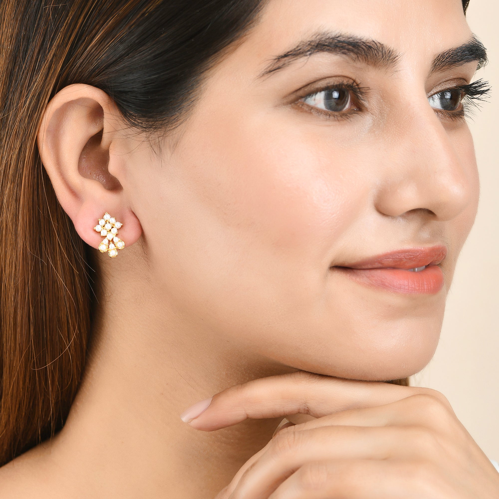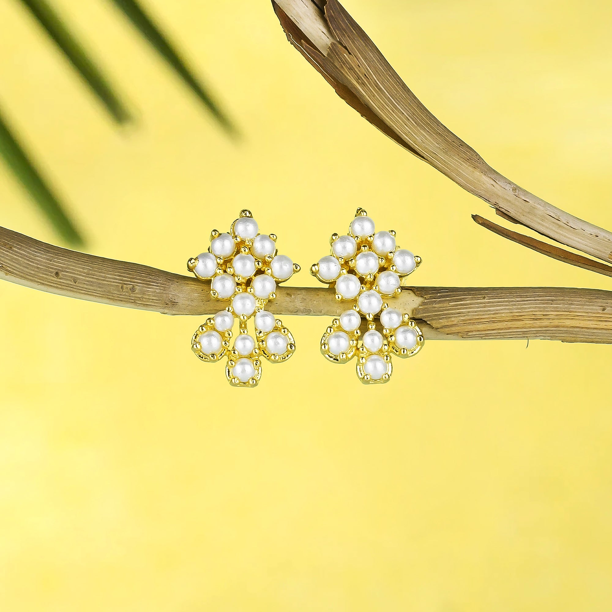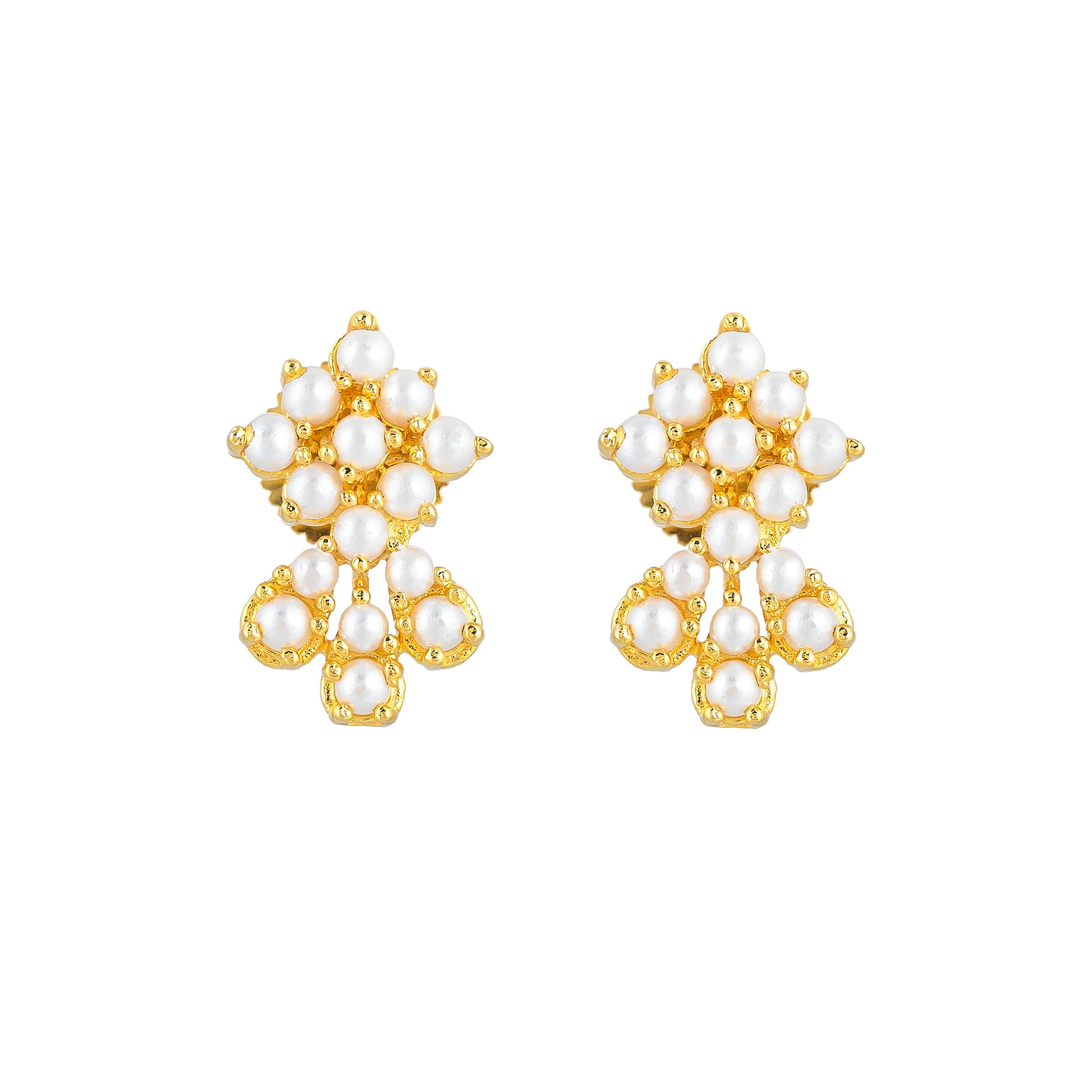 Gold plated stud earrings with pearl beads. Made from brass and perfect for casual looks of all kinds.