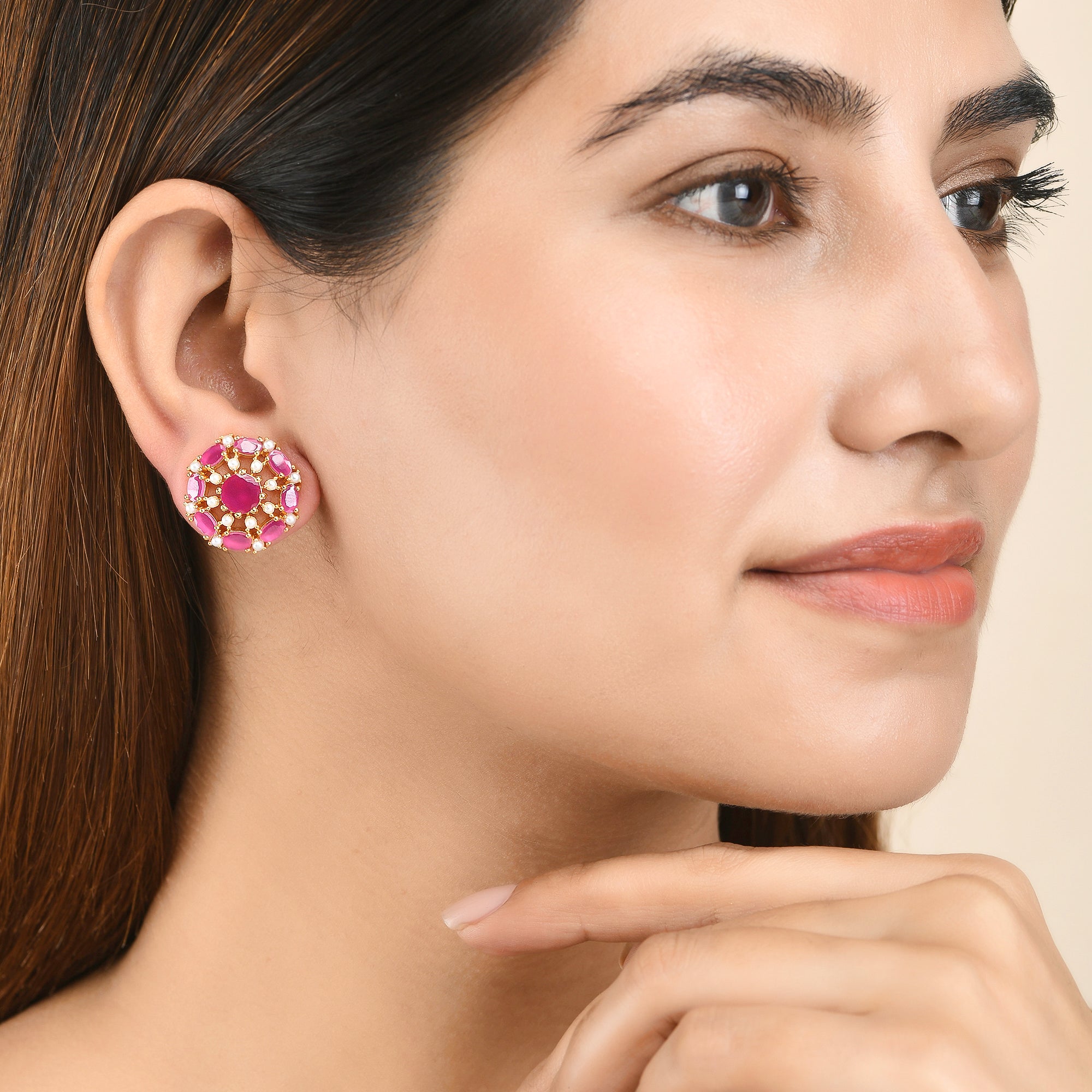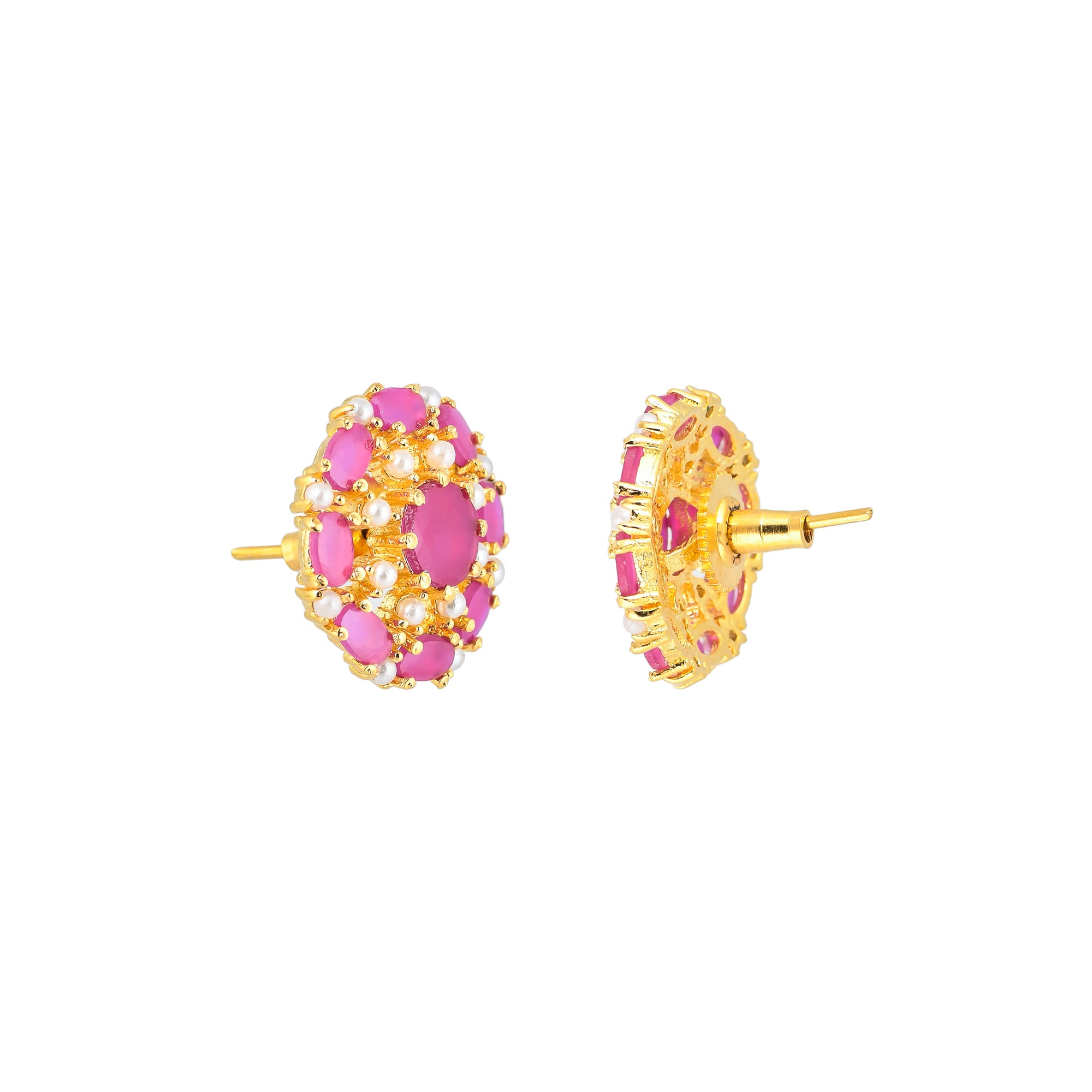 Pearl beaded stud earrings with pink CZ gemstones. Gold plated and made from brass. Lightweight, comfortable and versatile.