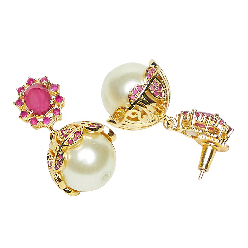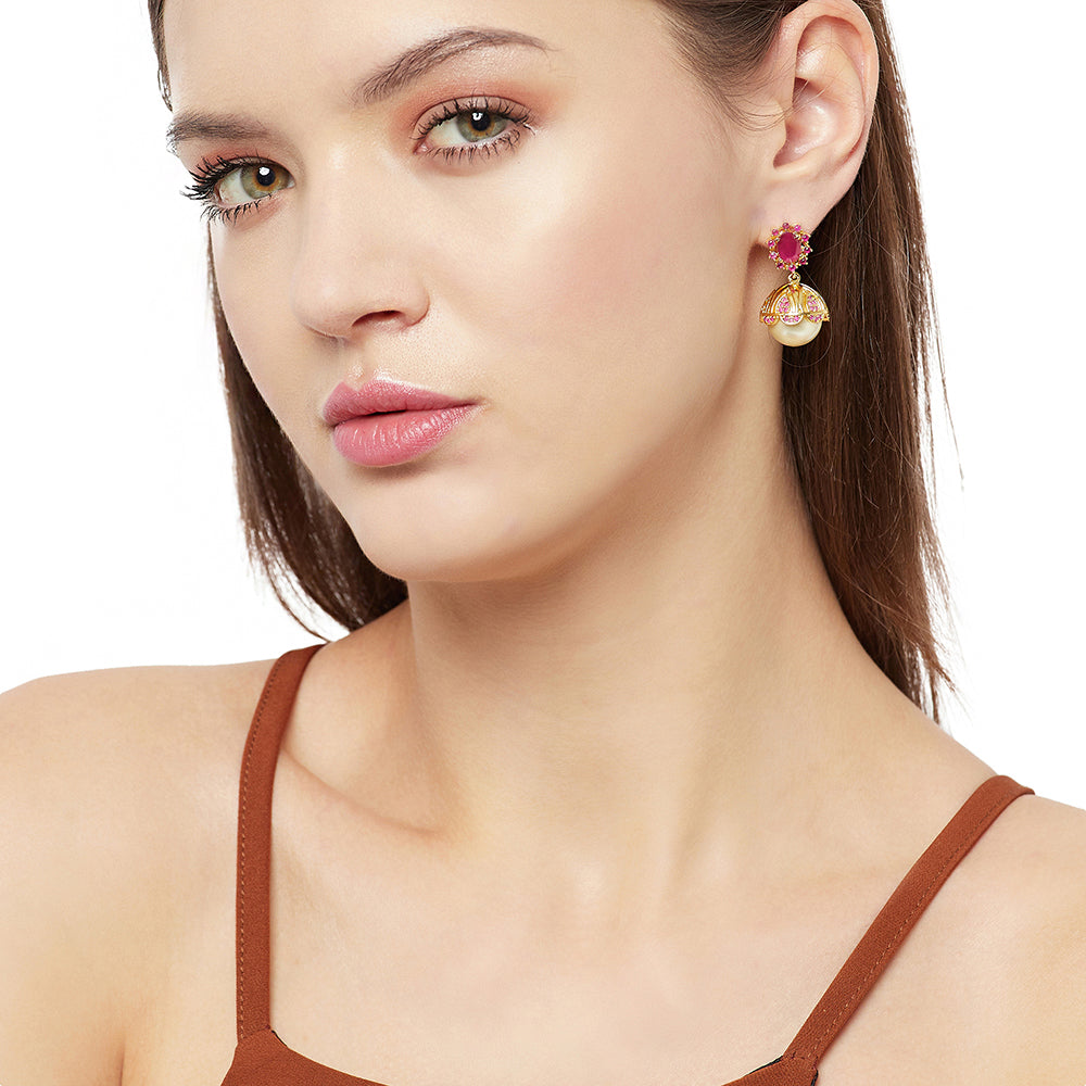 Add immeasurable elegance to your ethnic ensemble by putting on these gold toned earring pair studded with pearl beads and embellished with CZ sparkles.Match it with your attire for a glamorous look.