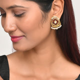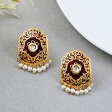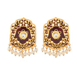 Pearl Elegance Maroon Enamel Faux Pearls Brass Gold Plated Floral Earrings