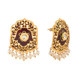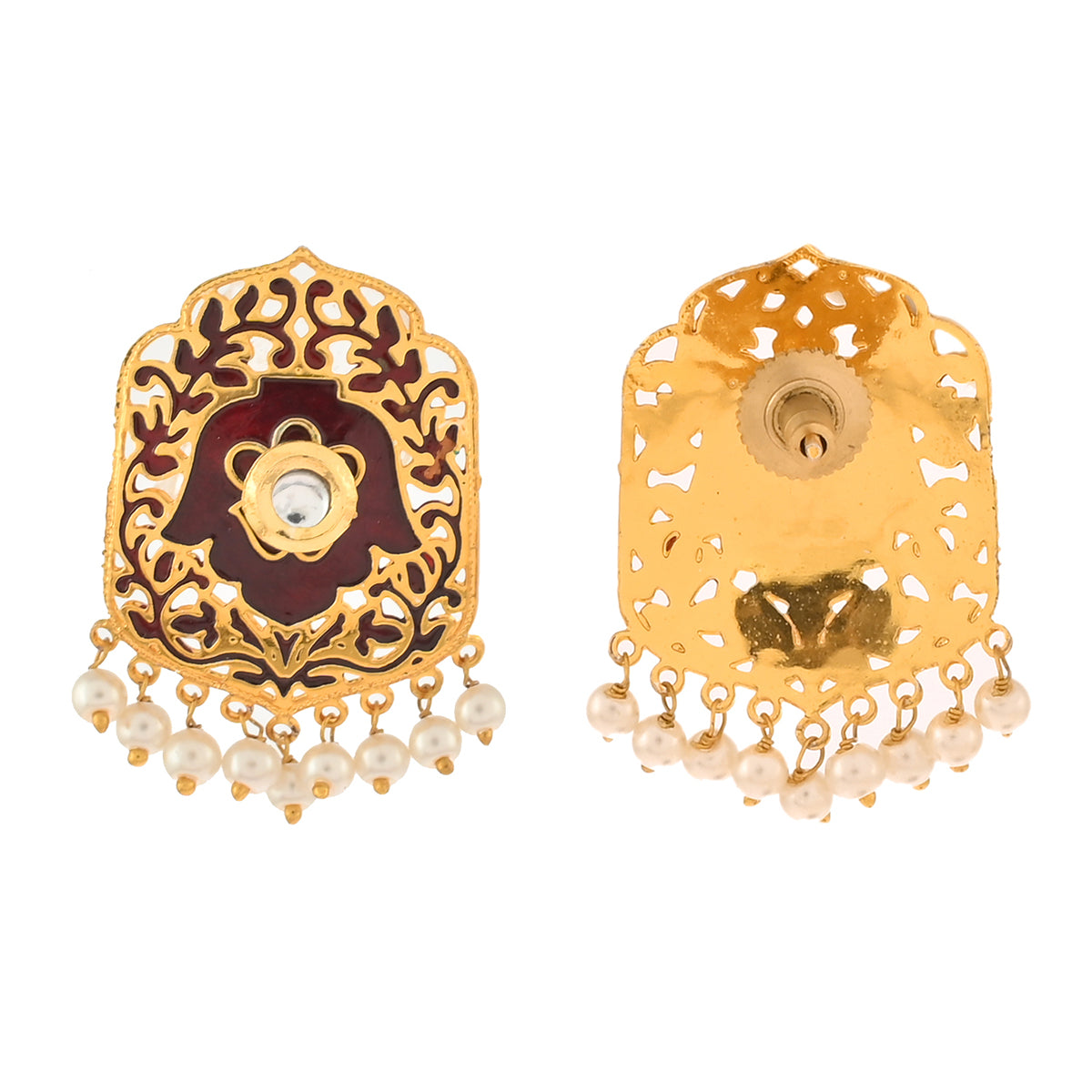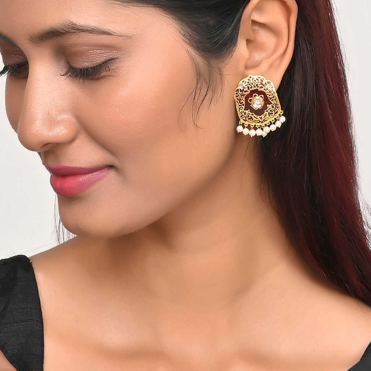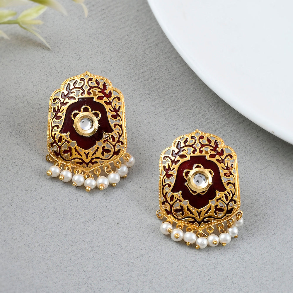 Maroon enamelled floral earrings, made from brass and yellow gold plated. The delicate pair has been embellished with faux white pearls. Wear the earrings with any of your favourite ethnic outfits.