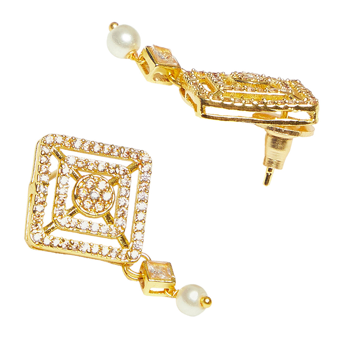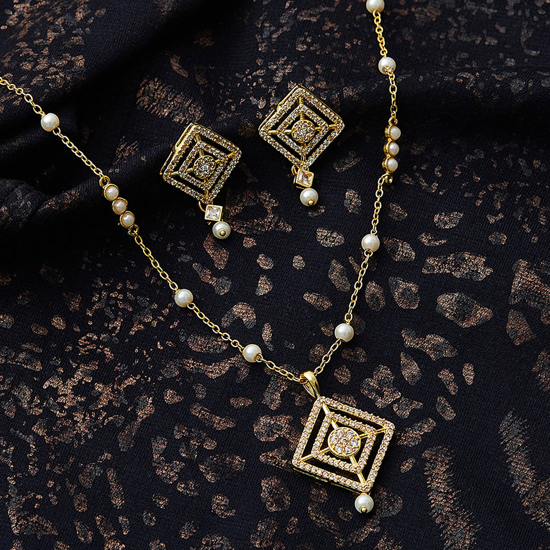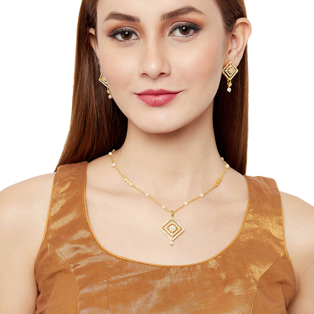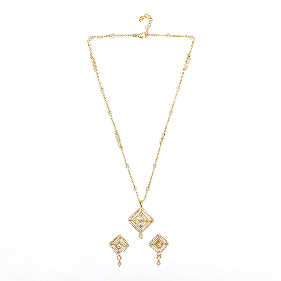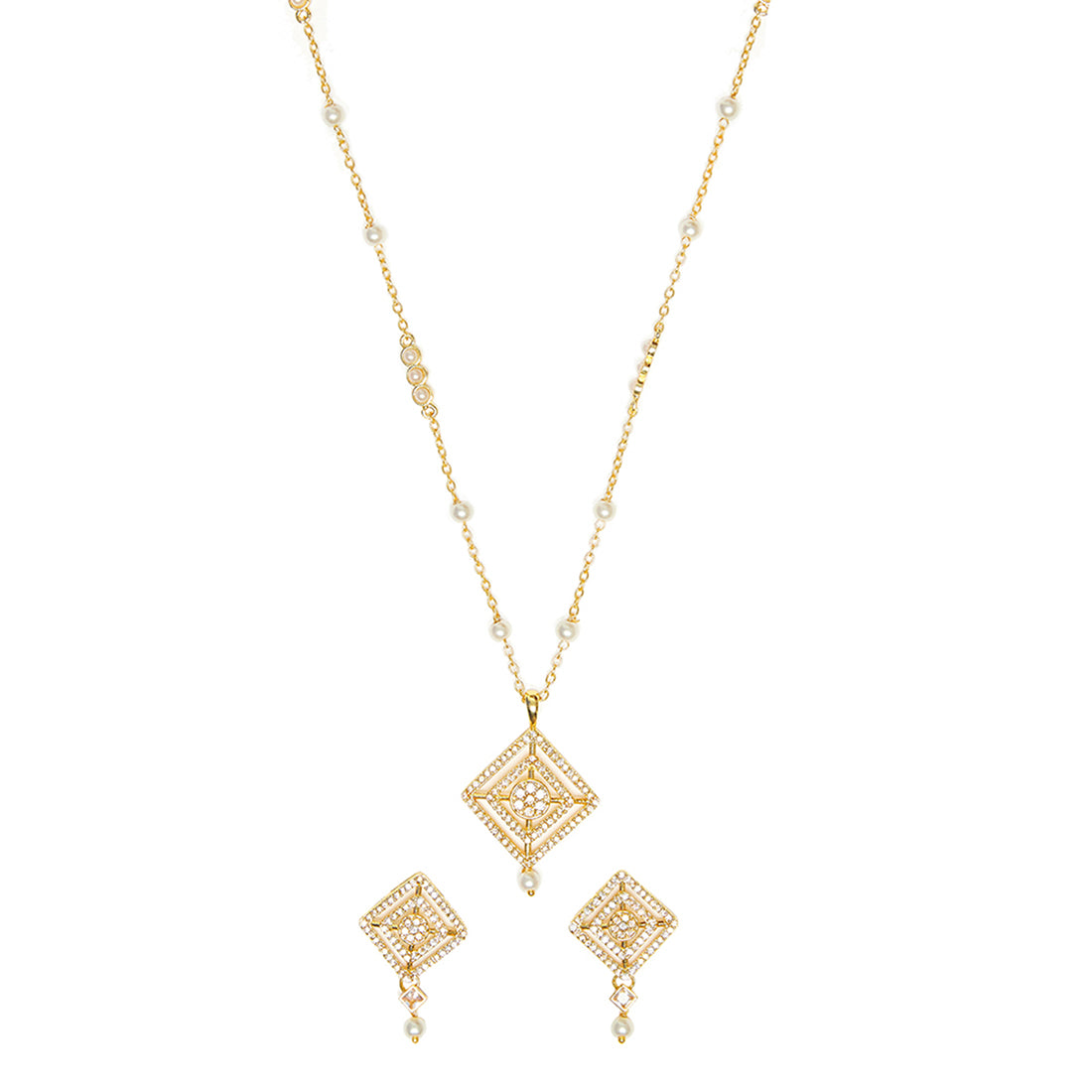 A wonderful jewelry item to notice, this pendant set is embellished with CZ sparkles and pearls. This elegant piece of adornment will definitely become your glamorous go-to party accessory.
