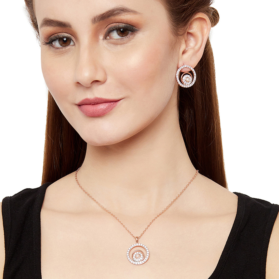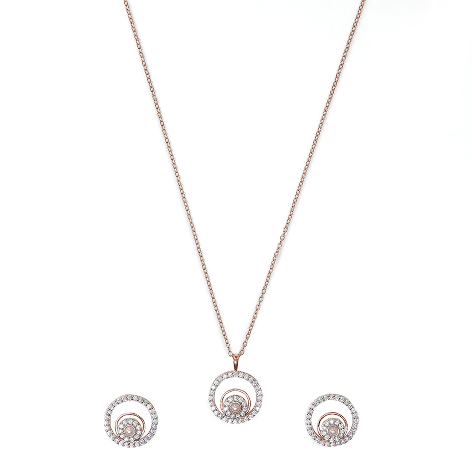This beautifully designed rose gold tone pendant set is good for any special party and function. The spiral shape and rose gold toned exterior have the kind of artistry which creates a great luster and provides you heavy party wear look.