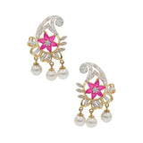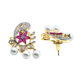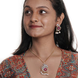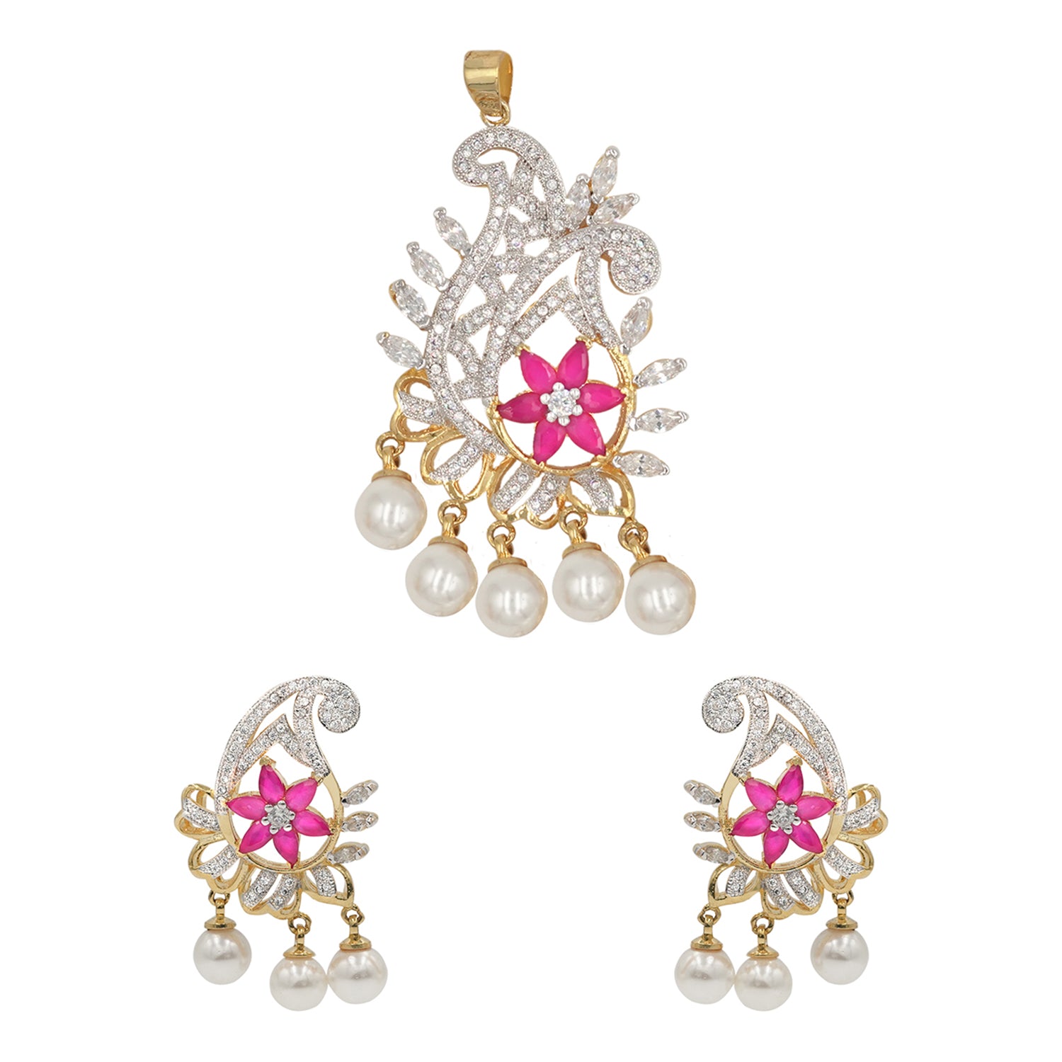 This is a stunning serene pendant and earring set made using high-quality brass. The gold plating blends in well with the pink American Diamond along with pearls and offers a vibrant and youthful appeal to your attire. If you want to look younger and flaunt your fashion sense, finding a classier piece can be very difficult.