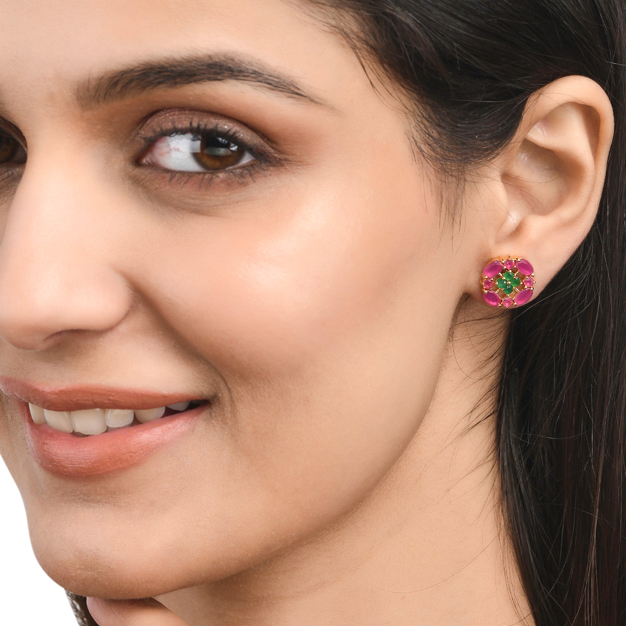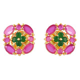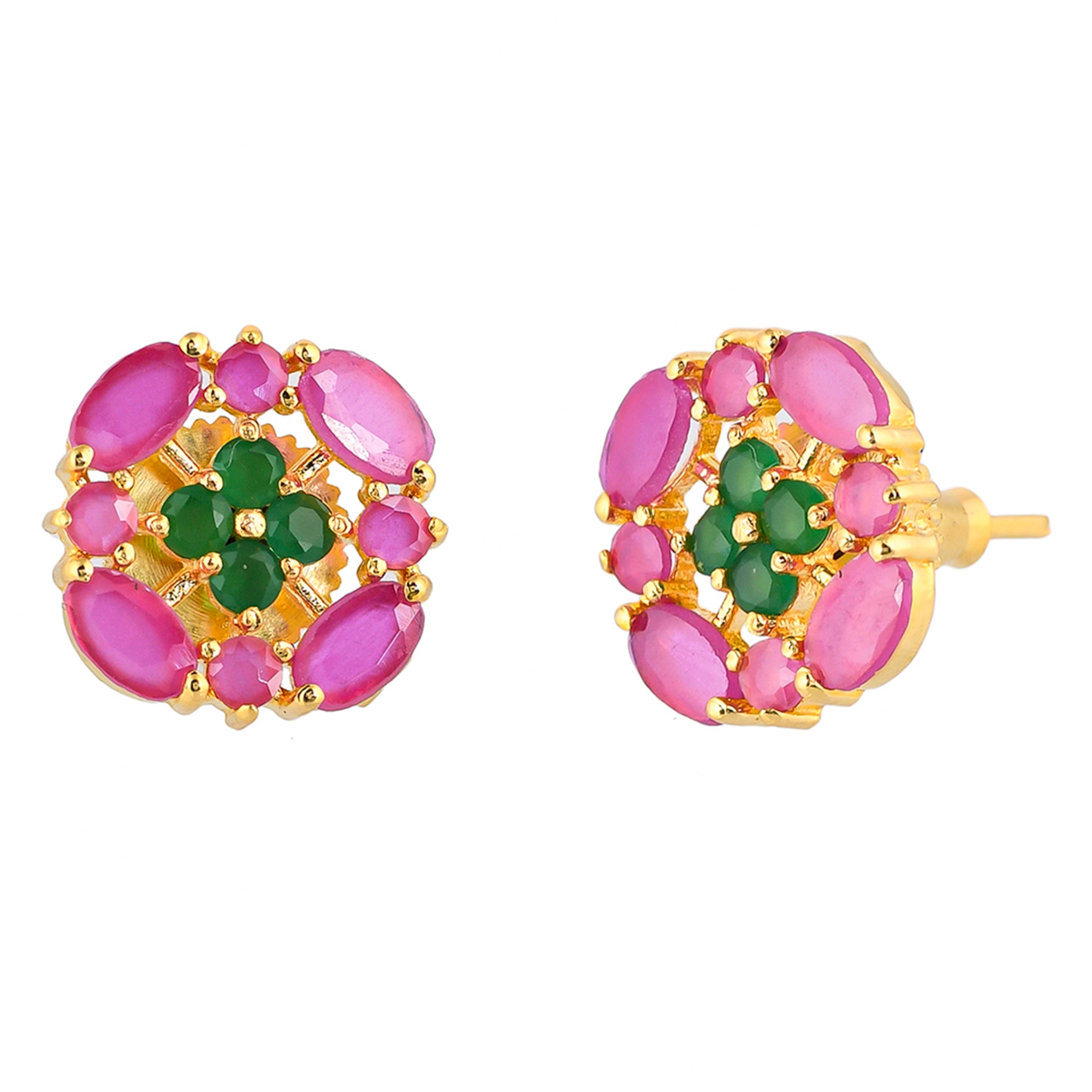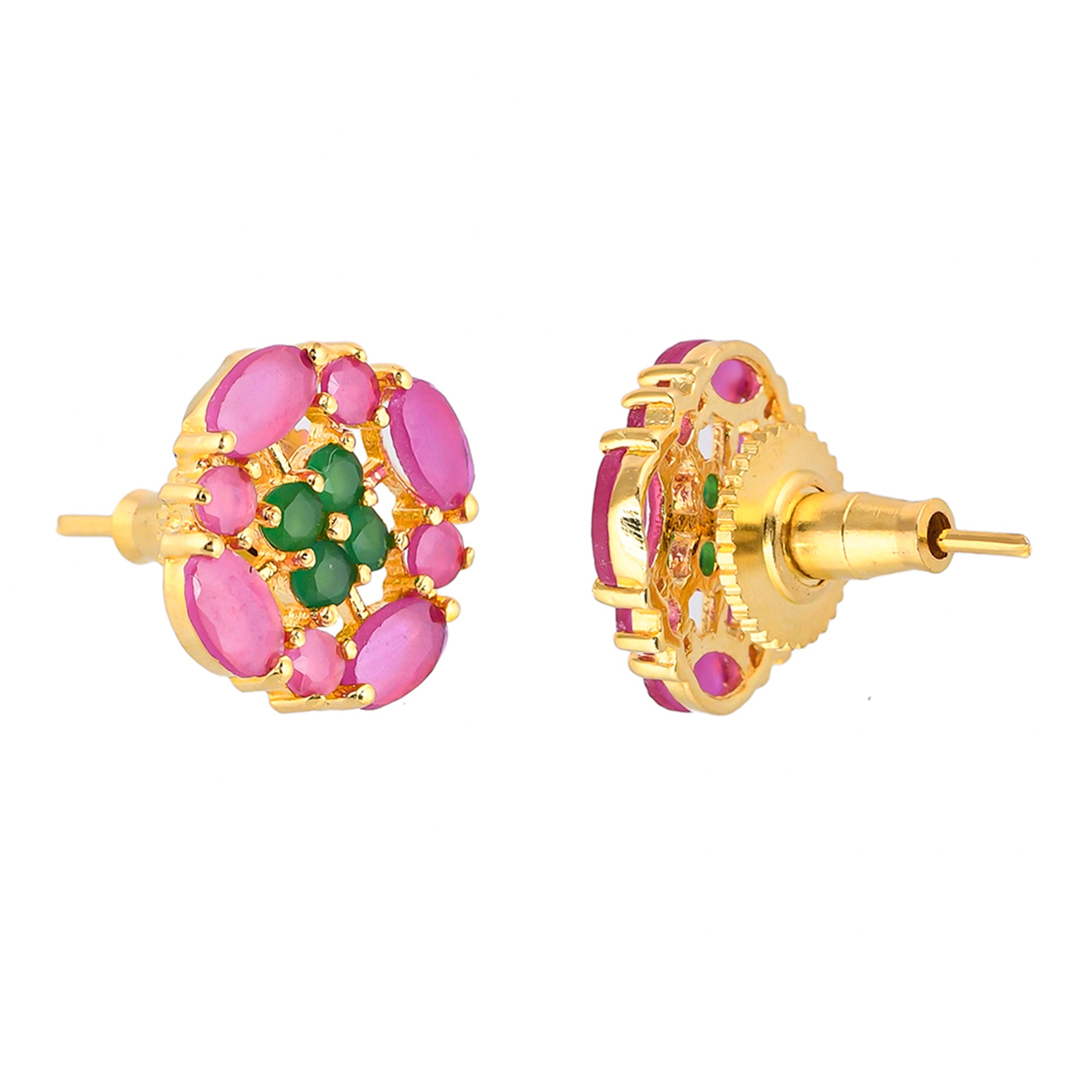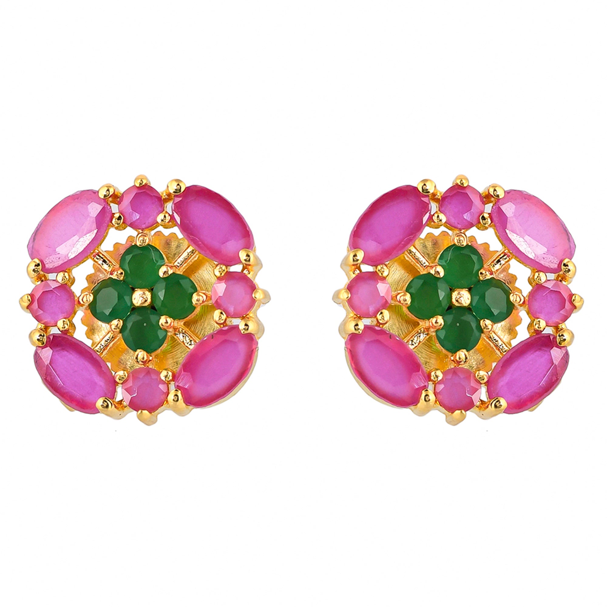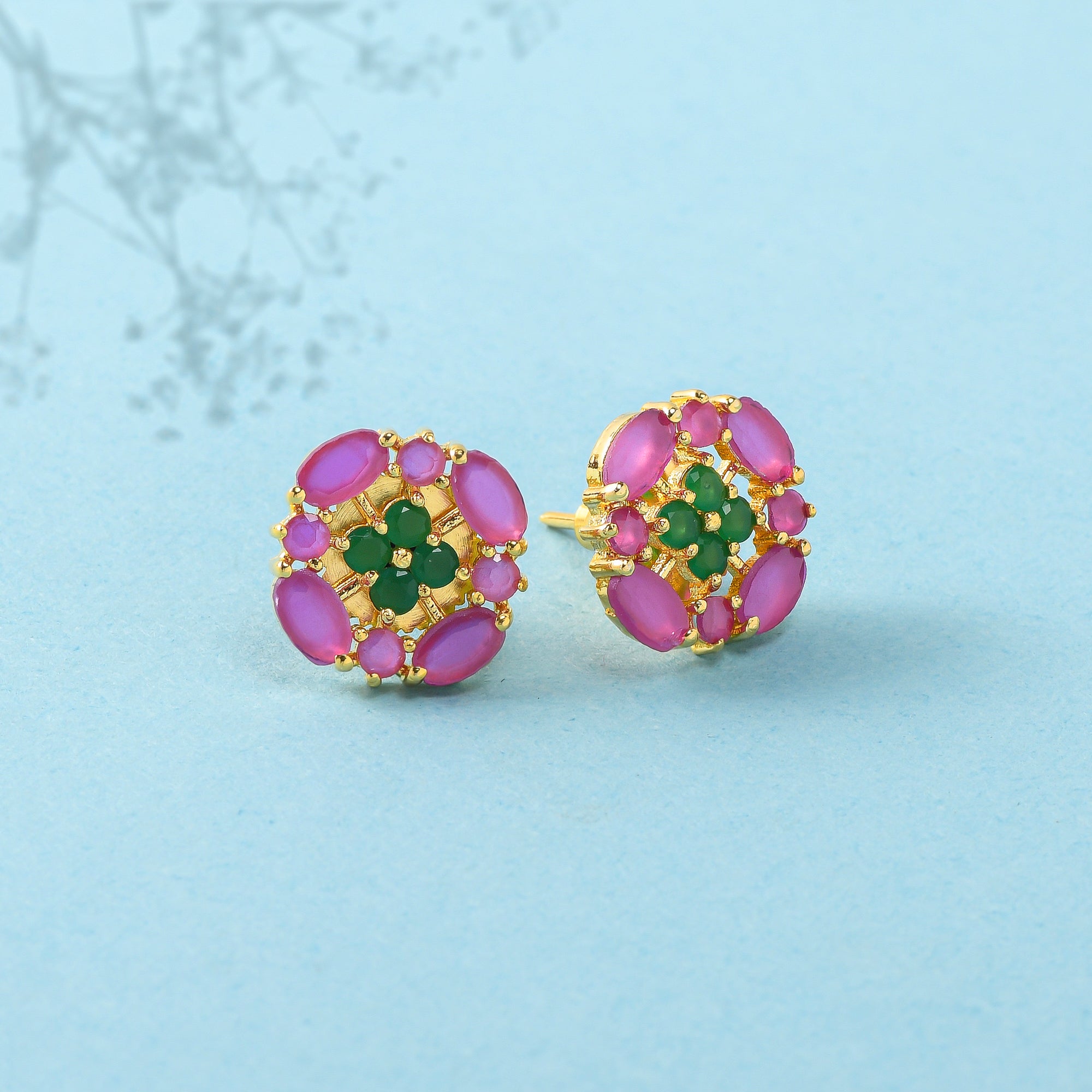 Gold plated stud earrings, made from brass and embellished with pink and green cluster setting CZ gemstones. Pair with casual attire.