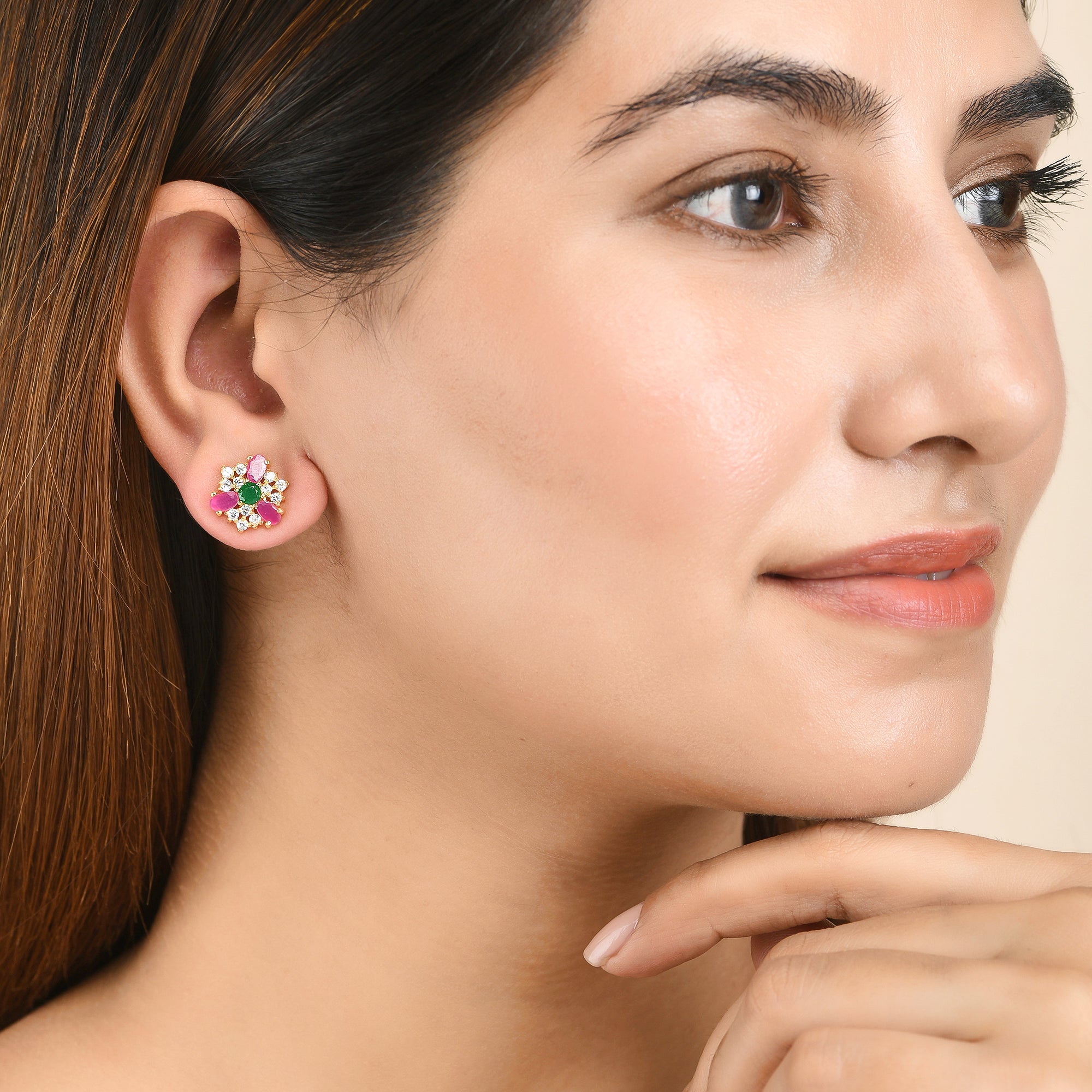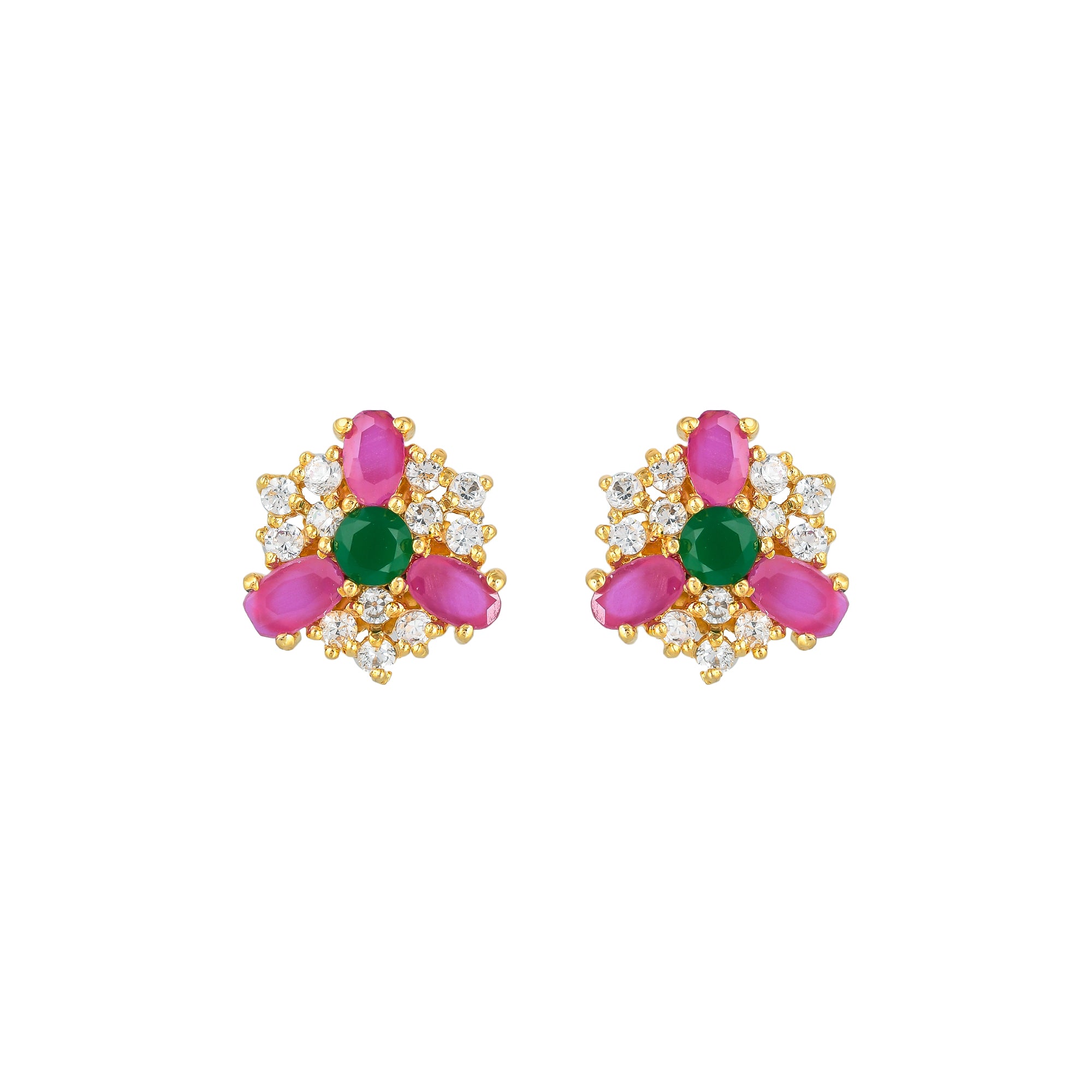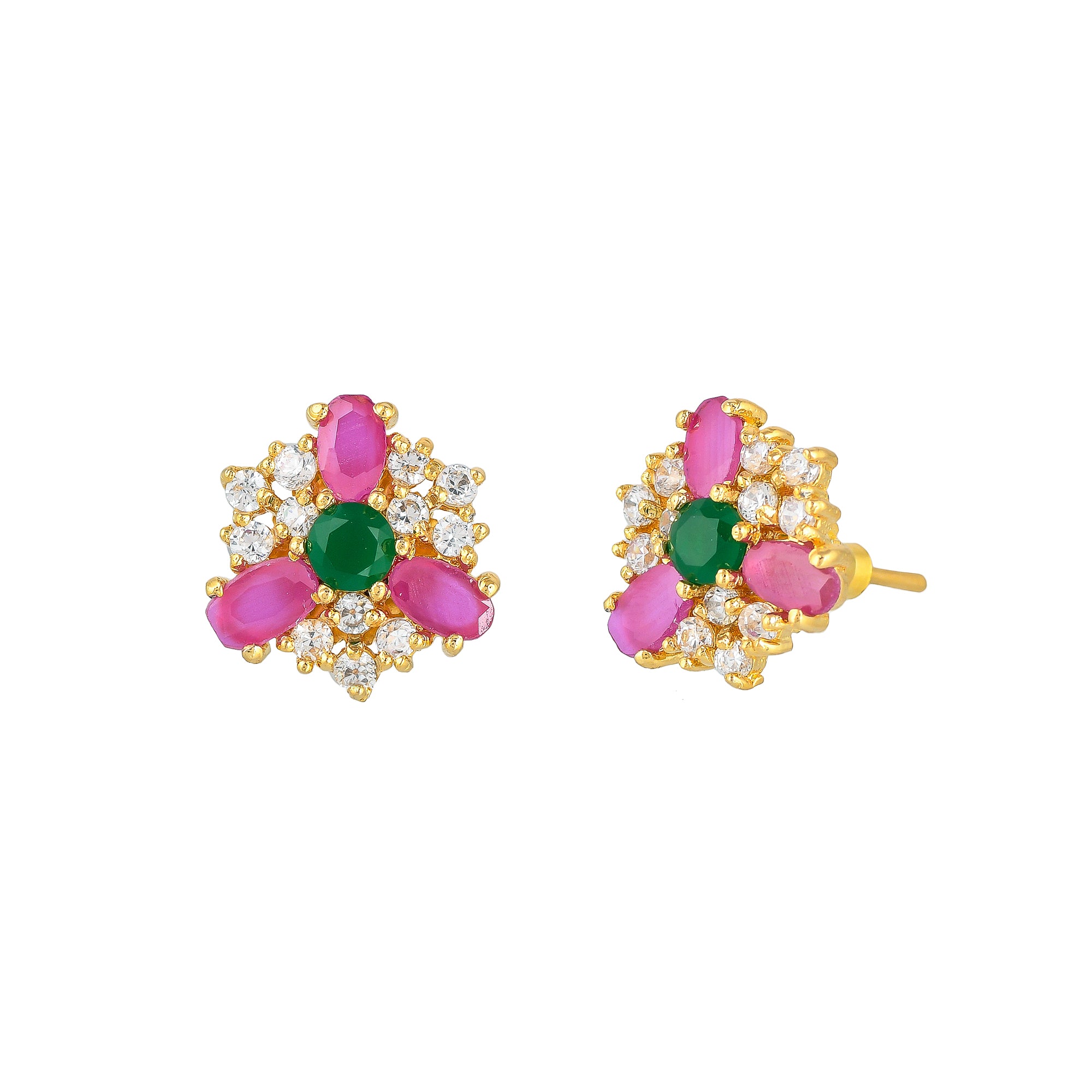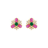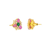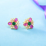 Adorned with pink, green and white round cut zirconia gems, these stud earrings have been fashioned out of brass. Gold plated, lightweight and versatile.