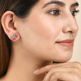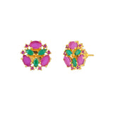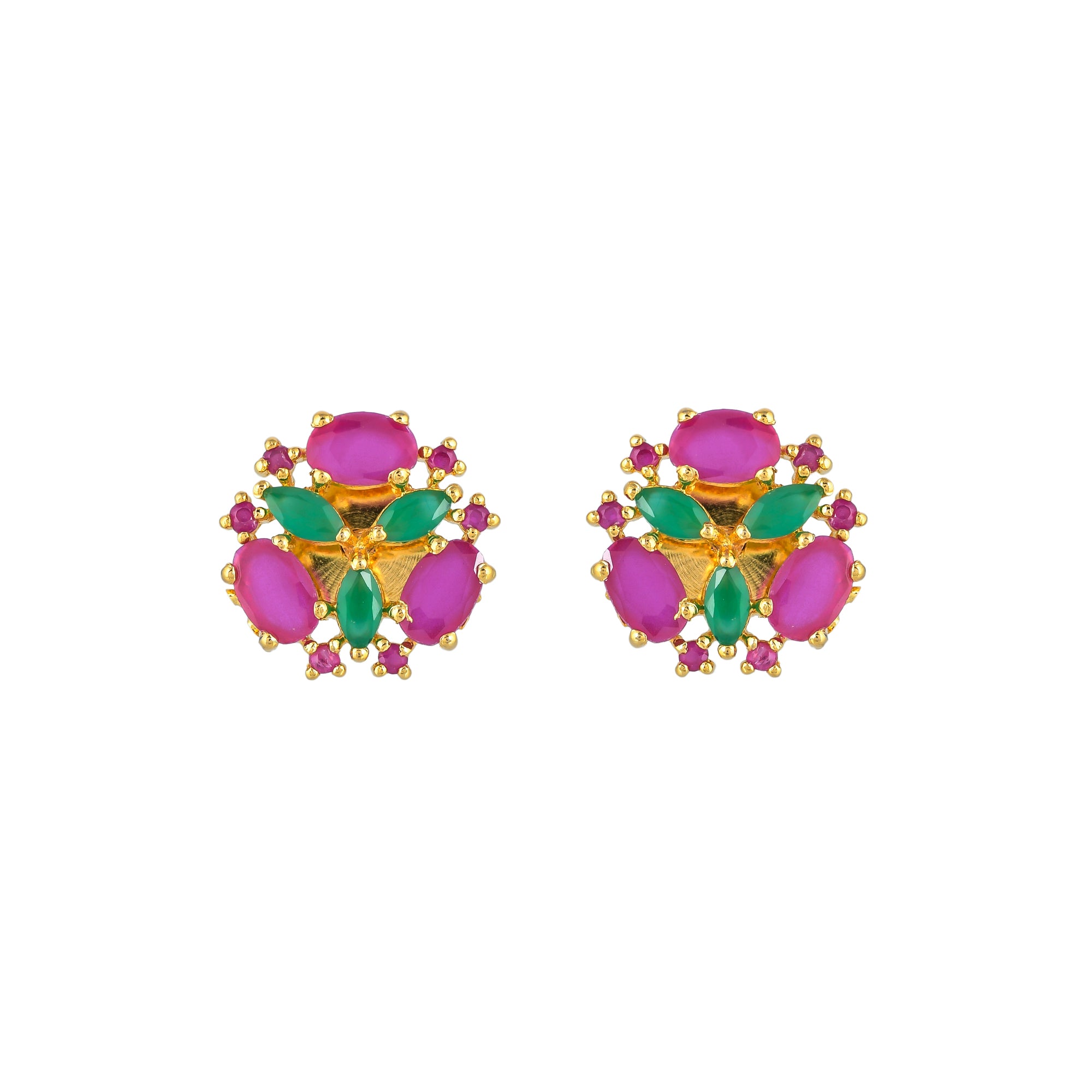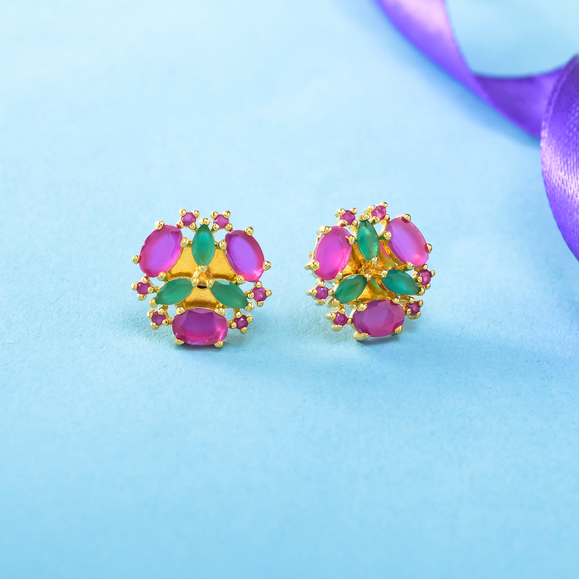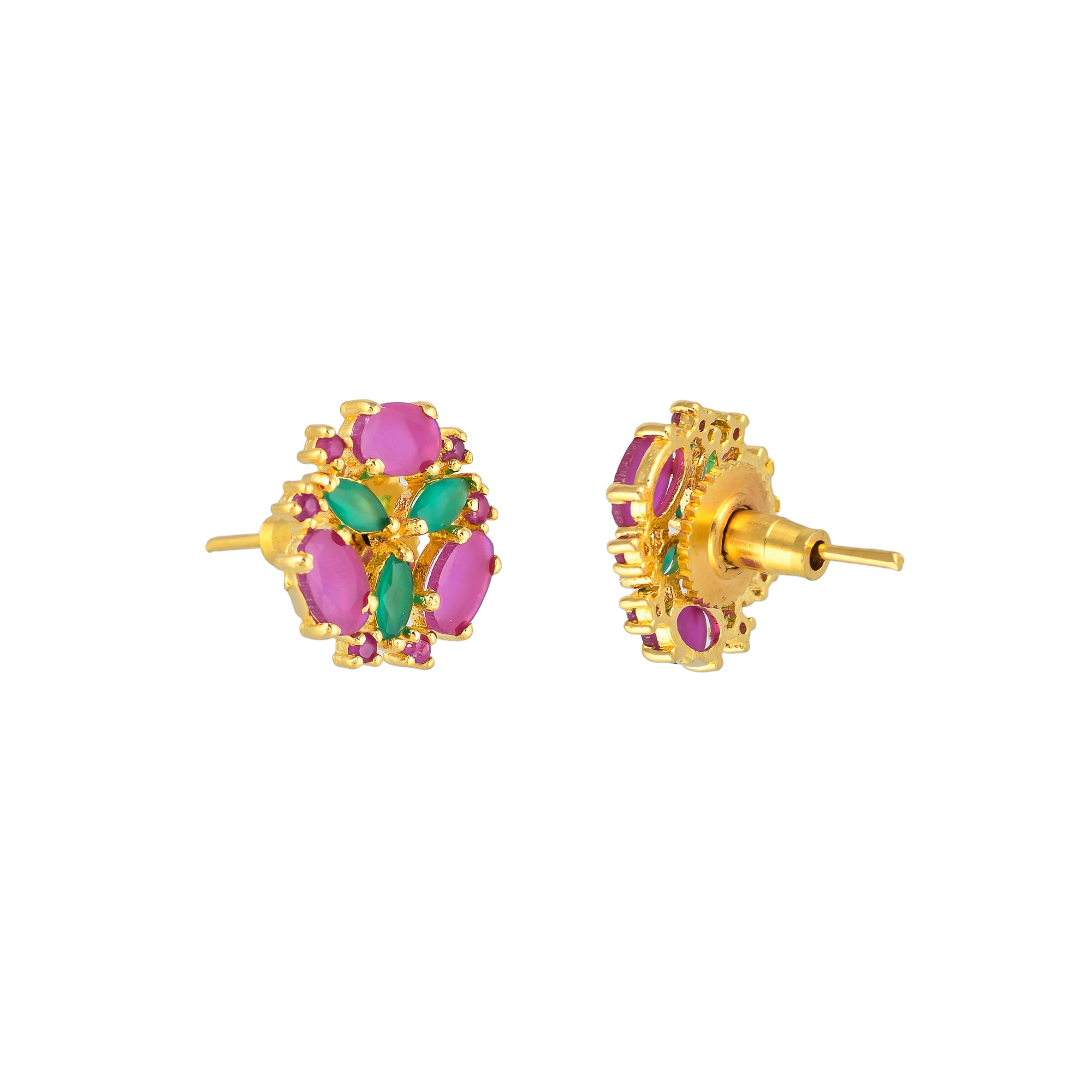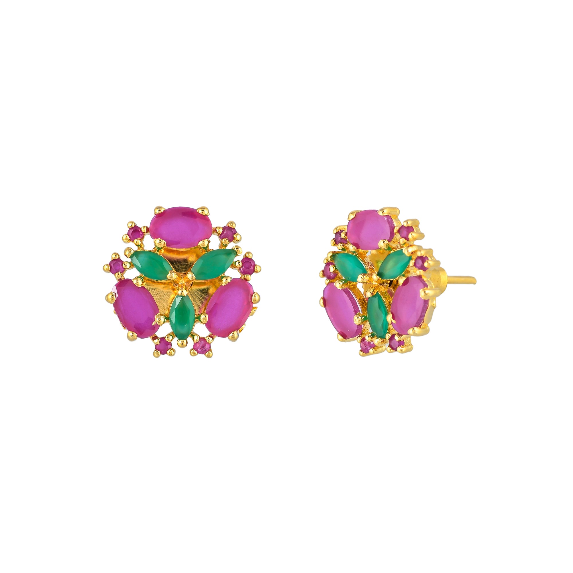 Yellow gold plated stud earrings with green and pink zirconia gemstones. Made from brass and perfect for all kinds of casual looks.