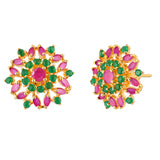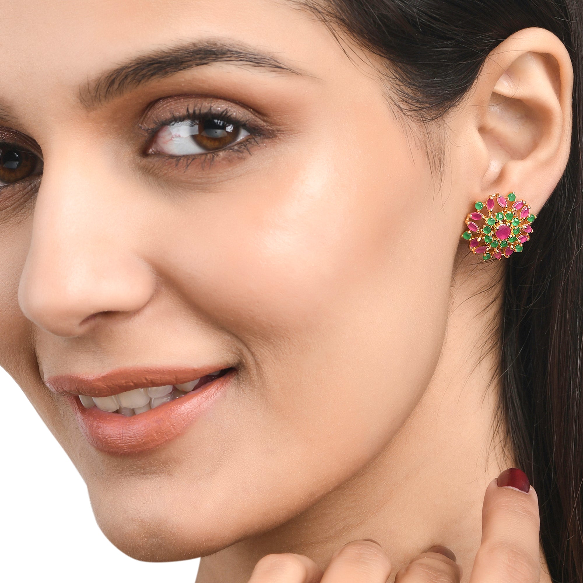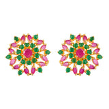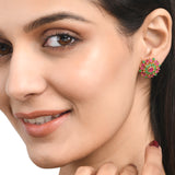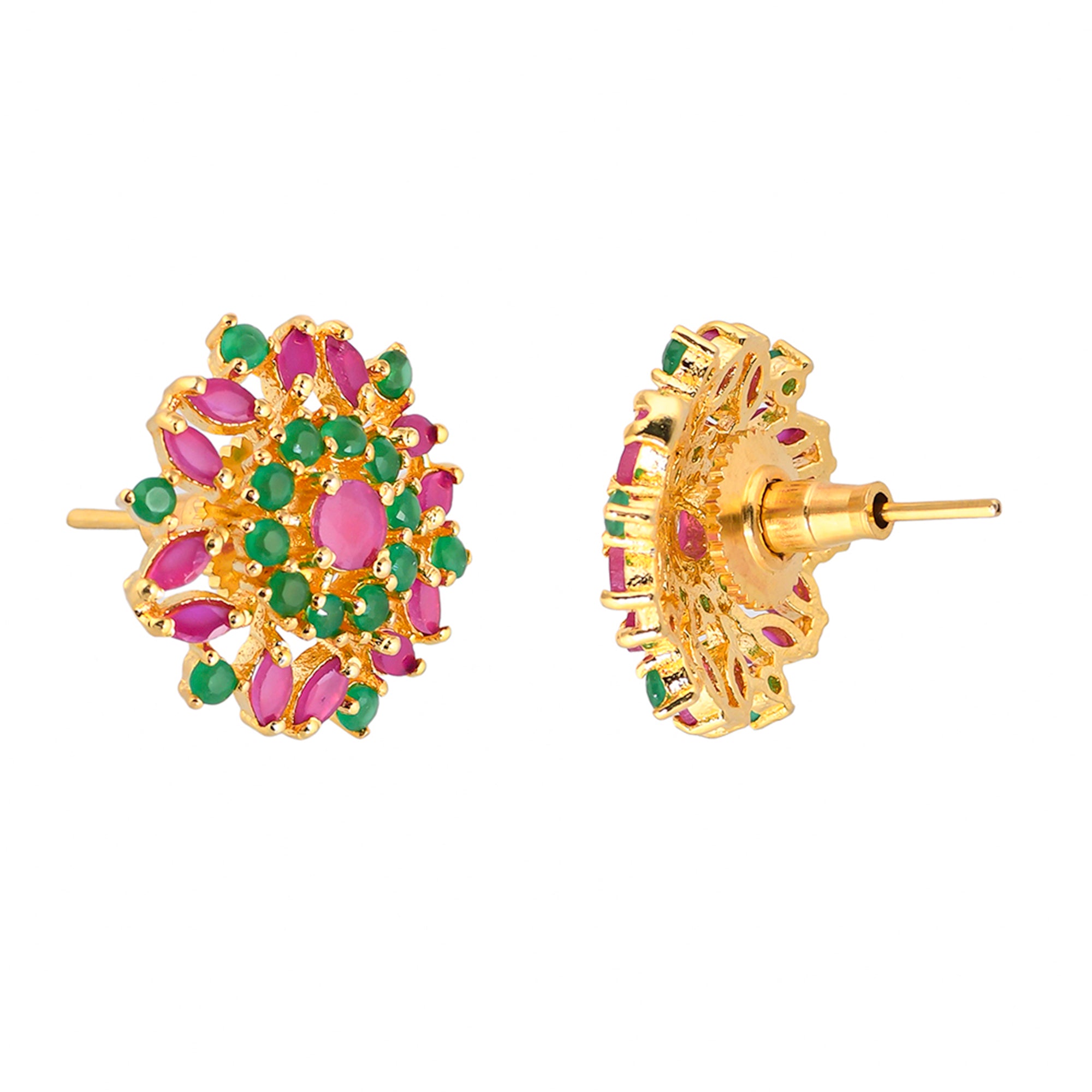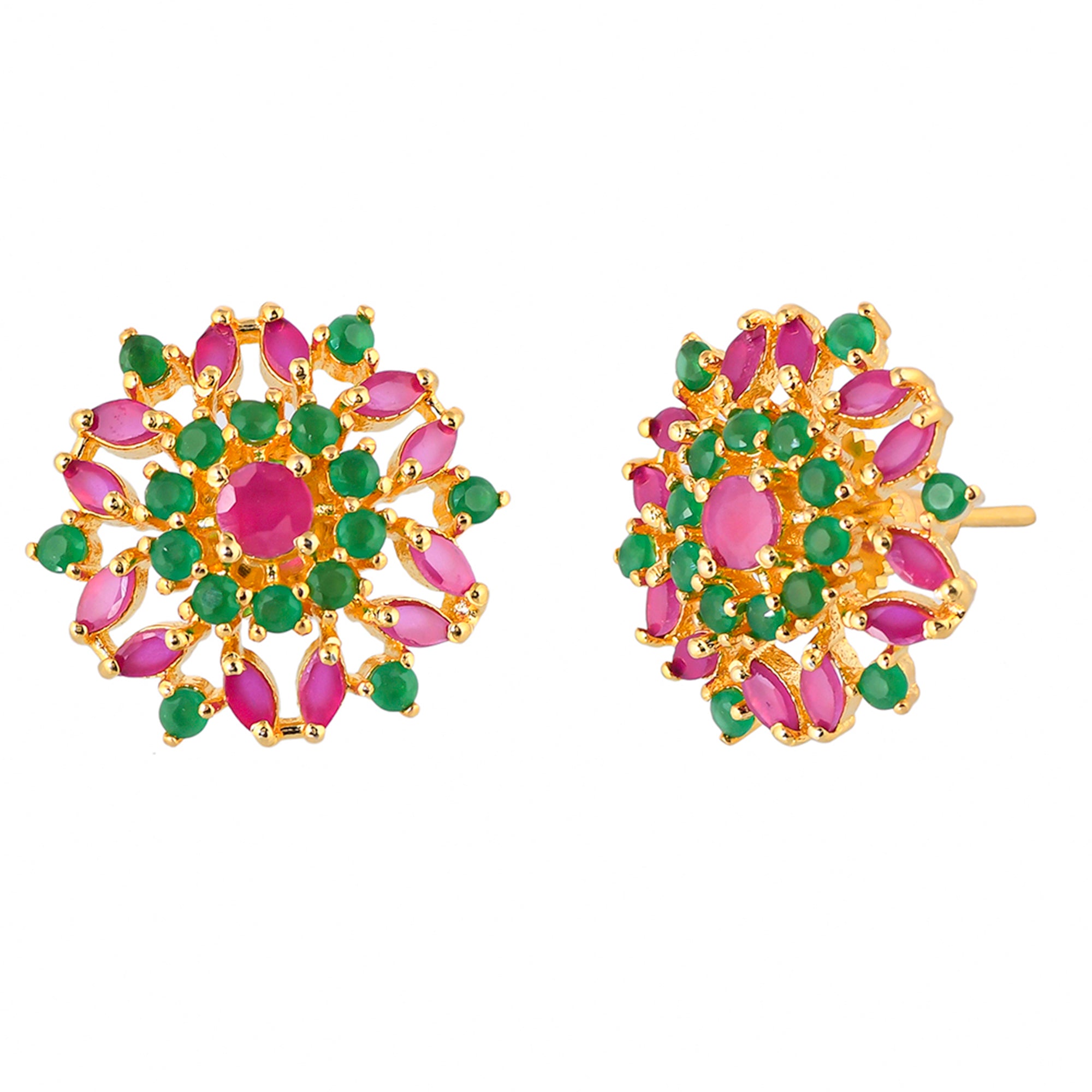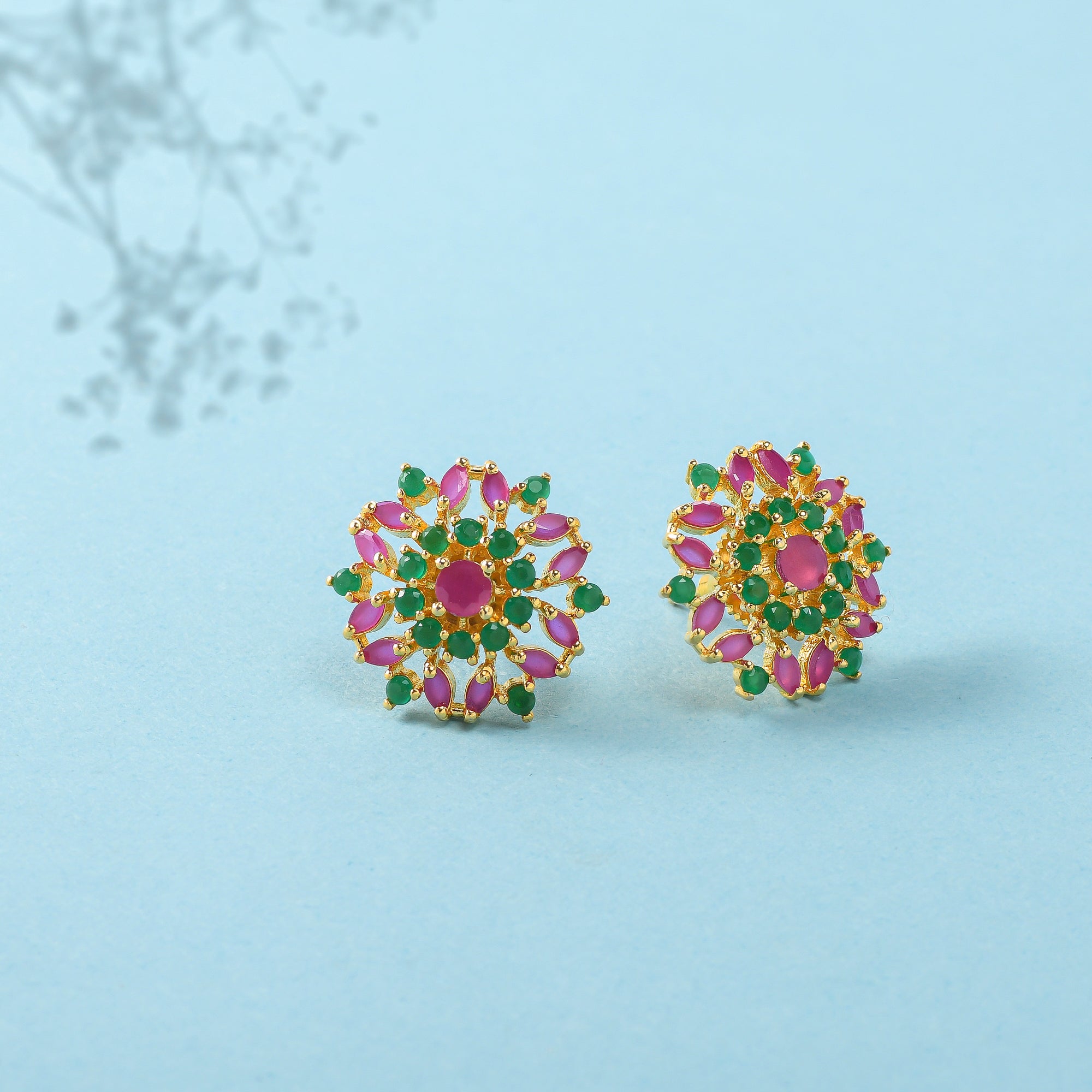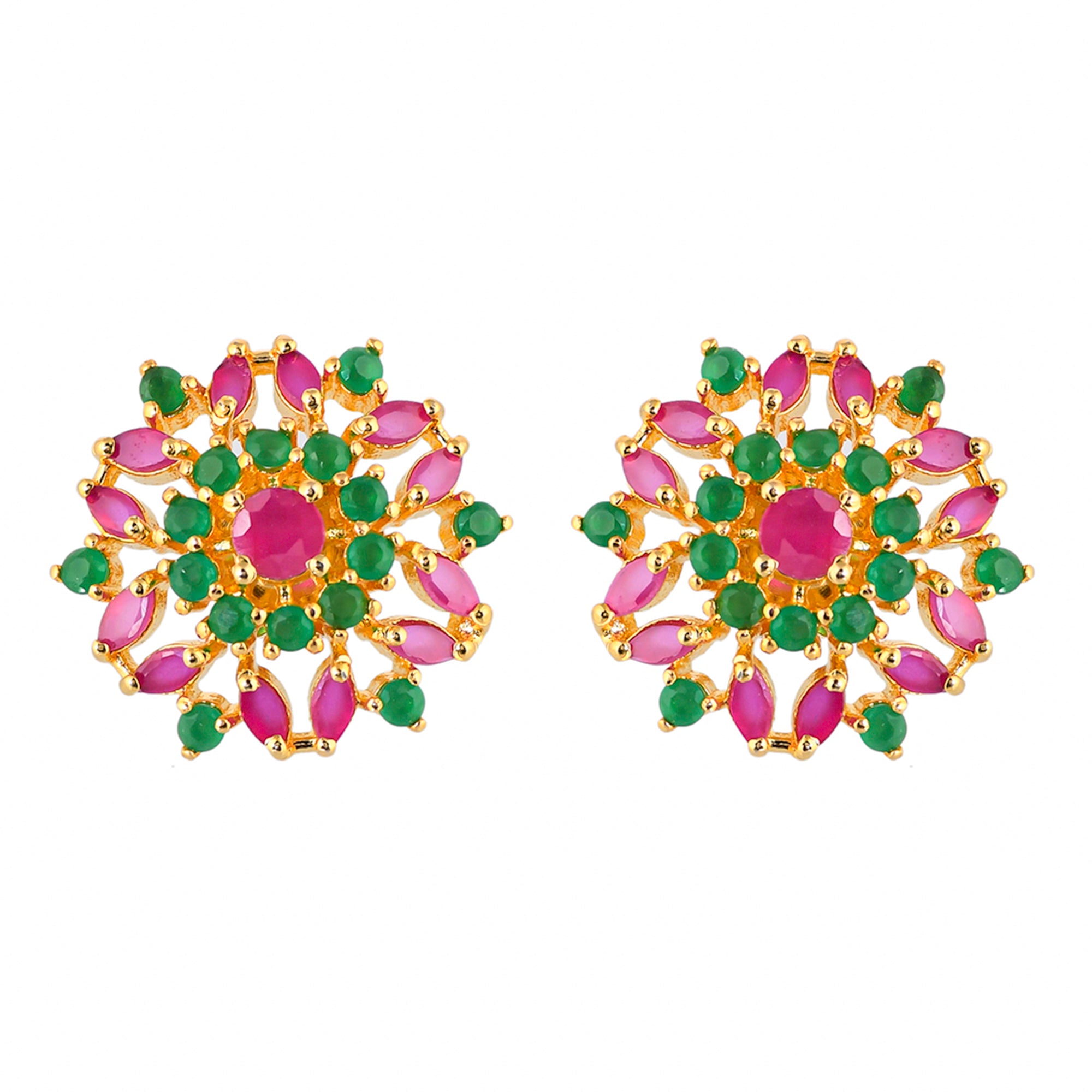 Pink and white round and marquise cut zircons adorned round stud earrings. Made from brass and gold plated. Pair with ethnic attire.